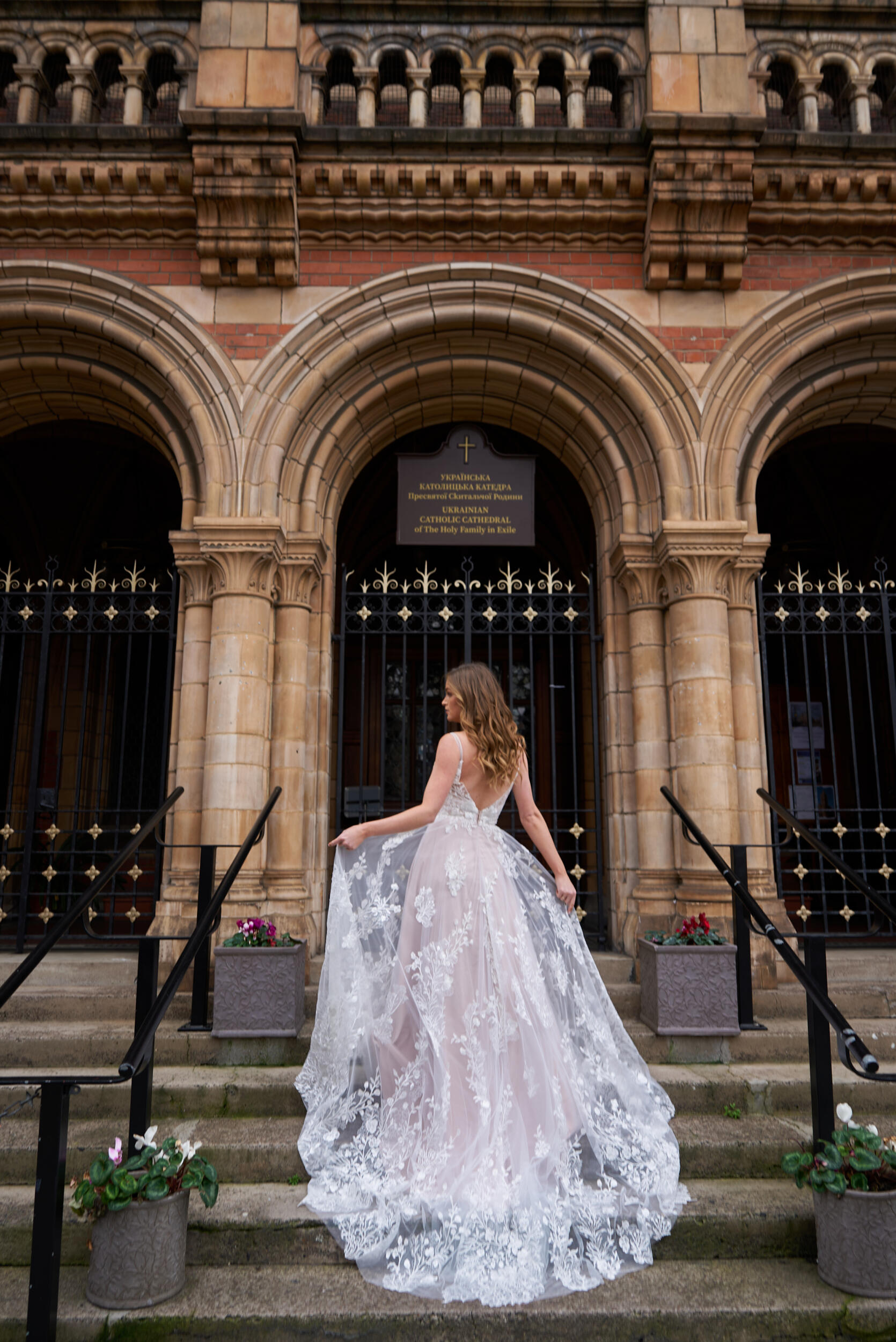 Her layers of diverse rich botanical embroidered lace appliques adorn the bodice and skirt and are highlighted with a scattering of delicate sequin embellishments.