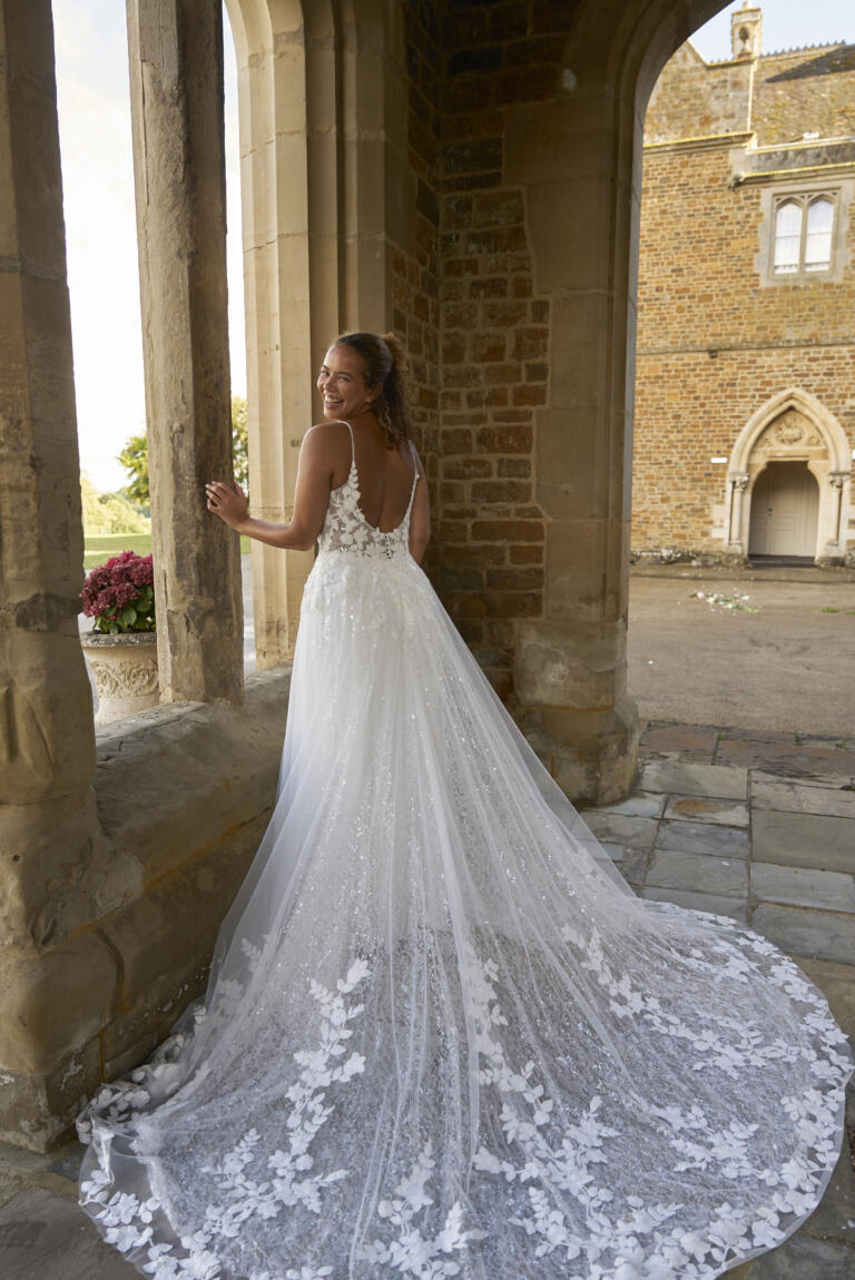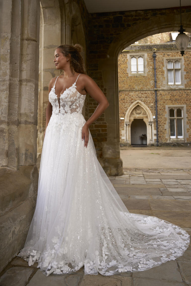Our stunning and popular illusion V neck bodice with plunge neckline makes her a stand out wedding gown.