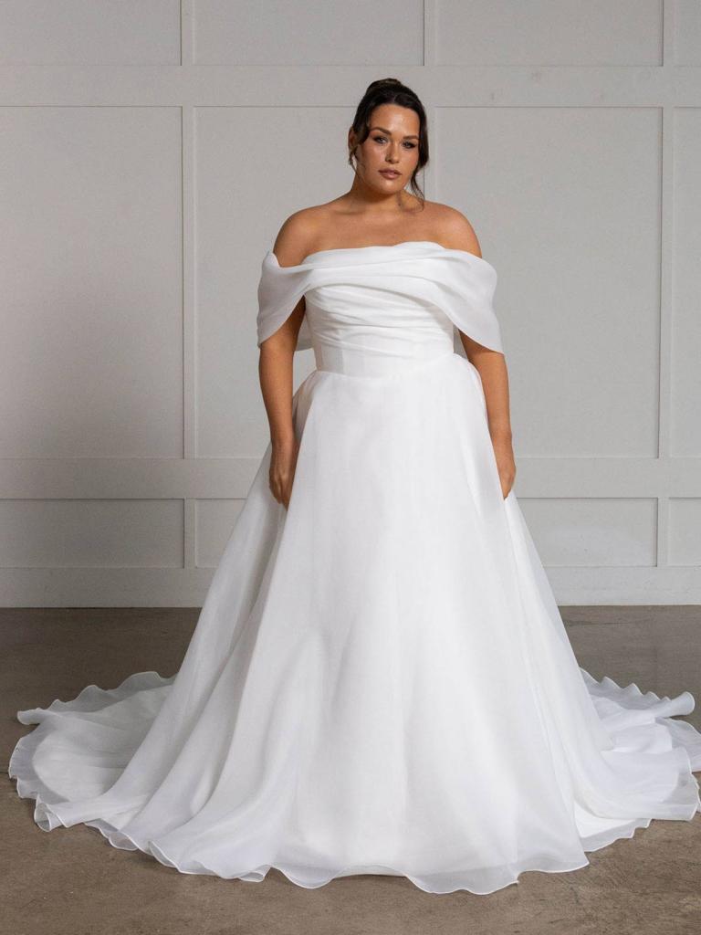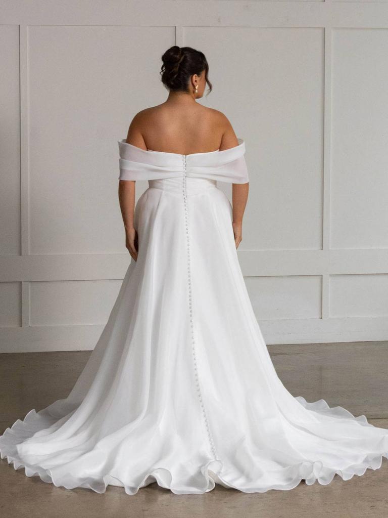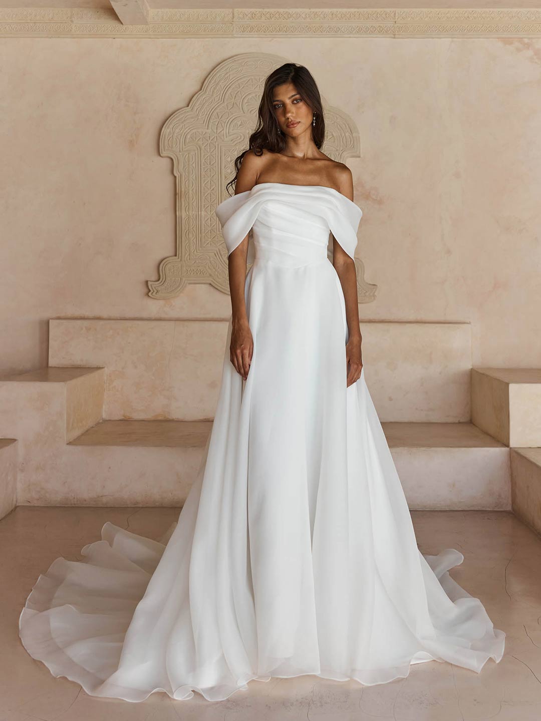 Matching the softness of the fabric is the equally soft off-the-shoulder neckline featuring a draped organza cuff giving the most delicate texture.