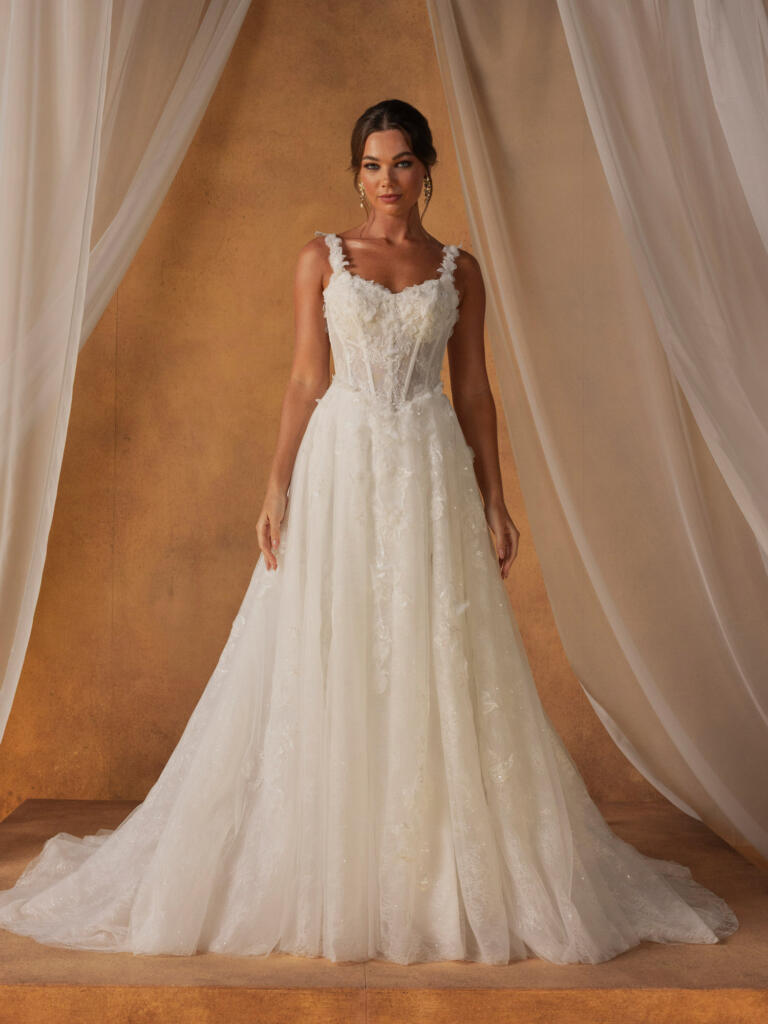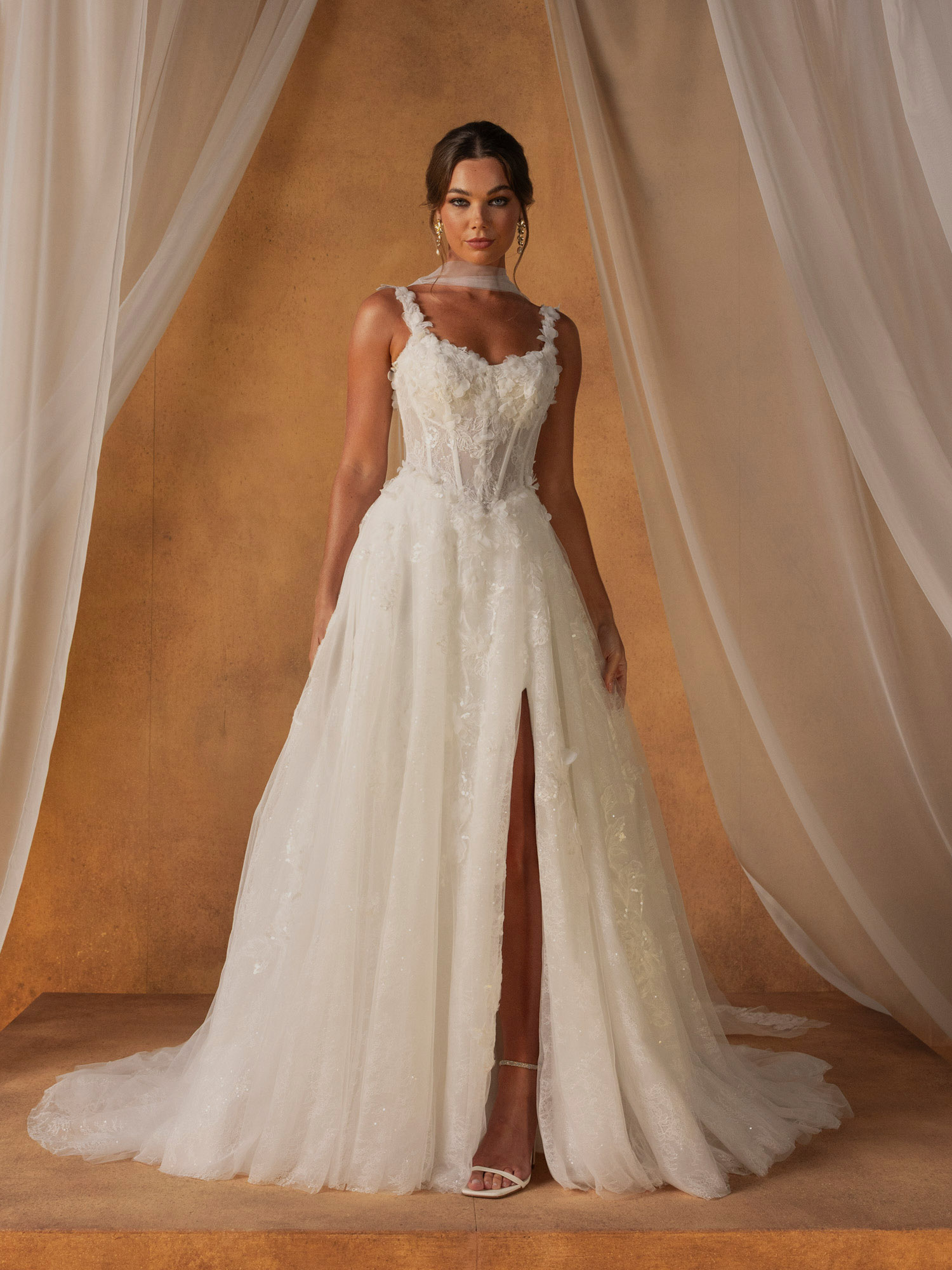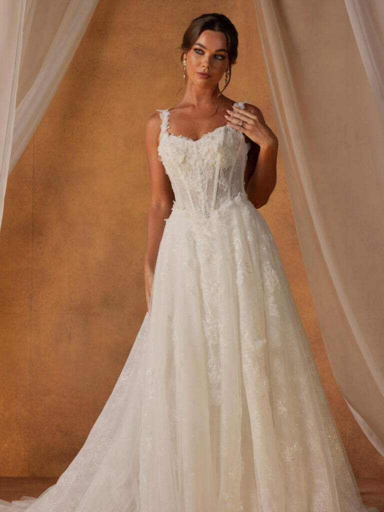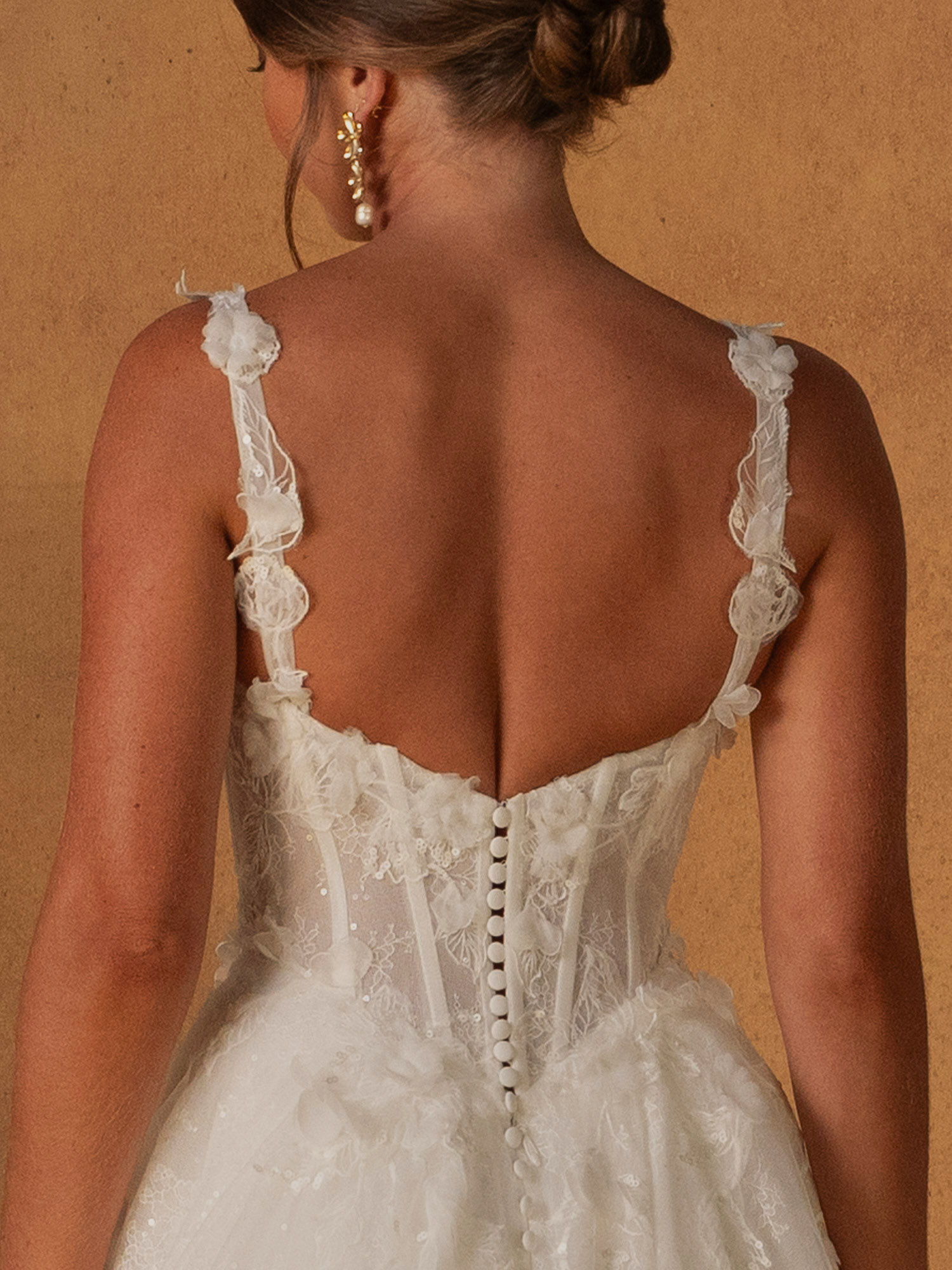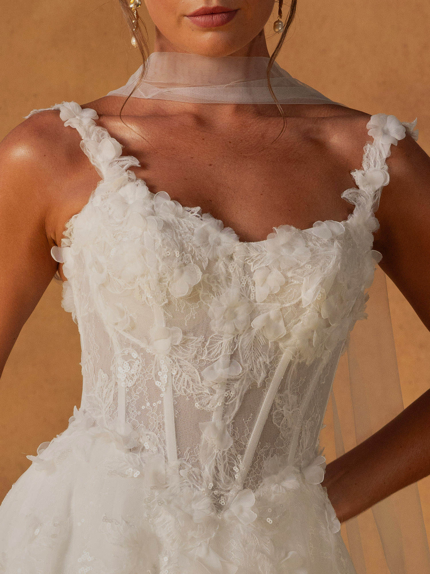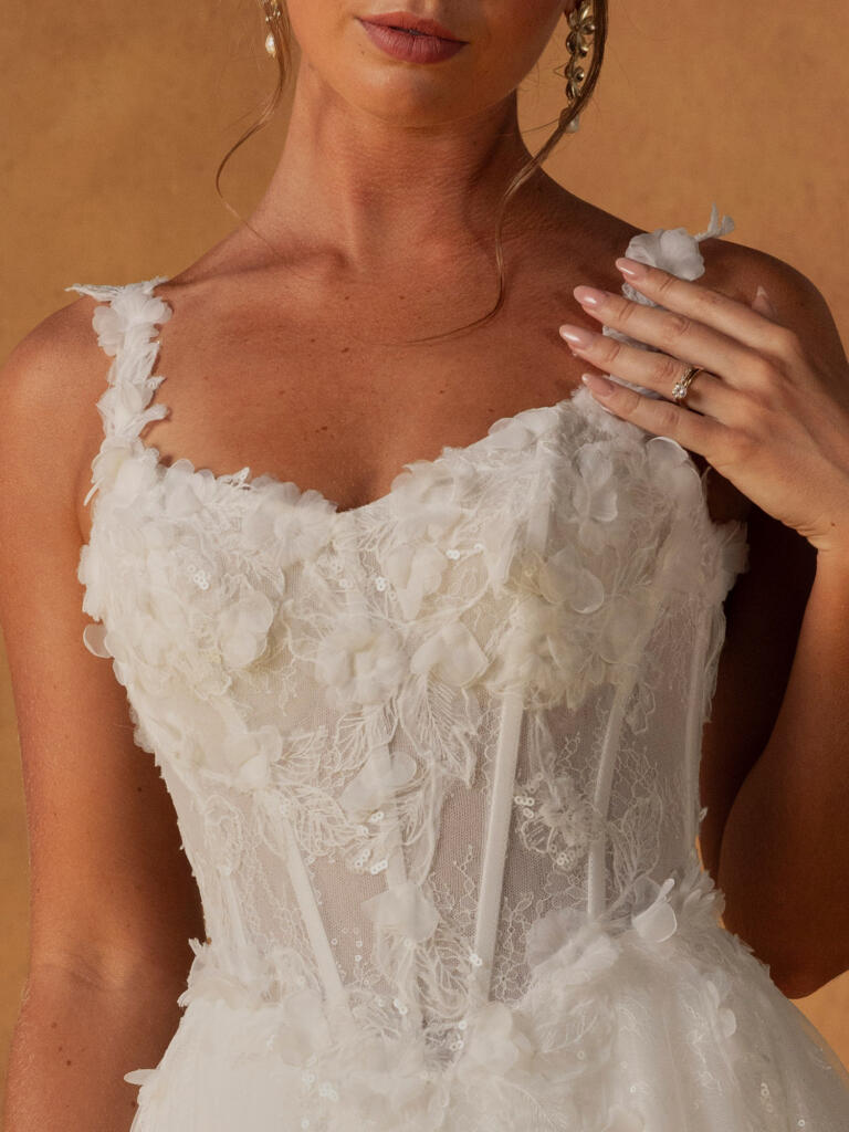 A slight sweetheart neckline tops a corset-style bodice, embroidered with sequins and layered 3D floral motifs. Exposed boning beneath lace adds subtle structure while maintaining softness and flattering the figure.