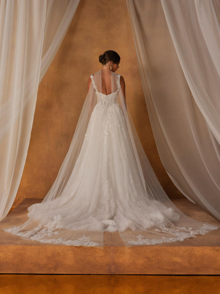Included and also sold separately, the Nadine tulle scarf offers versatile styling, finished with matching lace trim. Together, gown and scarf create a cohesive, timeless look that balances modernity with ethereal romance.