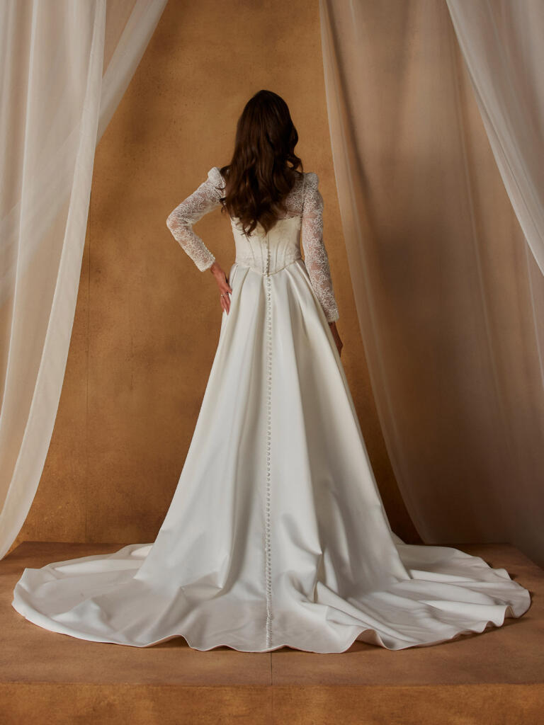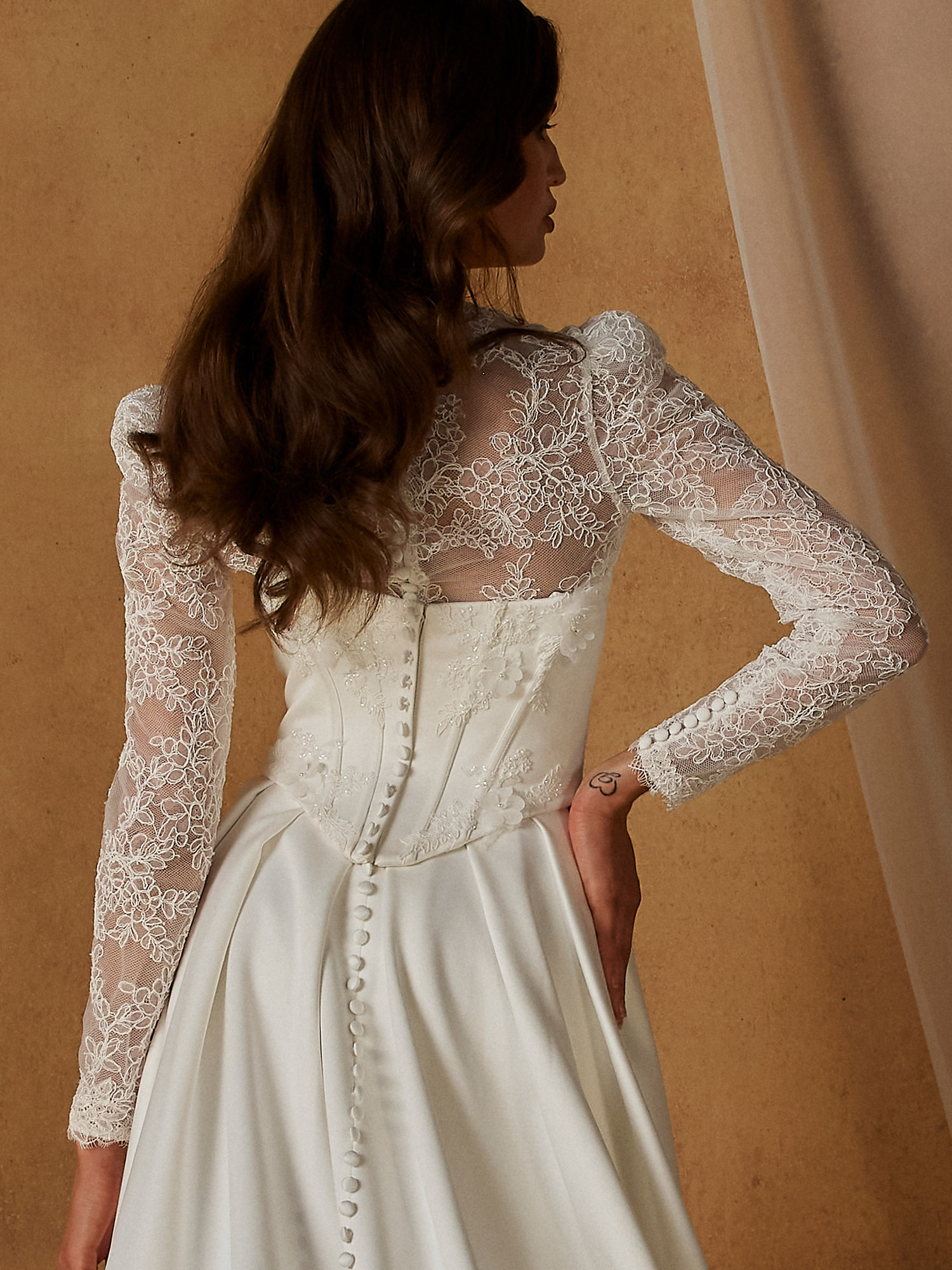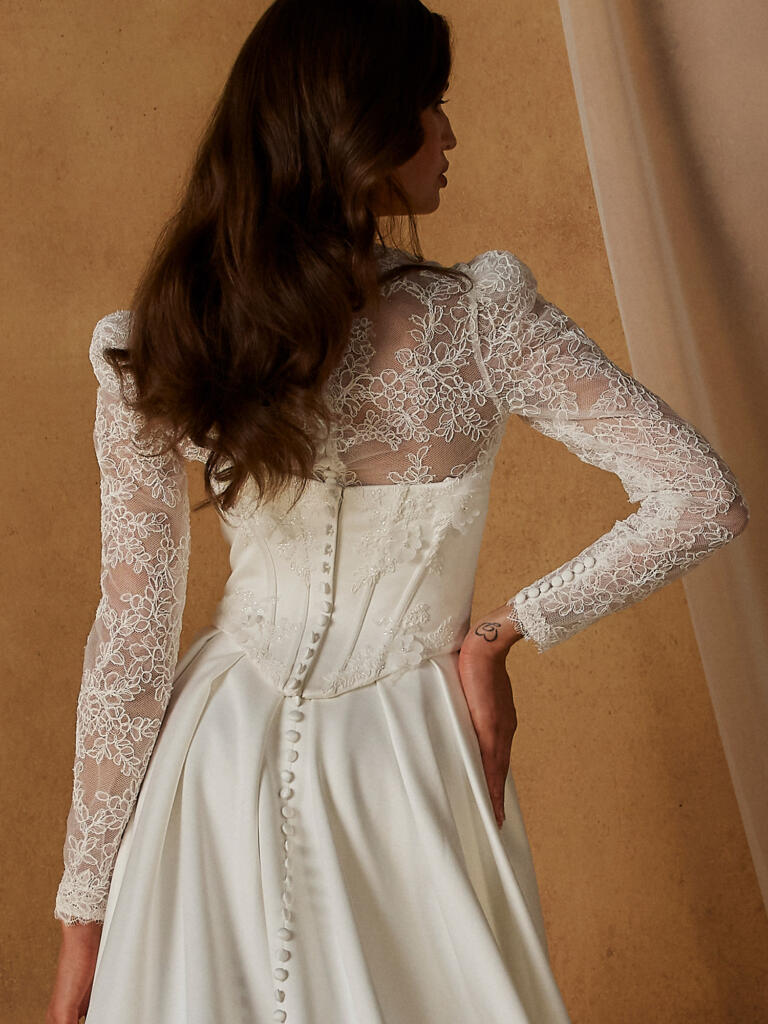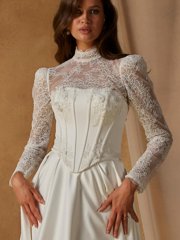 Lucia long sleeve 3d floral motif exposed boning a-line wedding front of gown