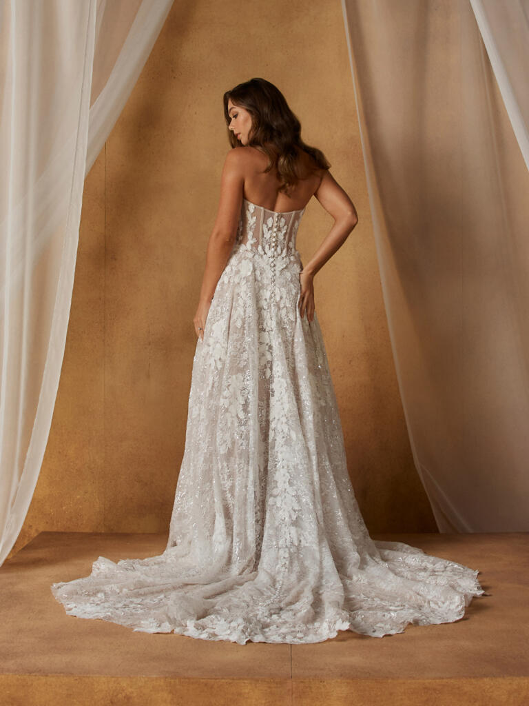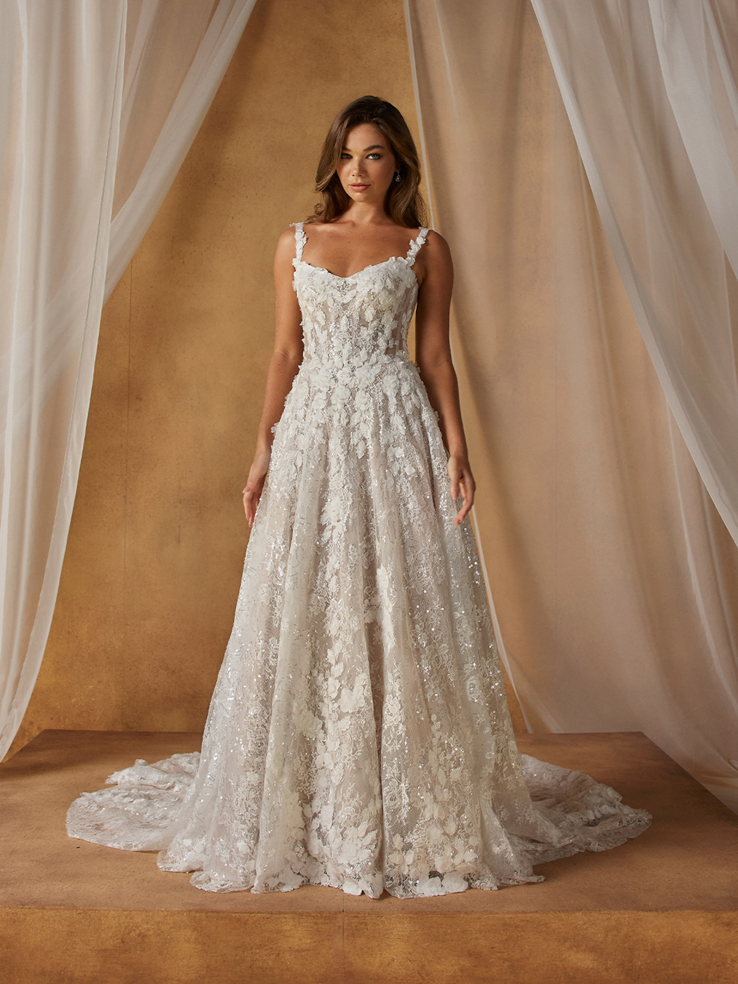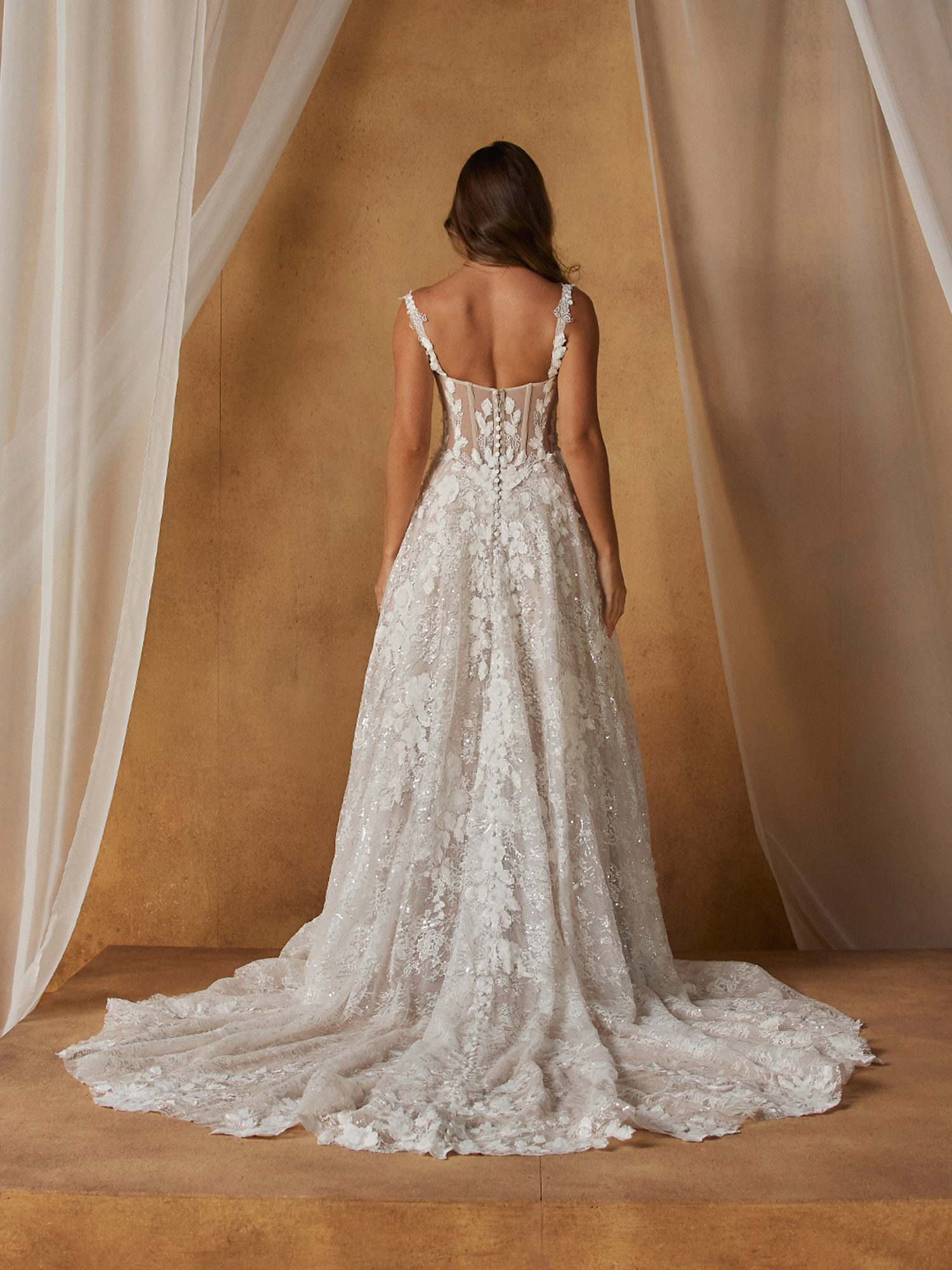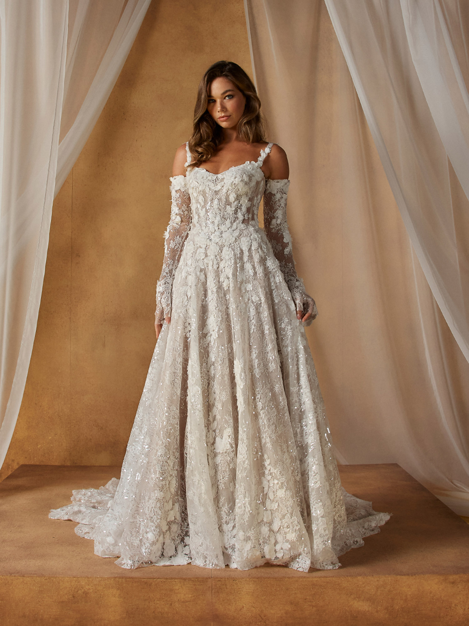 The skirt layers sequins and Chantilly lace, balancing 3D motifs that continue throughout and pool around the hemline. Ethereal shimmer runs across the wedding dress, adding dimension and catching light with every movement.