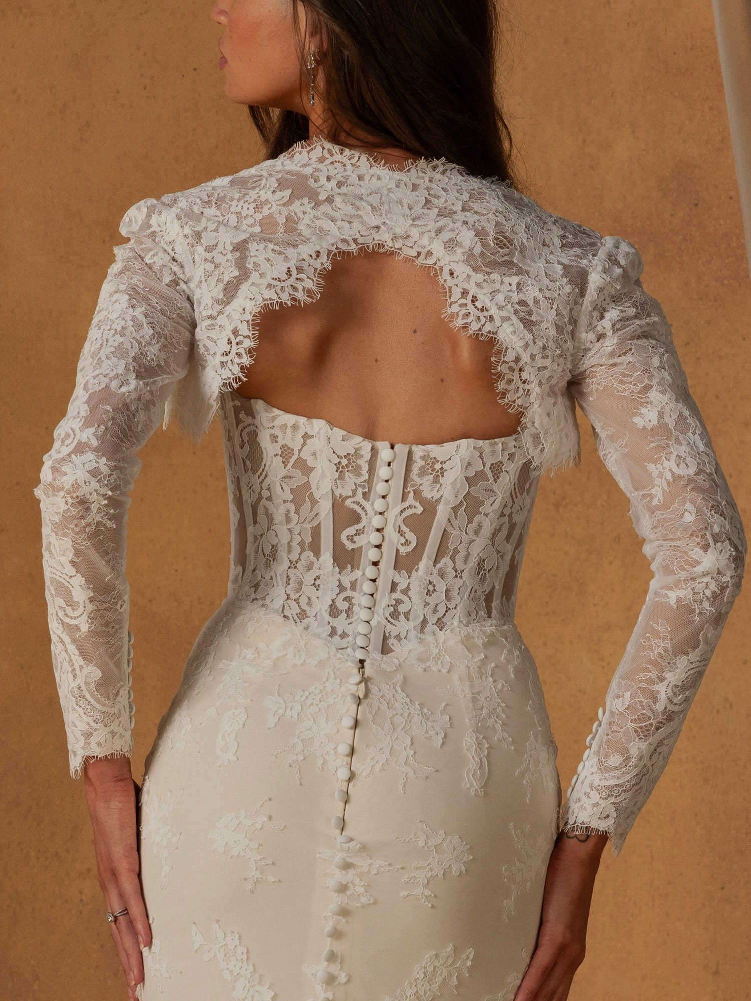 Designed in a bolero style with long, sheer sleeves, it adds a graceful layer of texture and refinement. This traditional-inspired piece perfectly complements our Napier wedding dress, enhancing its lace artistry and vintage charm.