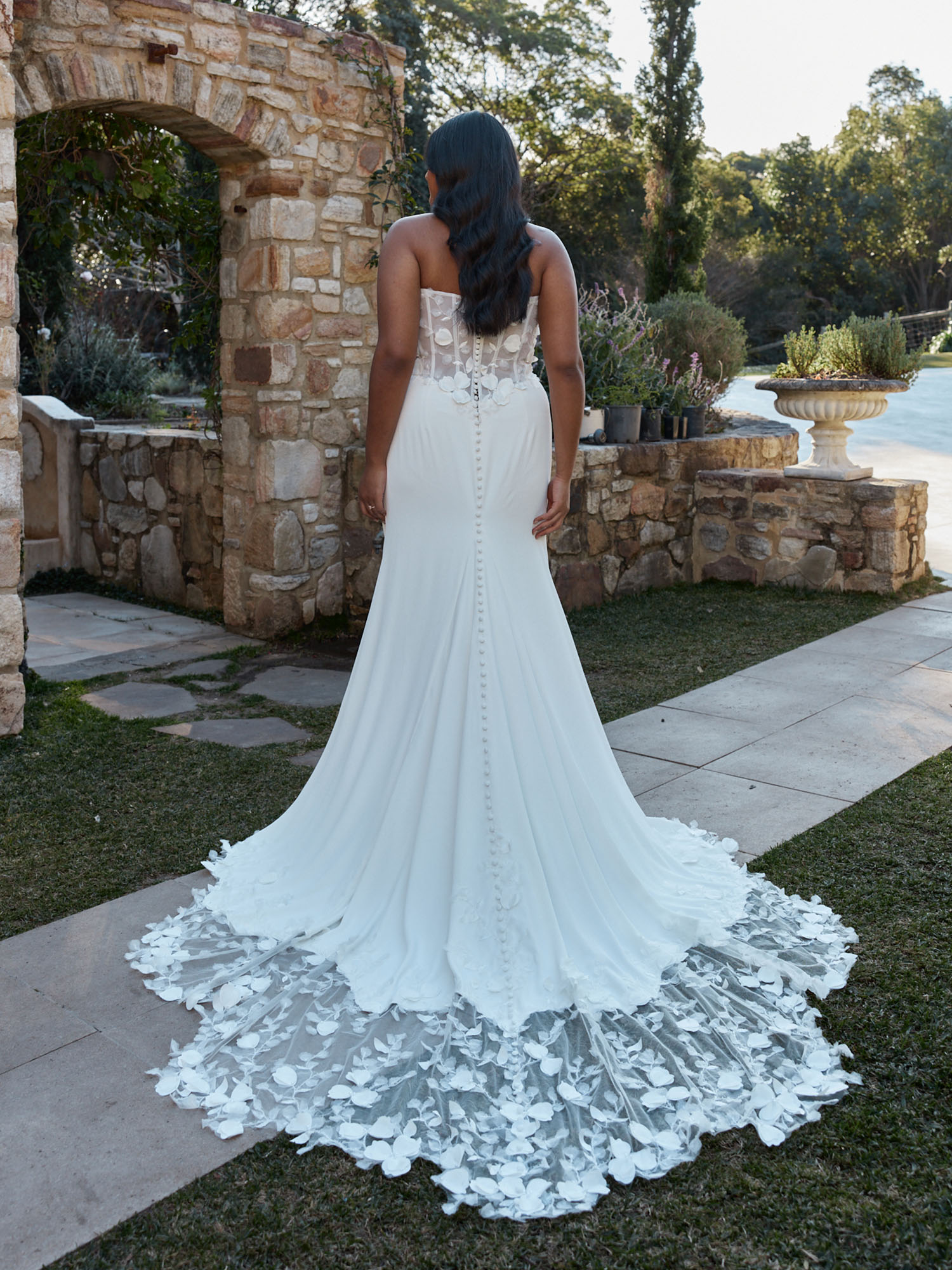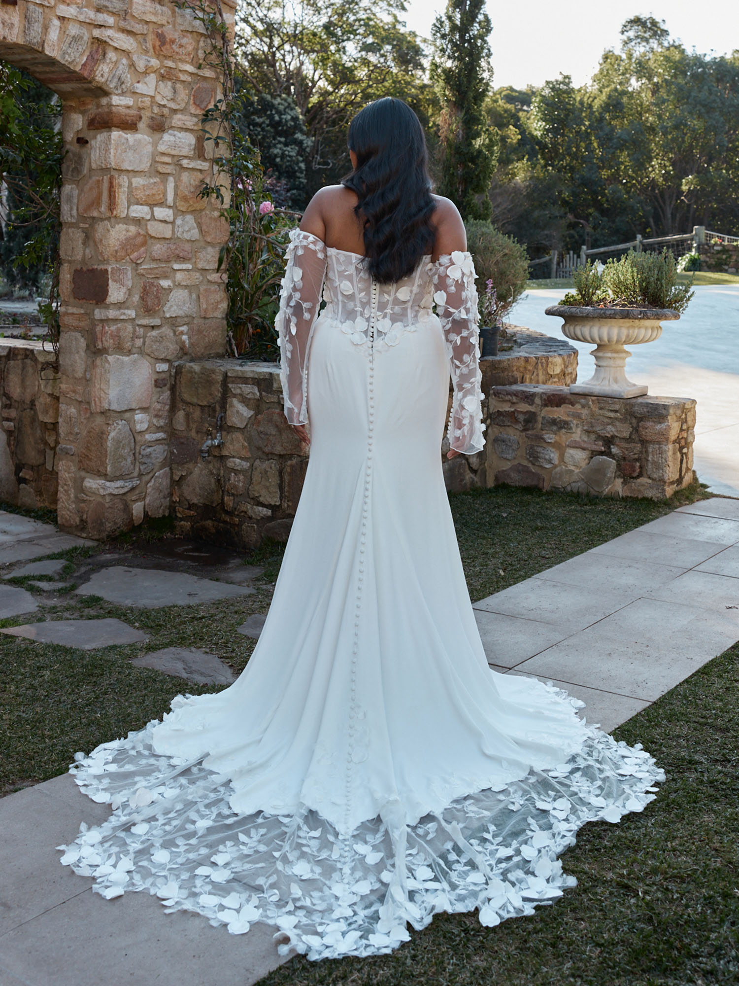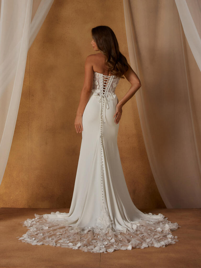An illusion lace-up corset-style back is adorned with soft petal motifs that scatter down the skirt and train. Matching embroidered motifs appear on the included detachable sleeves and Nash Collar, adding sculptural elegance and subtle drama.