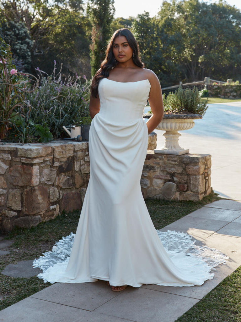 This strapless fit-and-flare wedding dress features a scoop neckline and flattering seamlines running the full length of the bodice. The seams guide the eye to a draped waist detail, sculpting the figure and elongating the slim-line skirt.