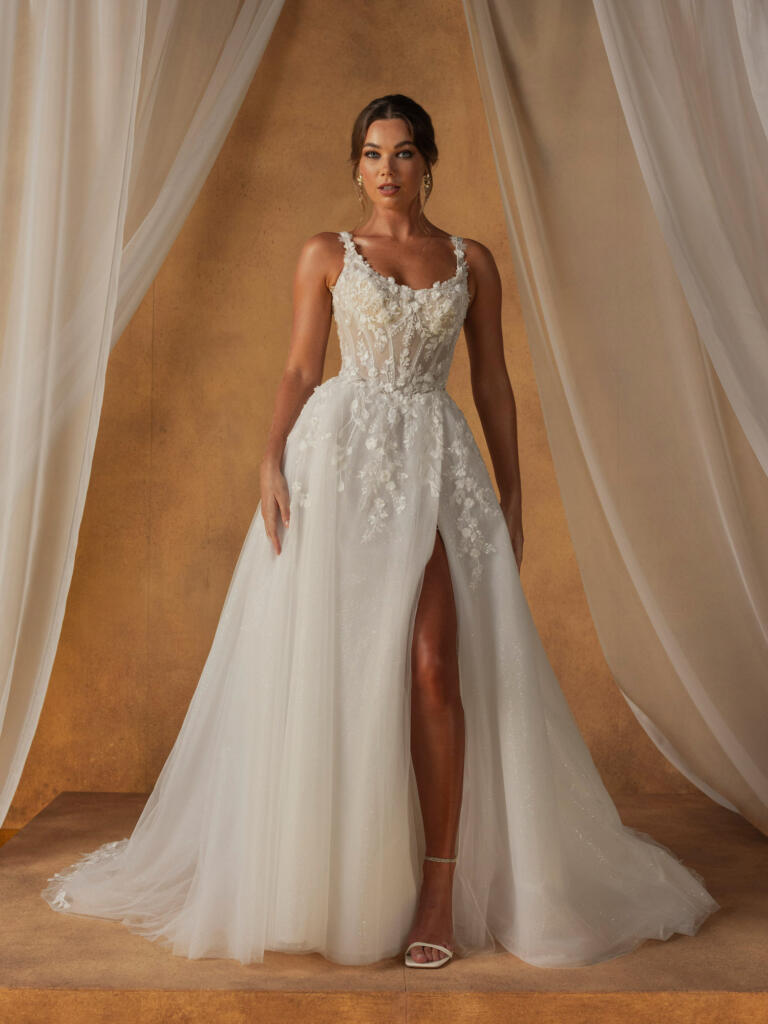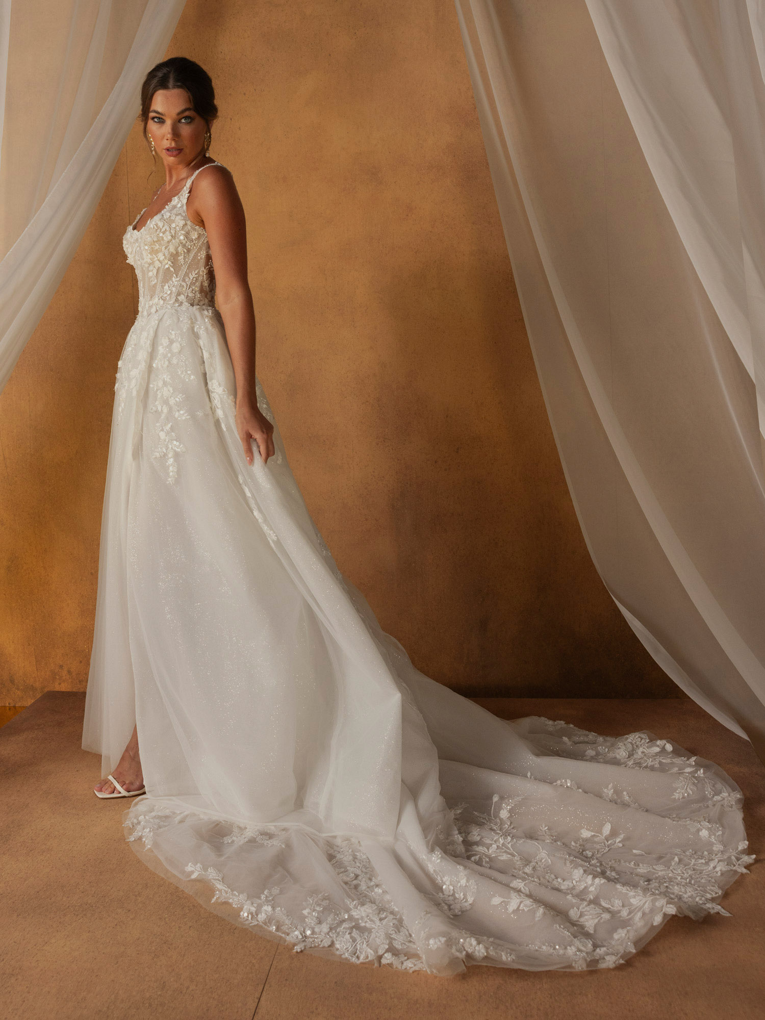 The slight Basque waistline defines the silhouette, flowing into an A-line tulle skirt gathered at the waist to create airy, romantic volume. Layers of soft tulle drift lightly with every step, enhanced by a leg slit that brings a contemporary edge to the ethereal design.