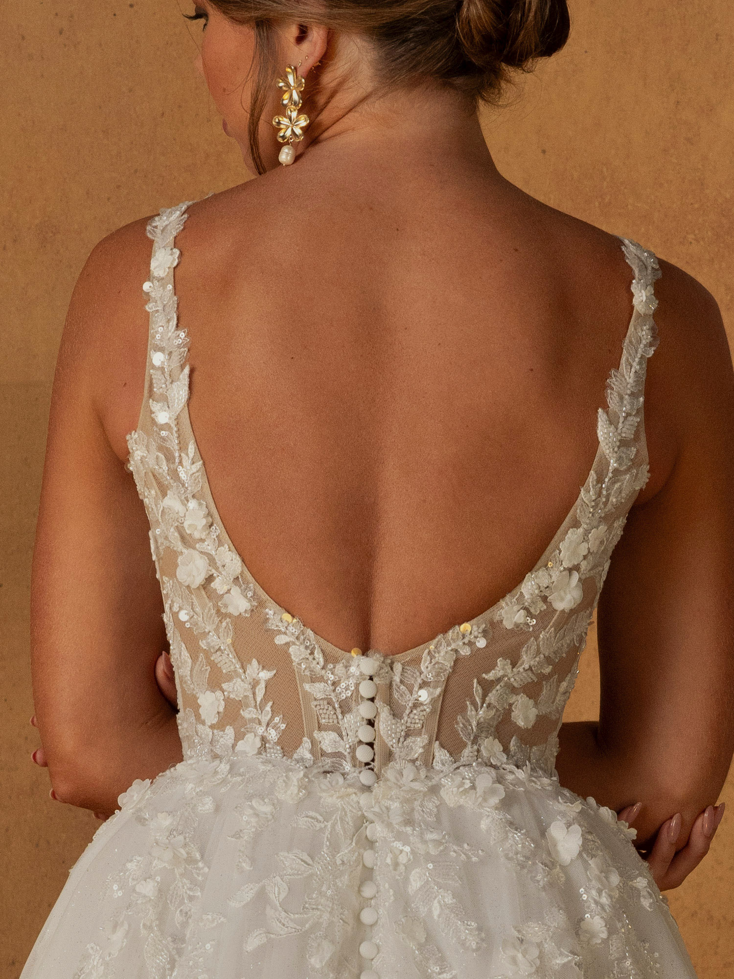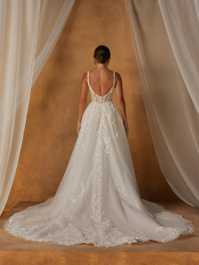 A dramatic statement train trails gracefully behind, finished with a vertical row of delicate buttons for timeless detail.