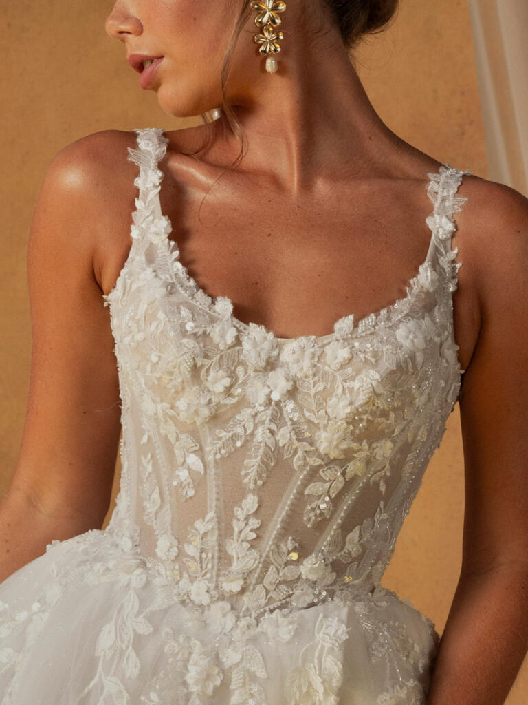 The bodice features a modern scoop neckline and embroidered straps, adorned with cascading beaded 3D floral motifs for soft, whimsical detail.