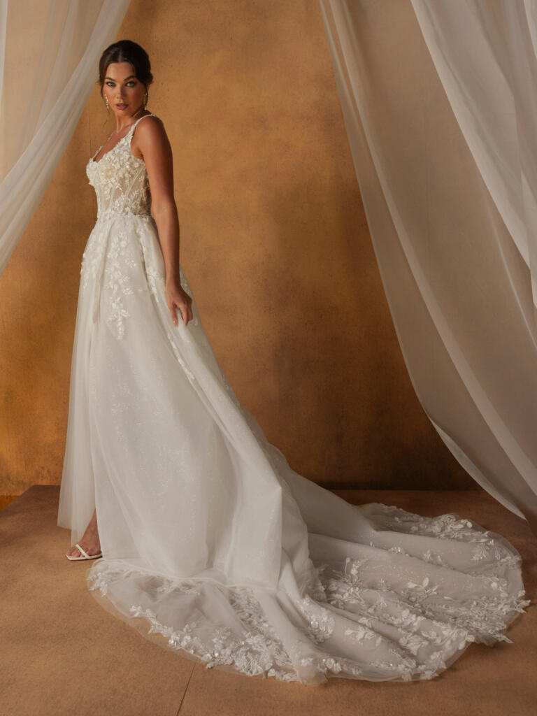 Our Nat wedding dress is a vision of romantic glamour, designed for brides who crave movement, sparkle, and ethereal elegance.