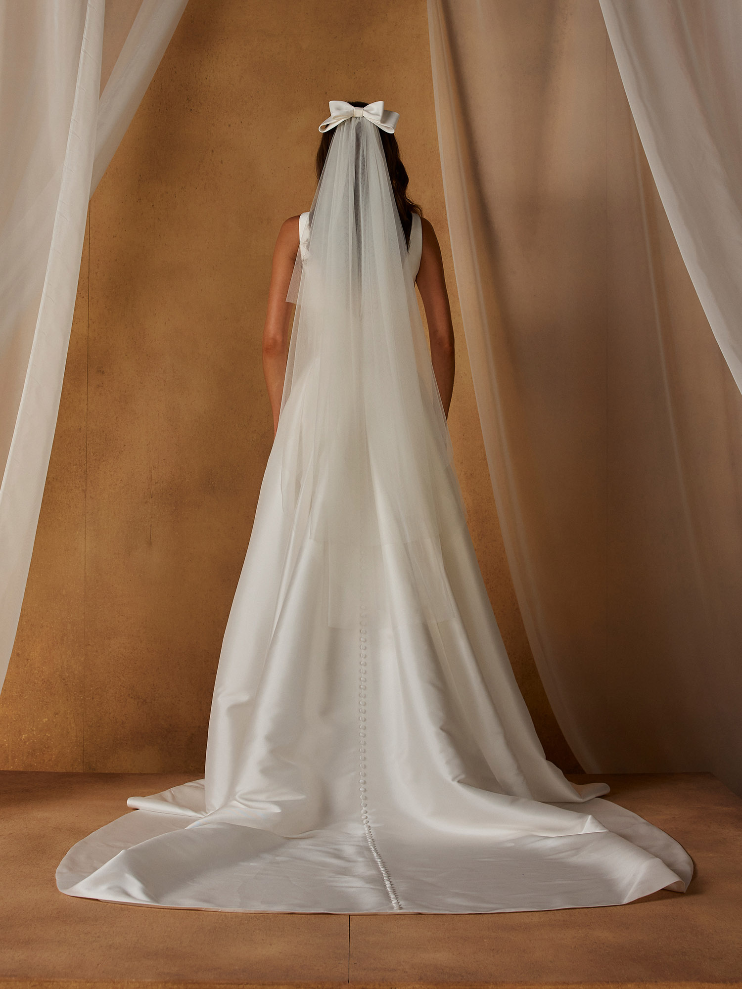The Navy Veil is a fingertip-length tulle design finished with a Mikado bow, offering a timeless, vintage-inspired bridal aesthetic.