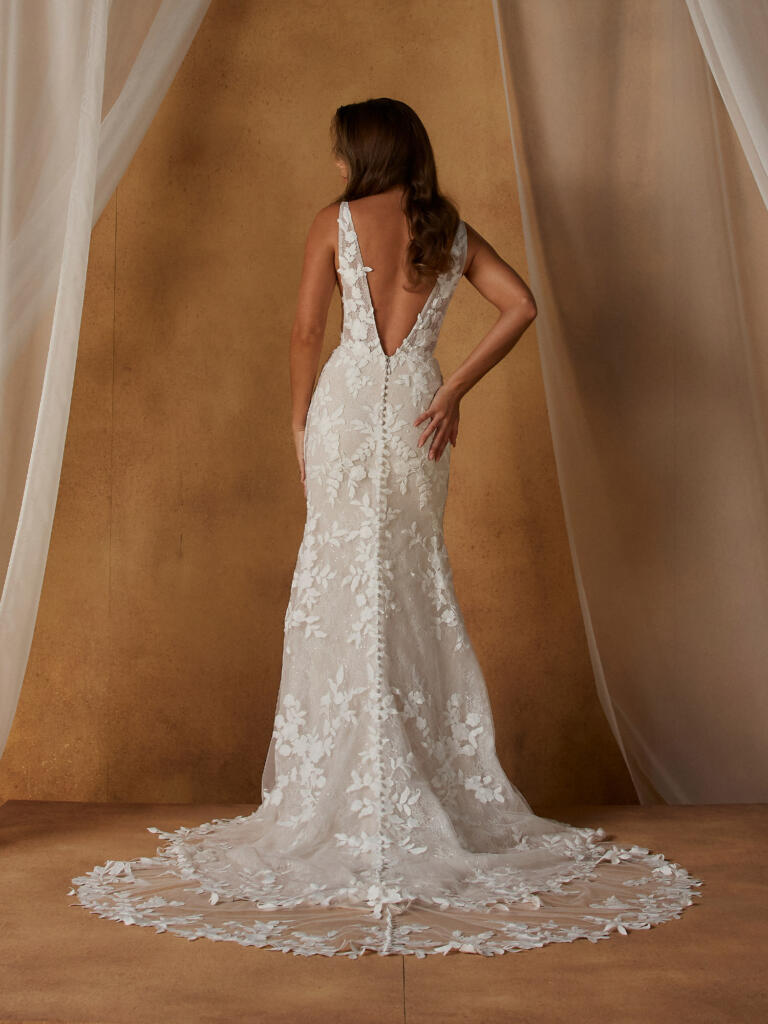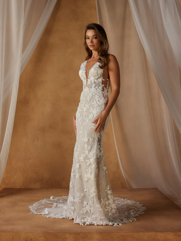 Nellie offers a contemporary, sculpted silhouette with soft shimmer, delivering a bridal look that feels modern, romantic, and distinctly memorable.