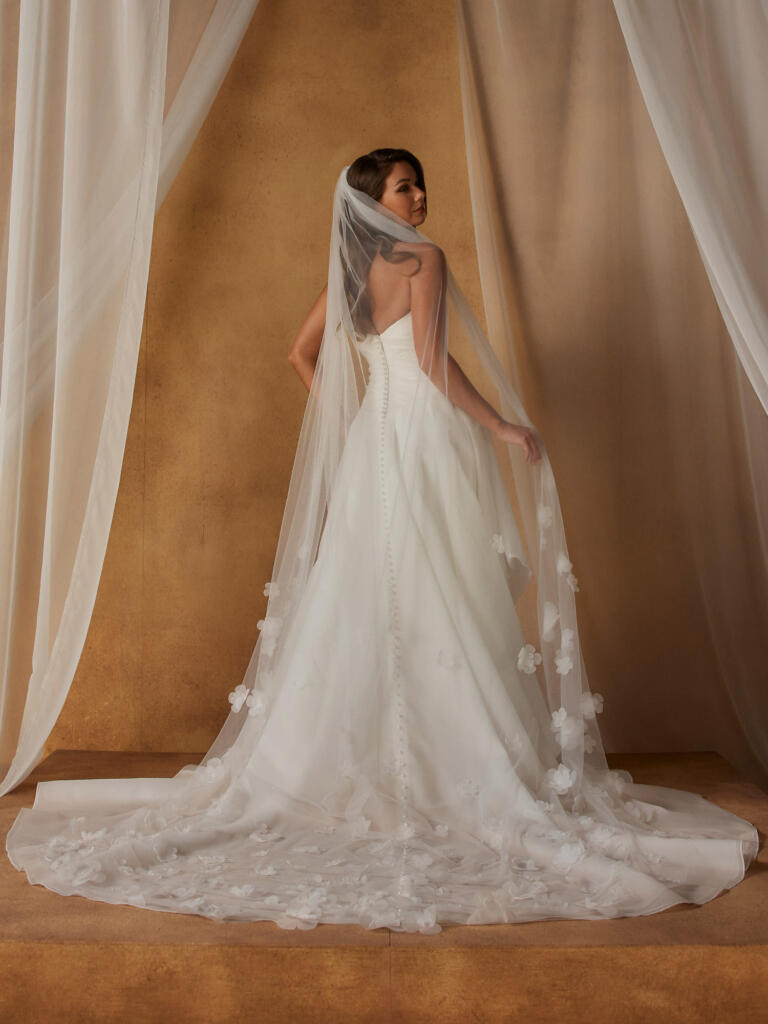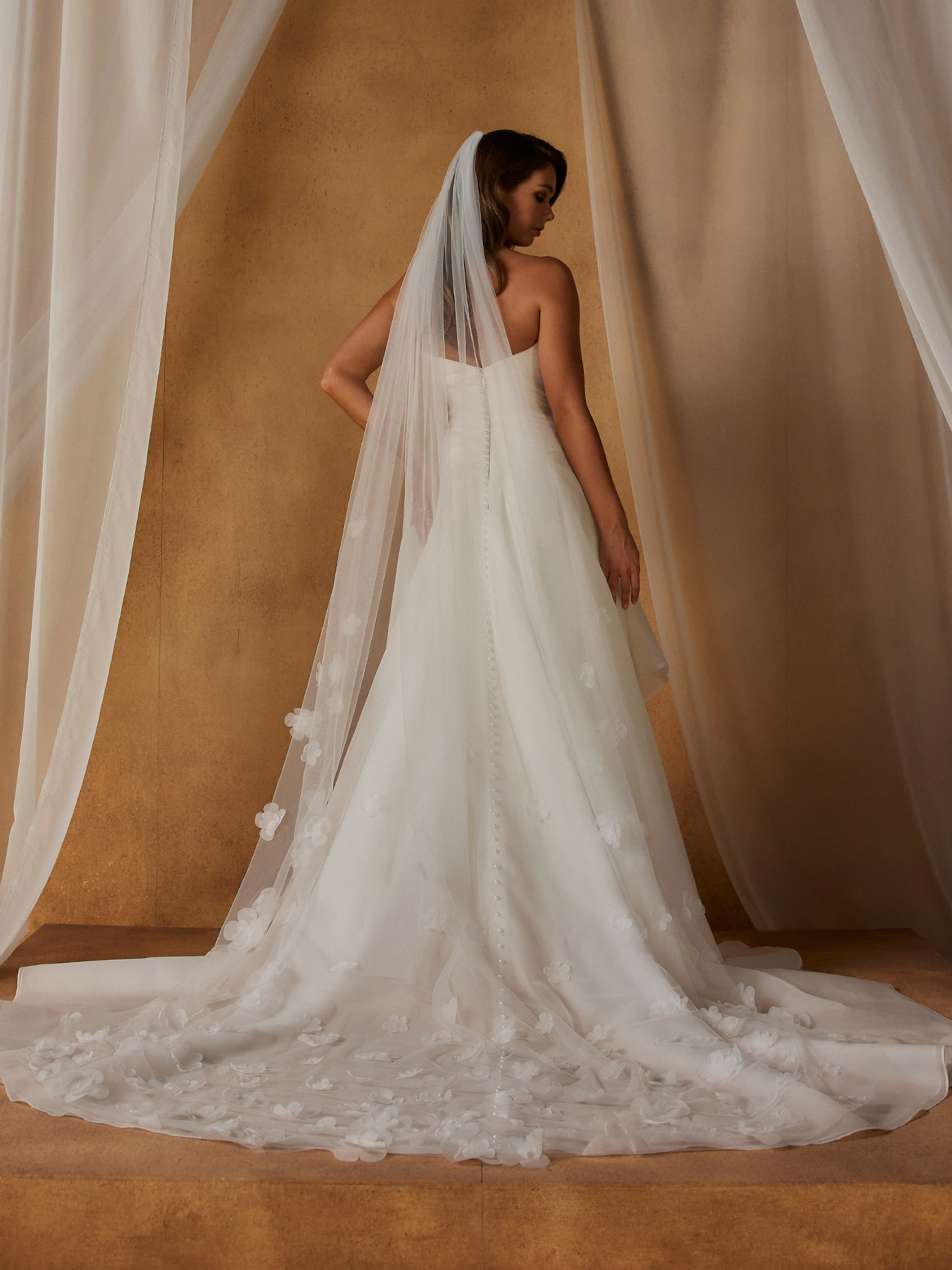 Designed to match our ethereal Nettle wedding dress, this tulle veil is cathedral length with cascading 3D floral motifs. Adding perfectly to the delicately soft overall look of the Nettle dress.