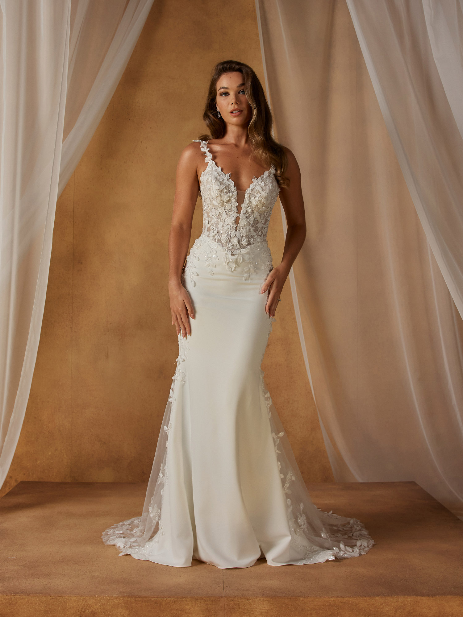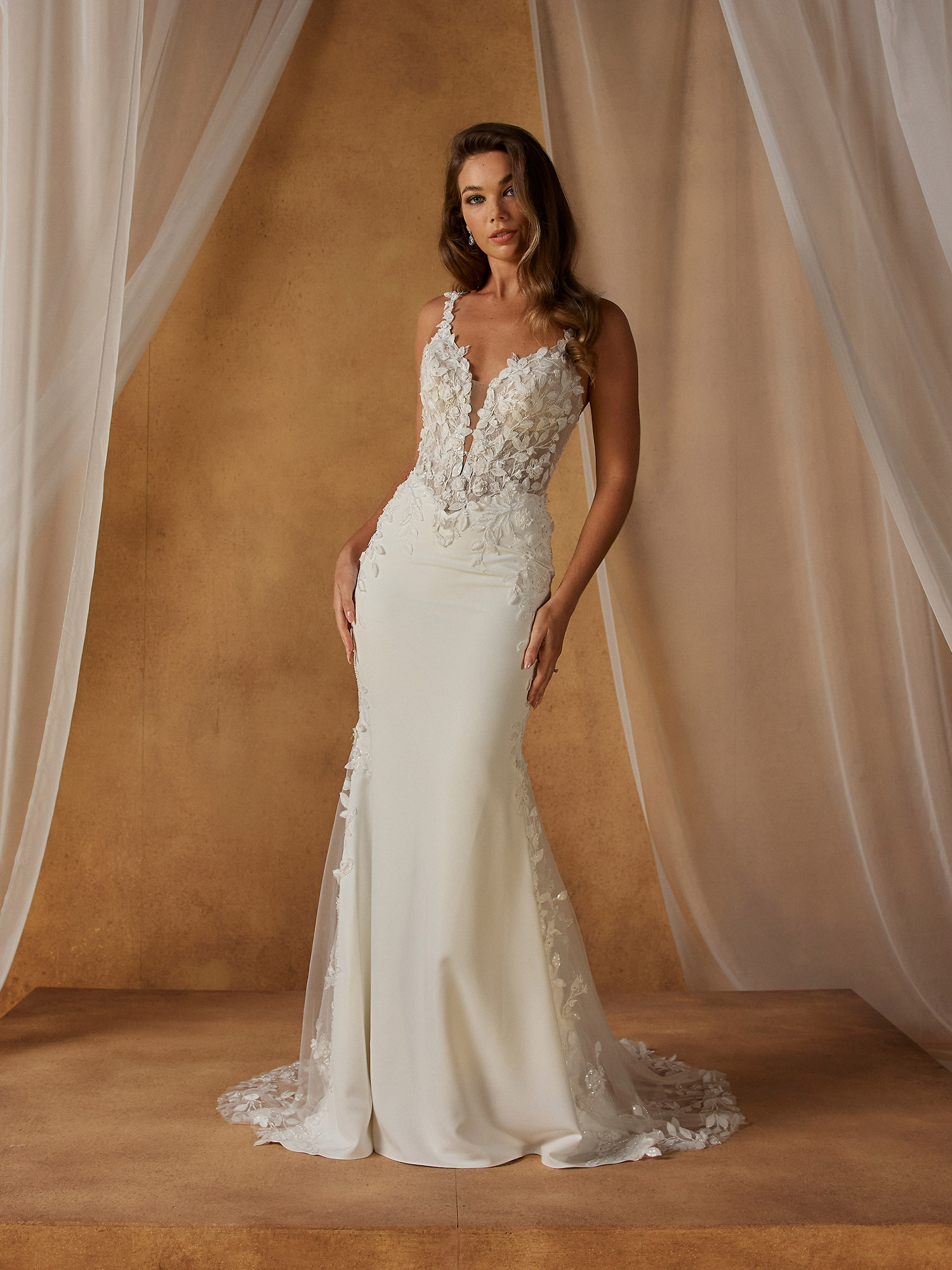Our Niall-Lee wedding dress is the simpler version of our Niall wedding dress all-over lace design. This blends modern minimalism with intricate romantic detail, perfect for brides seeking refined elegance with soft glamour.