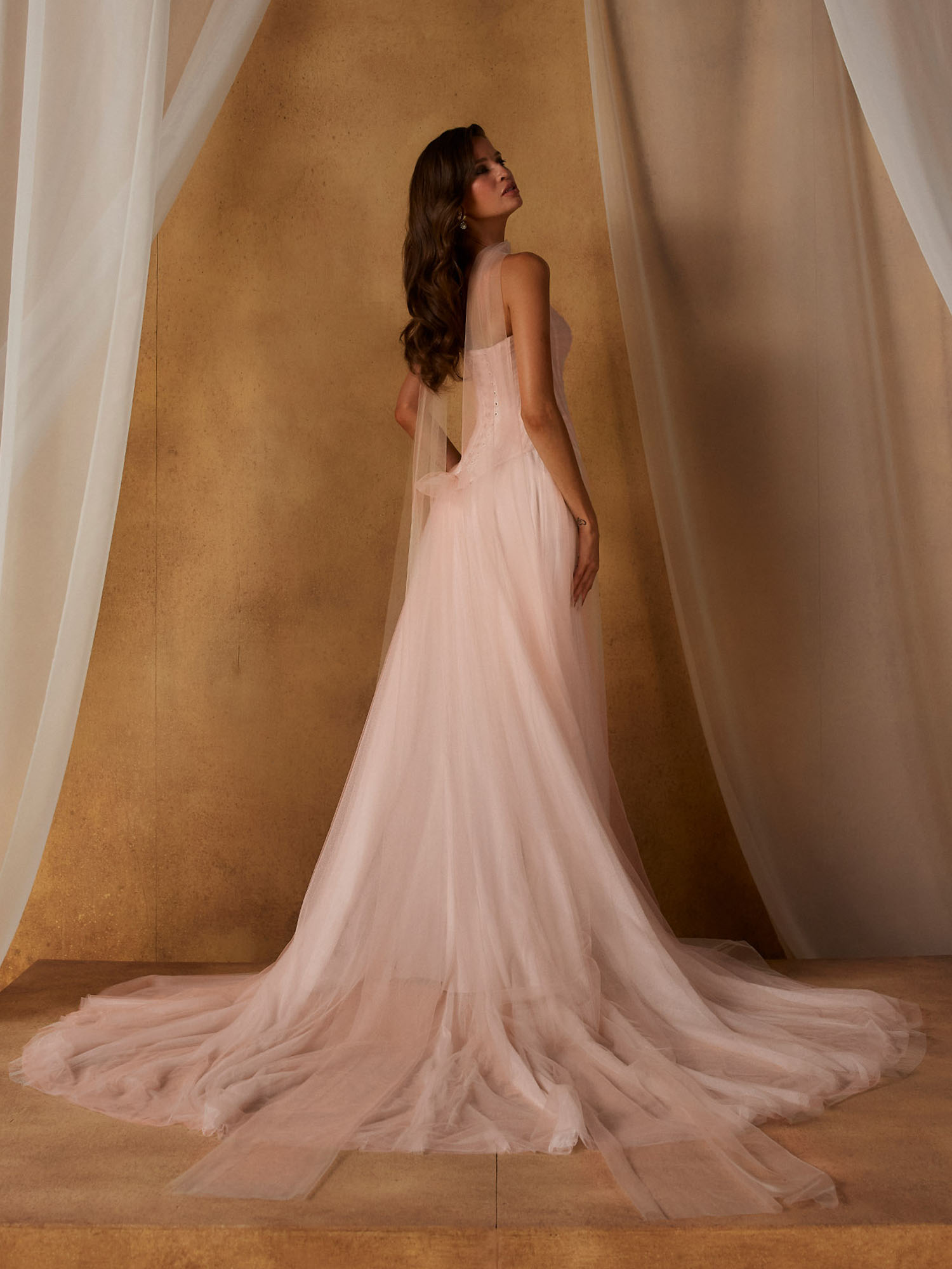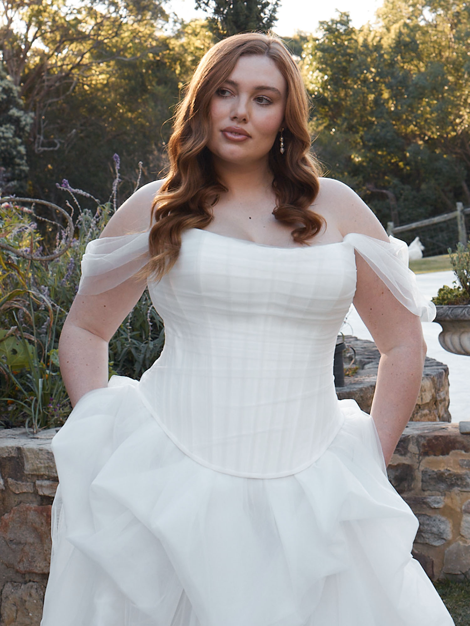 The corset-style bodice begins with a scoop neckline. Exposed boning creating shape with a modern edge, layered with blush pleated tulle to soften the design. Finishing at an on-trend rounded drop waist, hugging the figure to the hips for the most desired silhouette.