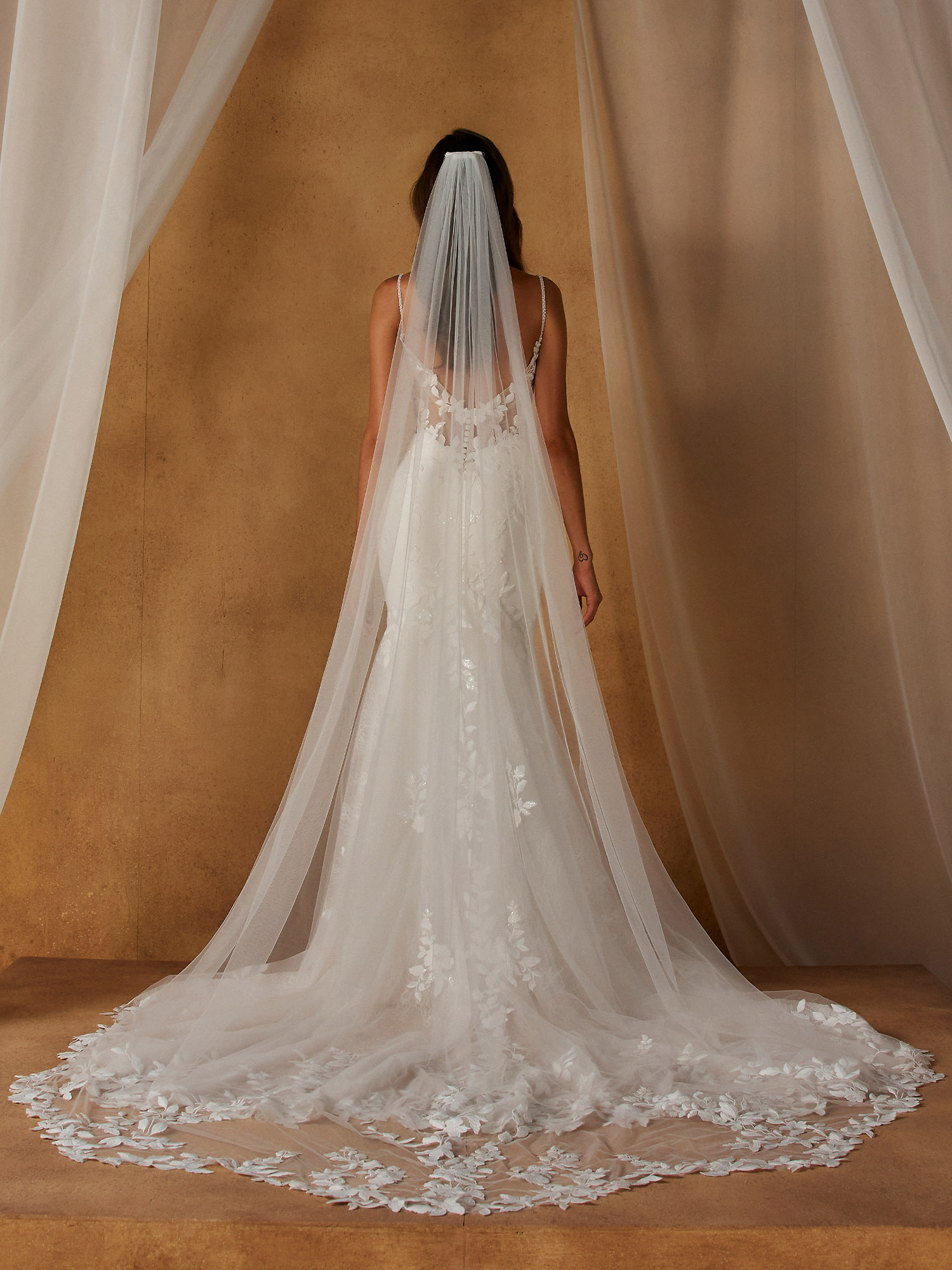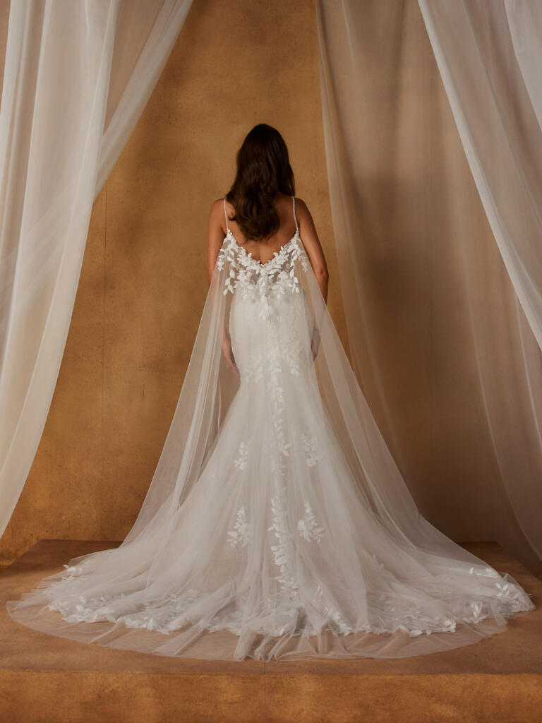 For brides seeking a dramatic statement, style with the Nicola Veil or Nicola Cape. These accessories are designed to complement this modern classic, yet versatile enough to elevate any wedding dress.