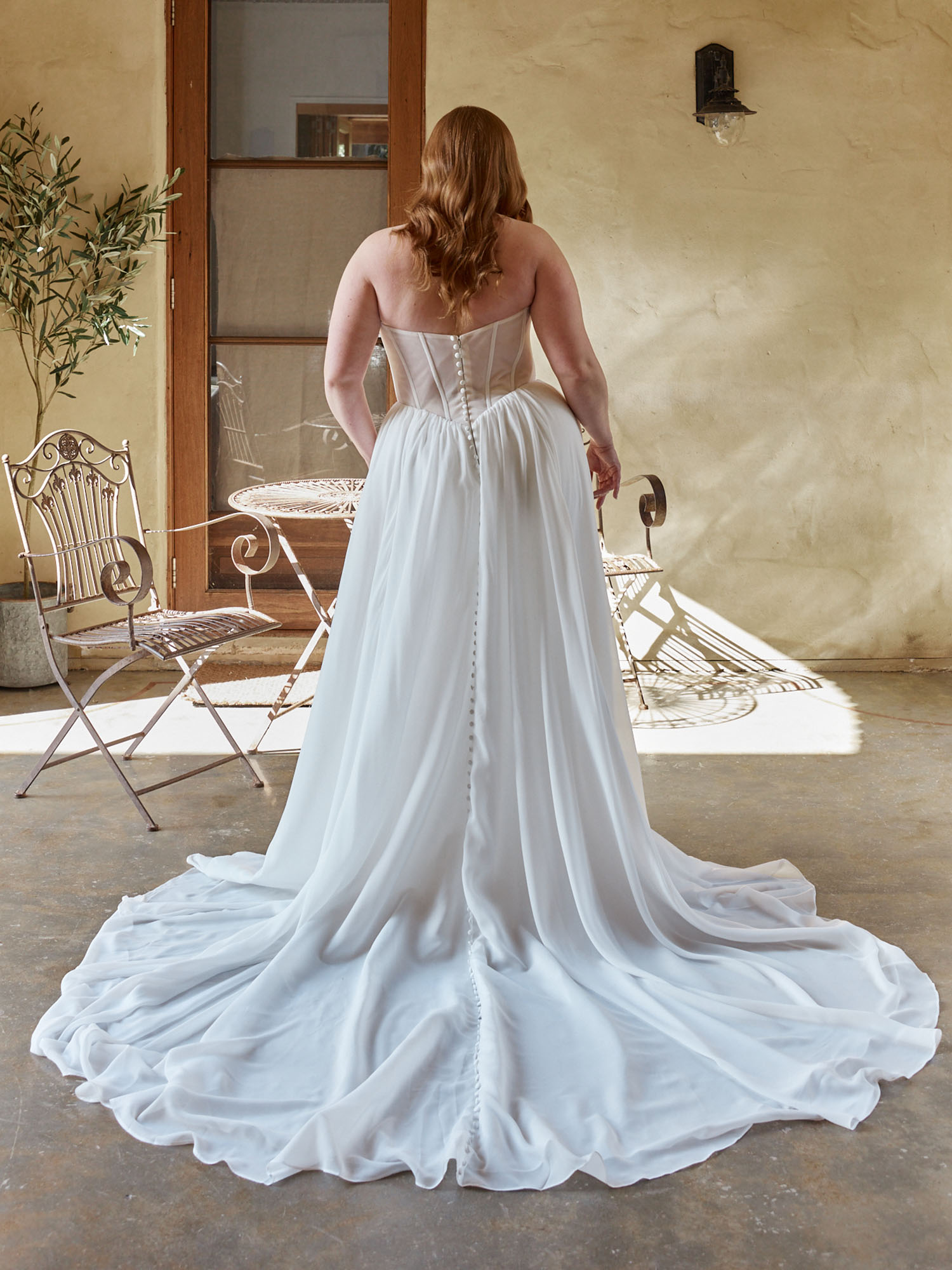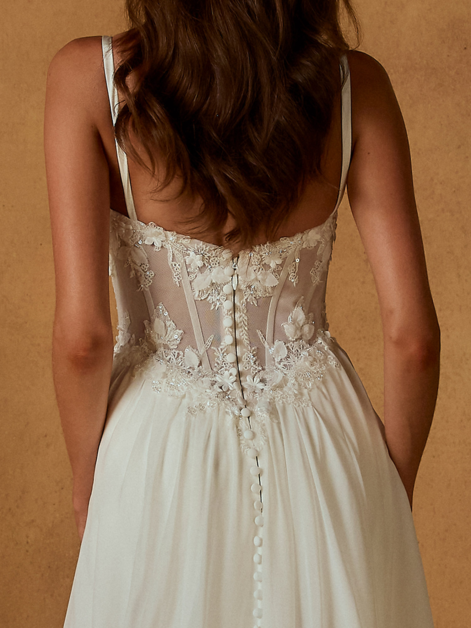 A soft scoop neckline frames the bodice, complemented by thin, delicate straps that create a timelessly understated bridal aesthetic. Illusion side panels contour the waist with a modern edge, offering transparency that flatters while keeping the design sleek and refined. An illusion lace back with exposed boning enhances the gown’s couture detail, balancing strength with ethereal lightness.
