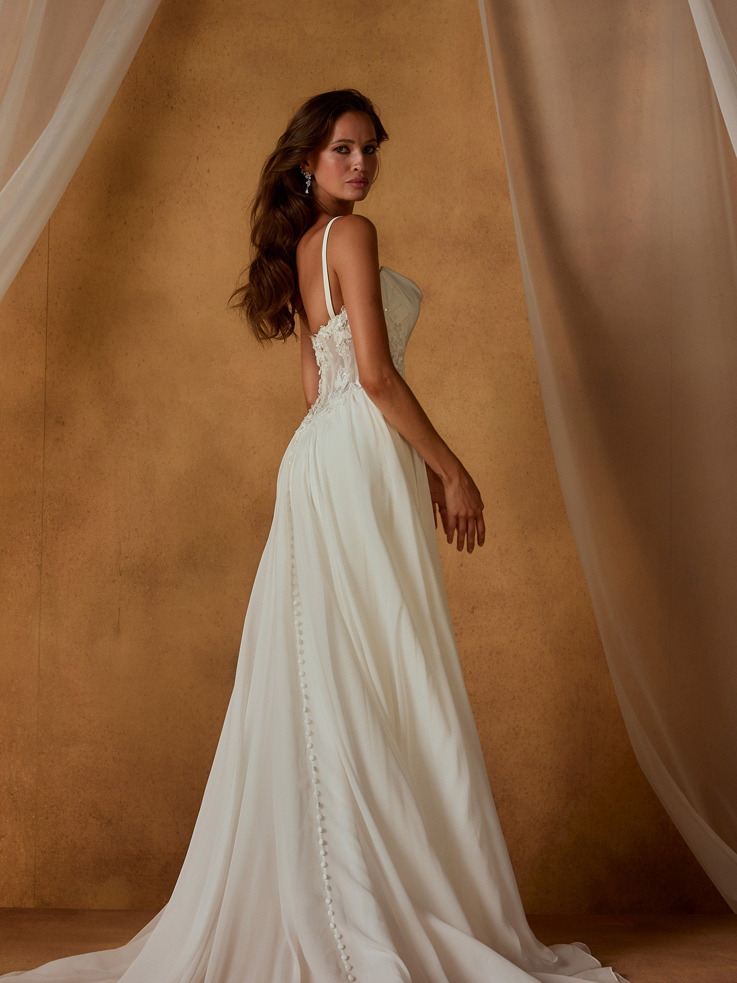 This minimalist yet romantic wedding dress is perfect for brides seeking understated design, modern detailing, and effortless sophistication.