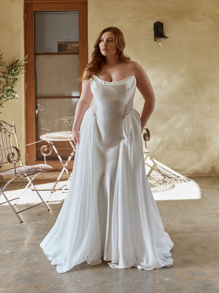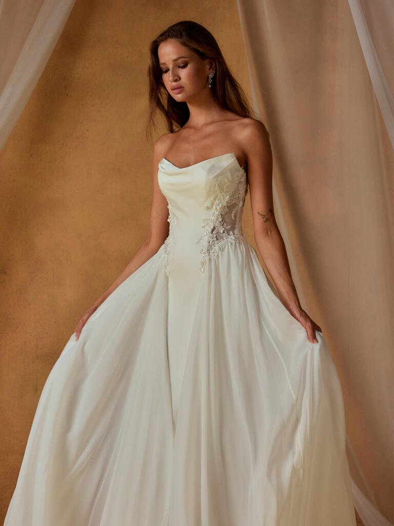 Our Nim wedding dress captures soft romance with modern simplicity, blending slinky satin and airy chiffon for a minimalist bridal look.