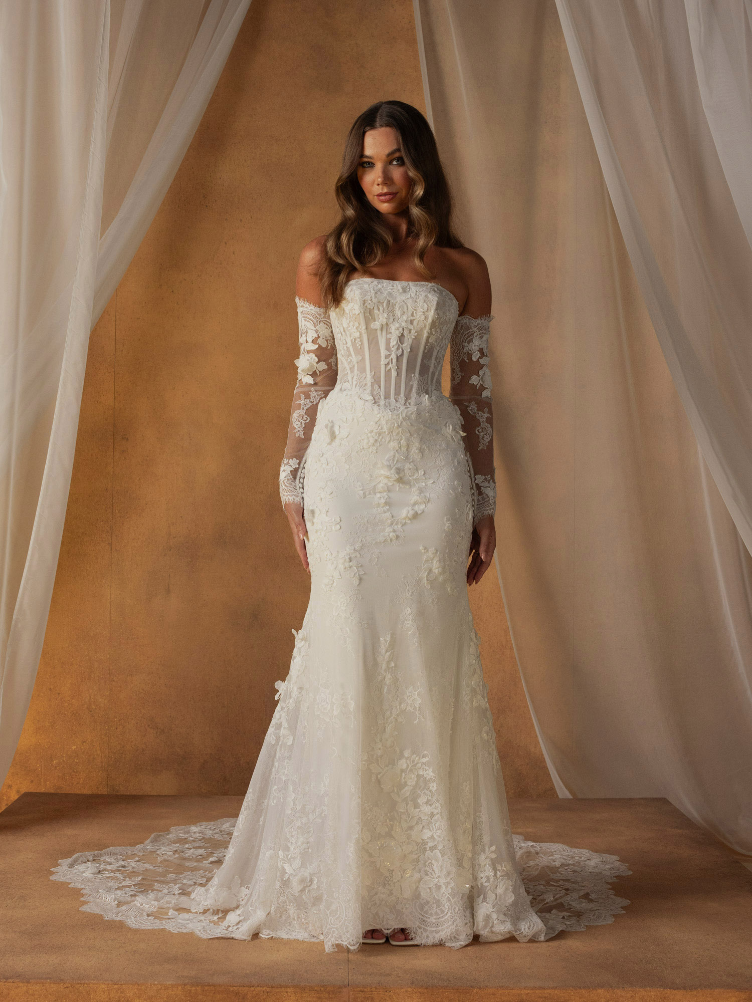 Across the gown, 3D lace motifs bloom with purposeful placement, adding depth and organic detail. These appliqués highlight natural movement and give dimension to the lace base. The skirt continues close through the hips before flaring gently at the hem.