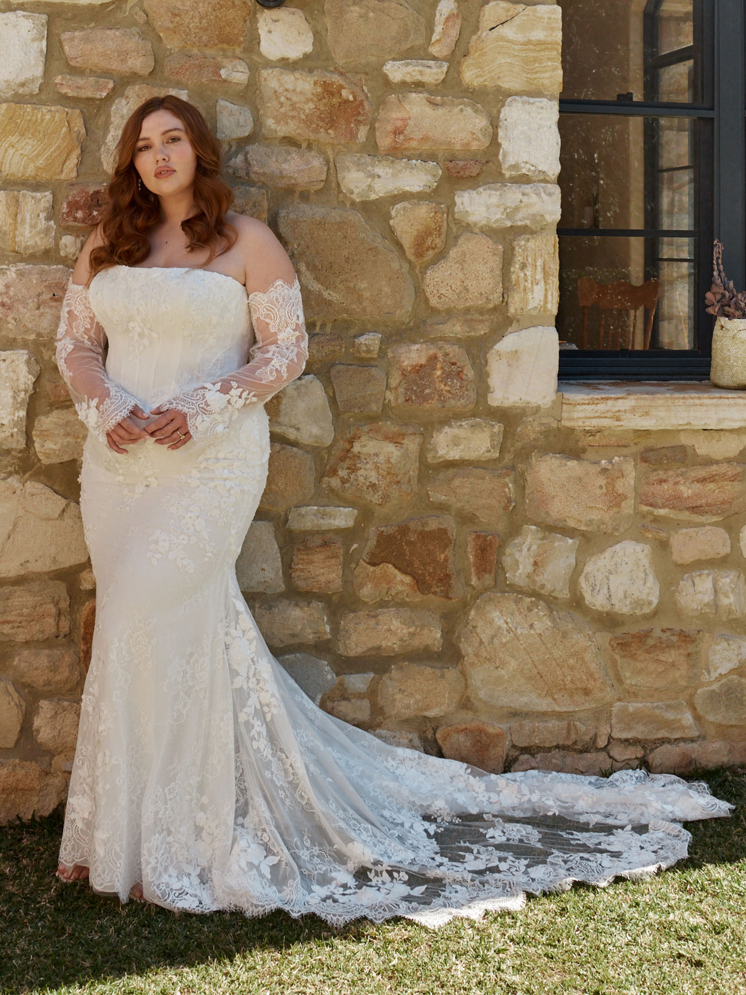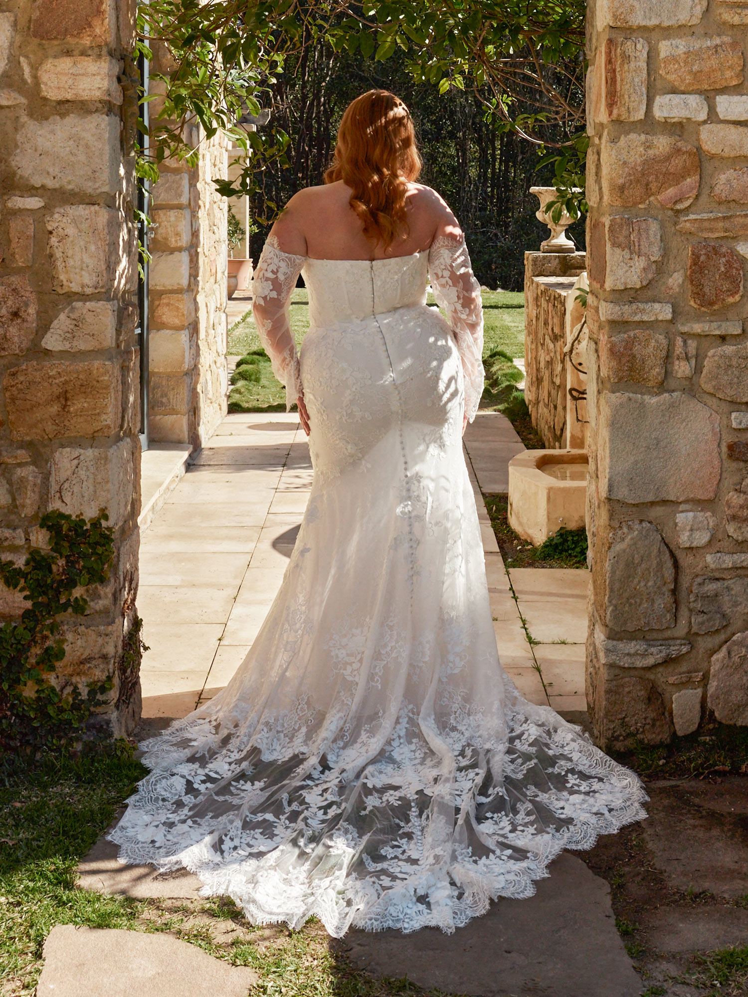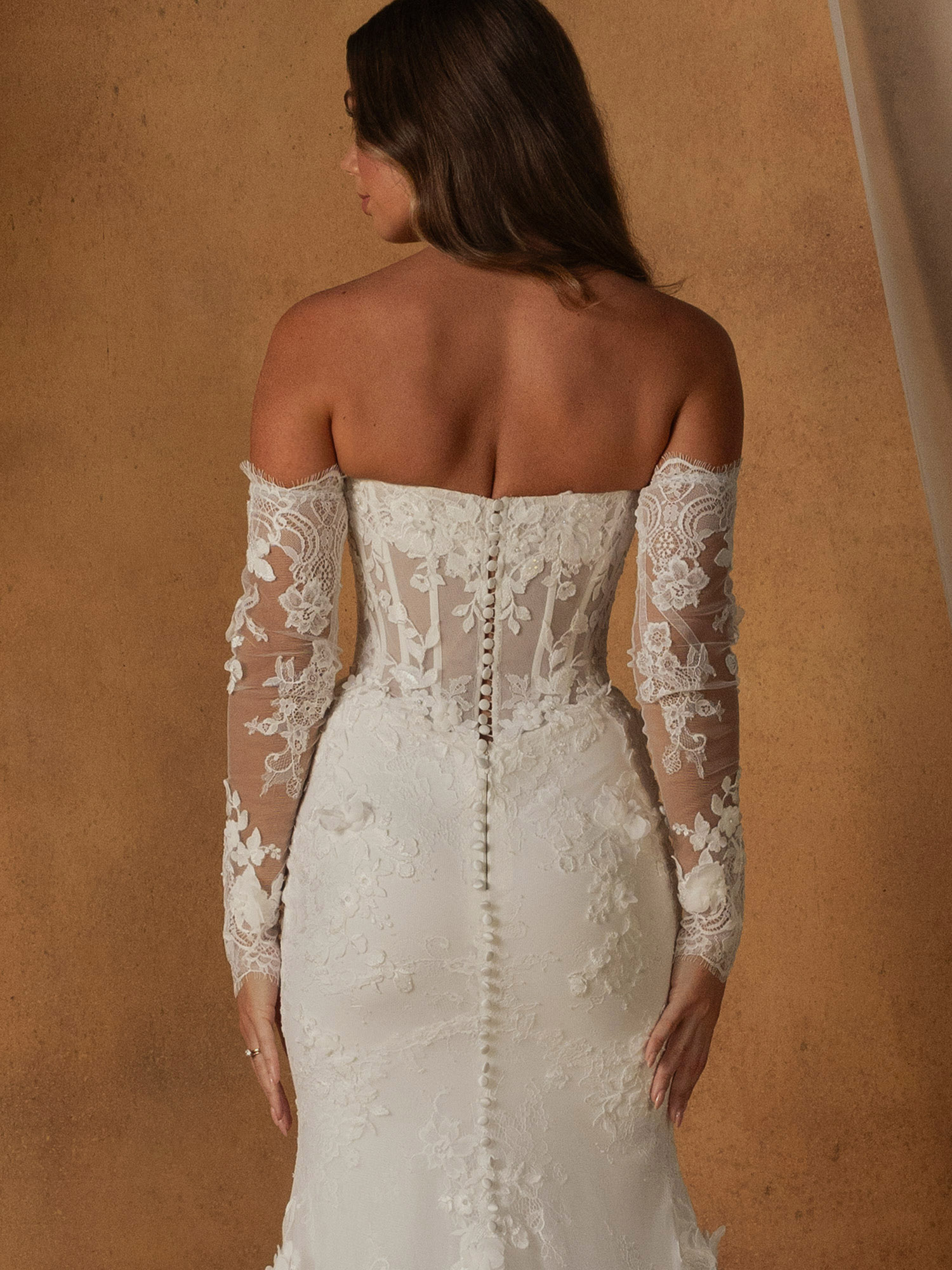 Detachable off-shoulder sleeves, crafted from matching lace, add versatility and softness.