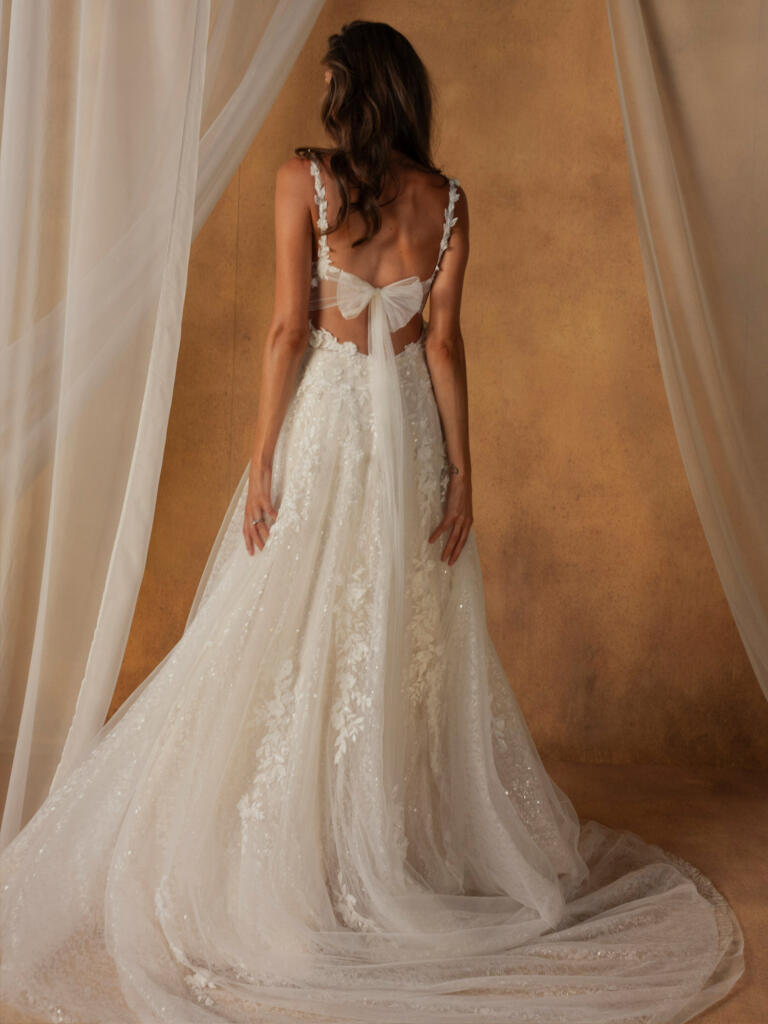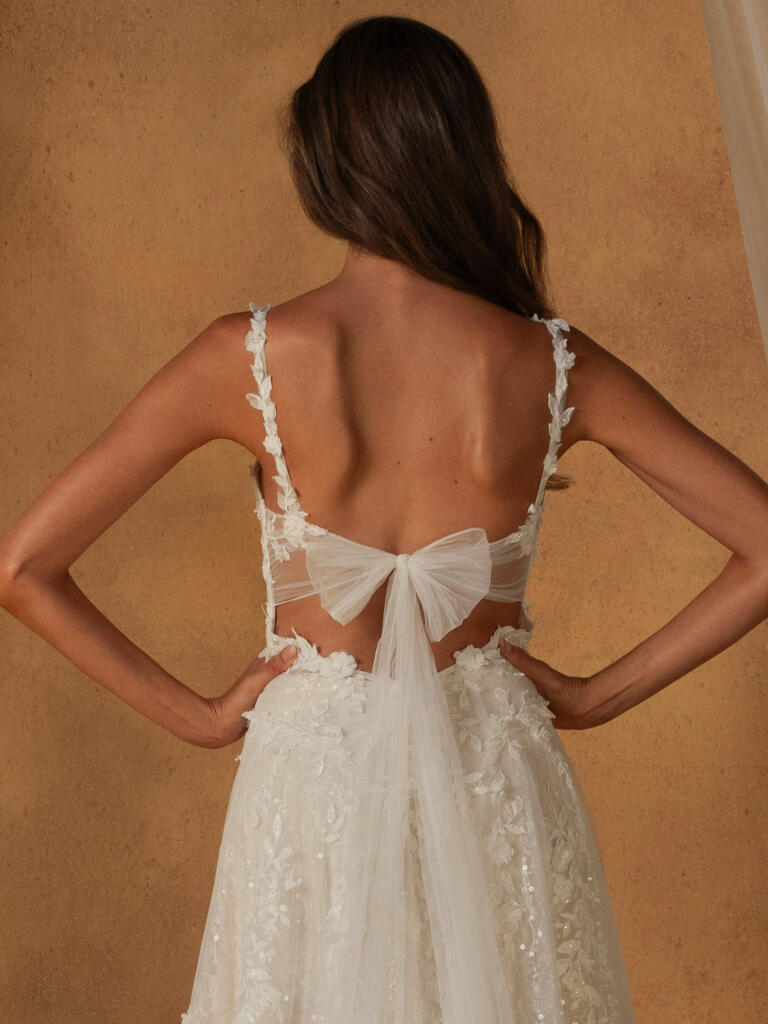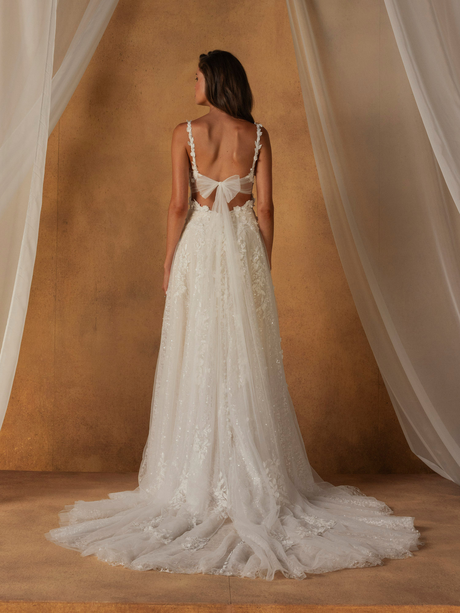 A low back finishes the look, modernising the traditional-inspired look, and featuring a dramatic tulle bow detail. The ties of which reach down and blend seamlessly into the train.