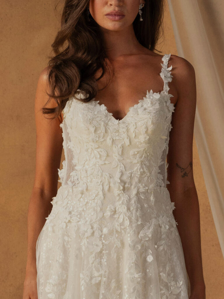 The sequin Chantilly lace bodice is layered with 3D floral motifs and features a modest V-neckline and embellished shoulder straps. To shape the figure, sheer Chantilly side panels give a contouring affect without compromising the softness of the style.