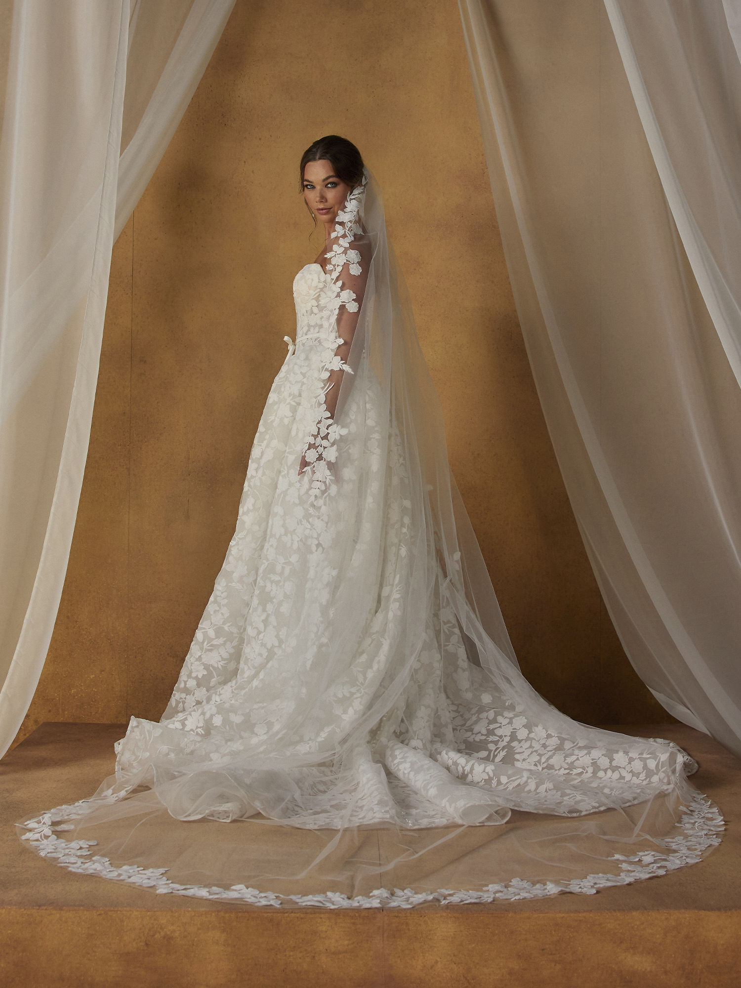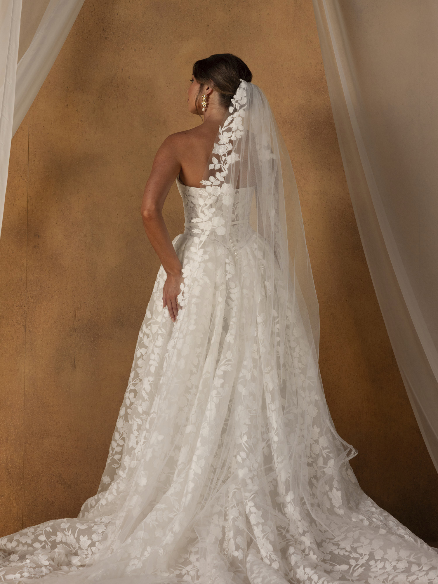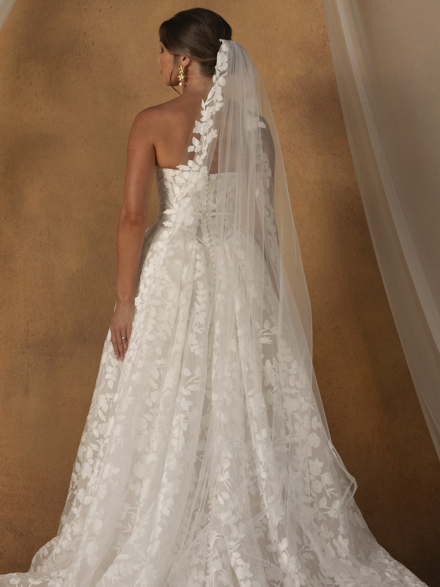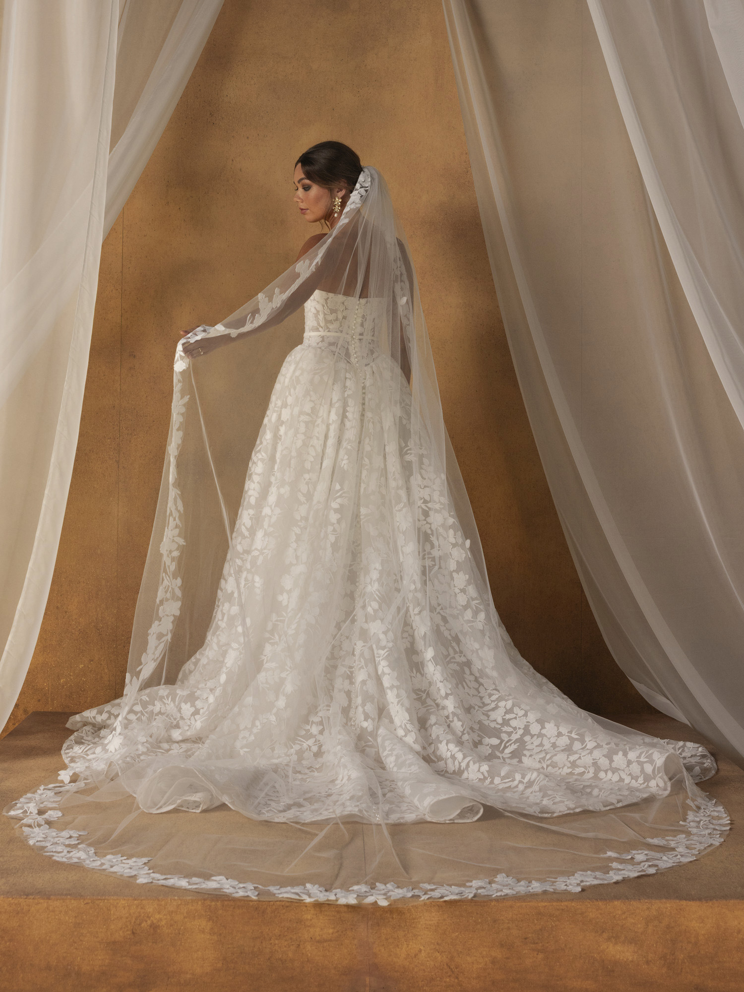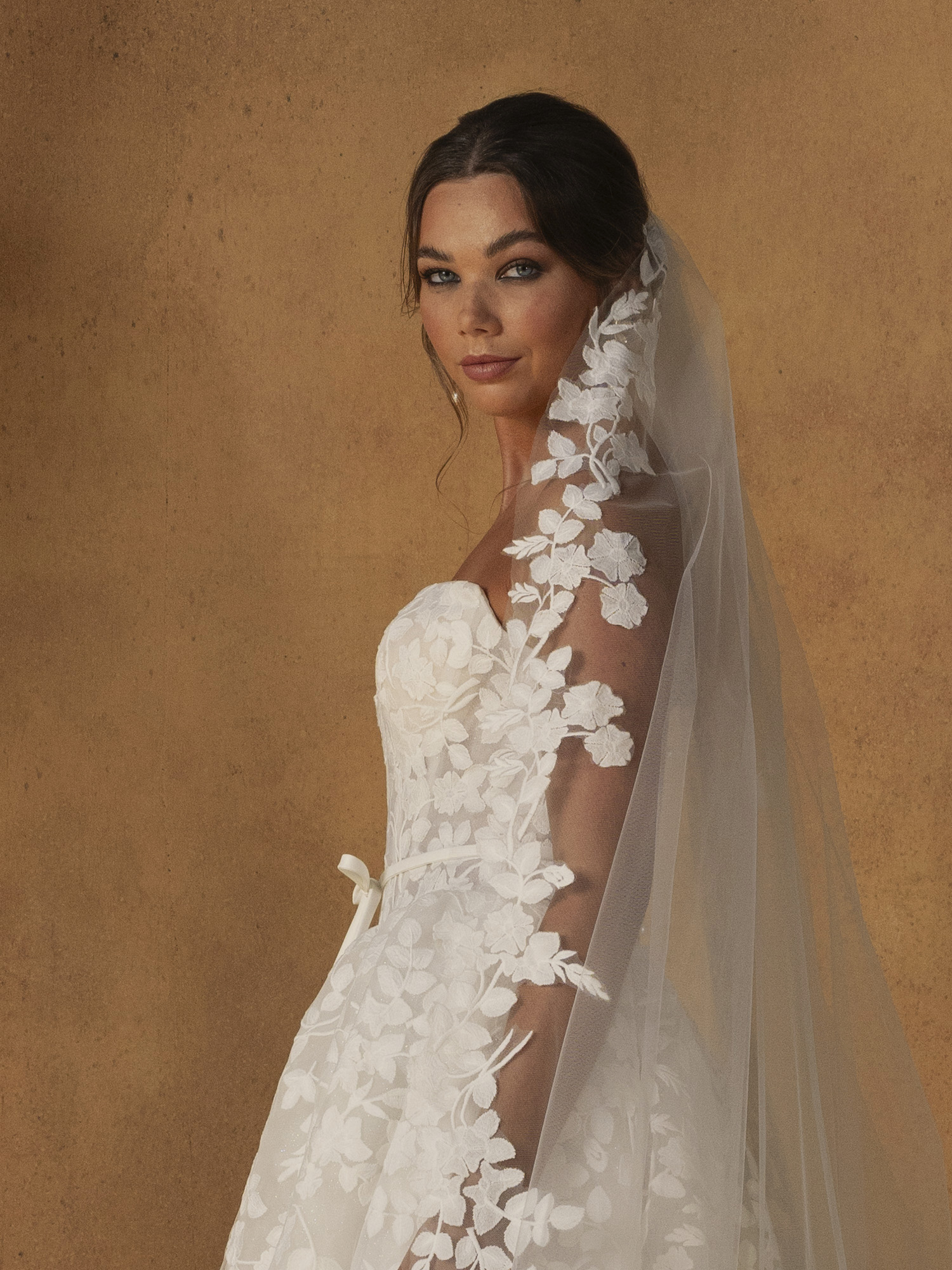 Our Nobu Veil is designed to match our Nobel and Noble Mini wedding dresses. A romantic, classic bridal accessory with a lace motif edge, to perfectly complete your bridal look.