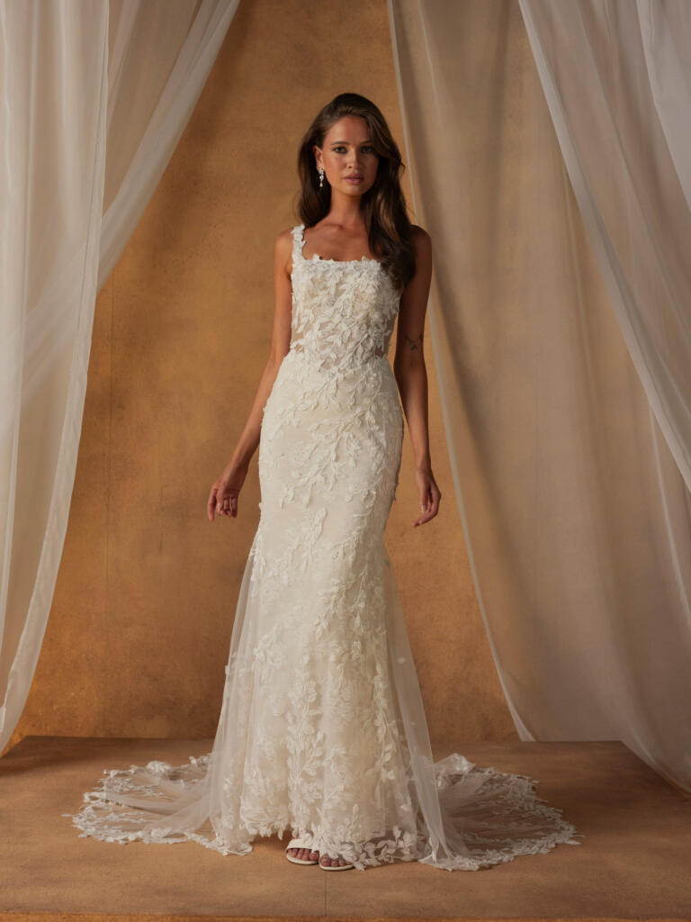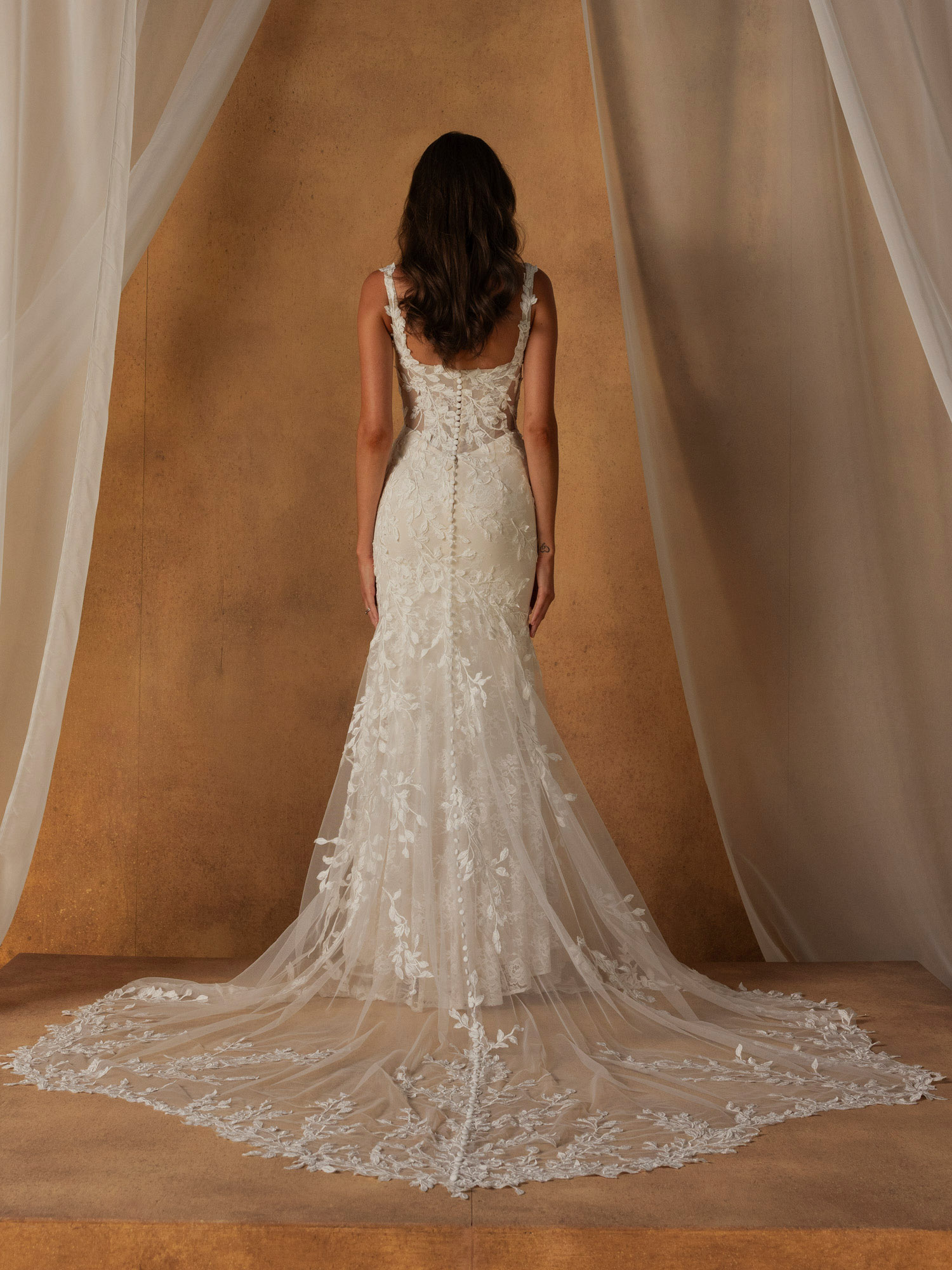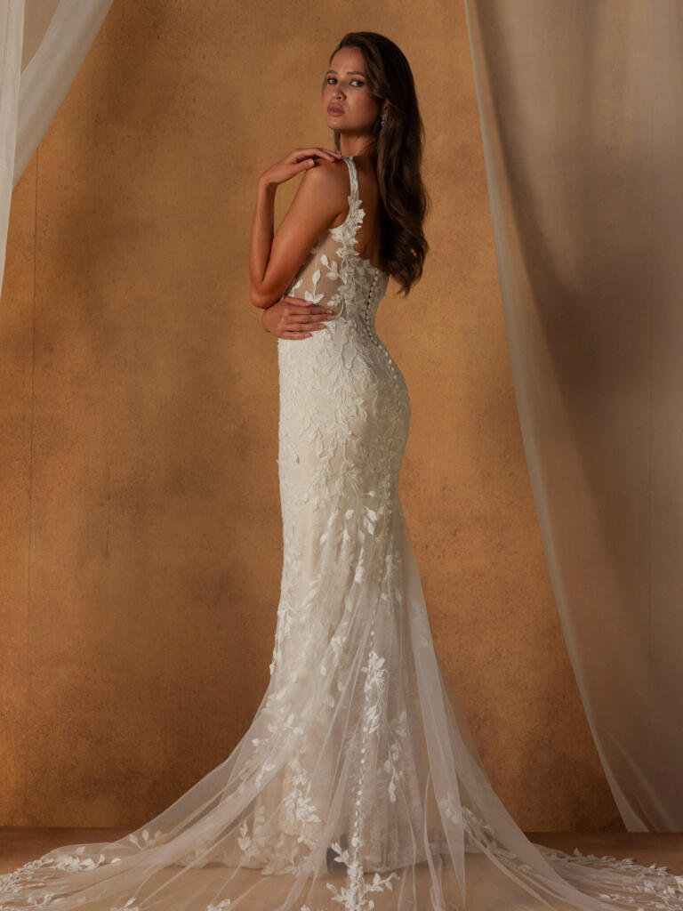 This lace is thoughtfully placed to celebrate the feminine form, asymmetrically wrapping from the bodice down to the skirt as if lovingly embracing the bride. The soft details are offset by modern lines and a sensual, fit and flare silhouette. Creating the perfect balance of delicate and confident, and reminiscent of the enduring strength and beauty of the natural world around us.