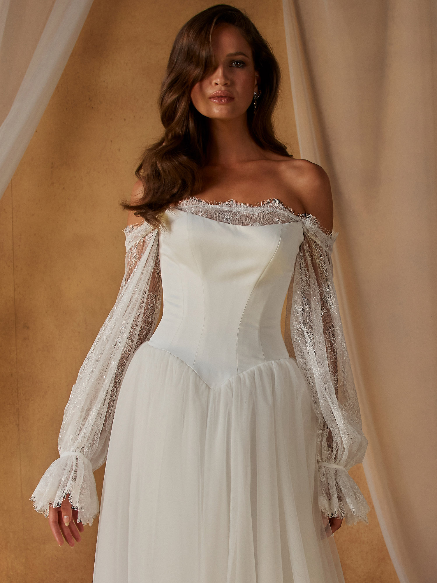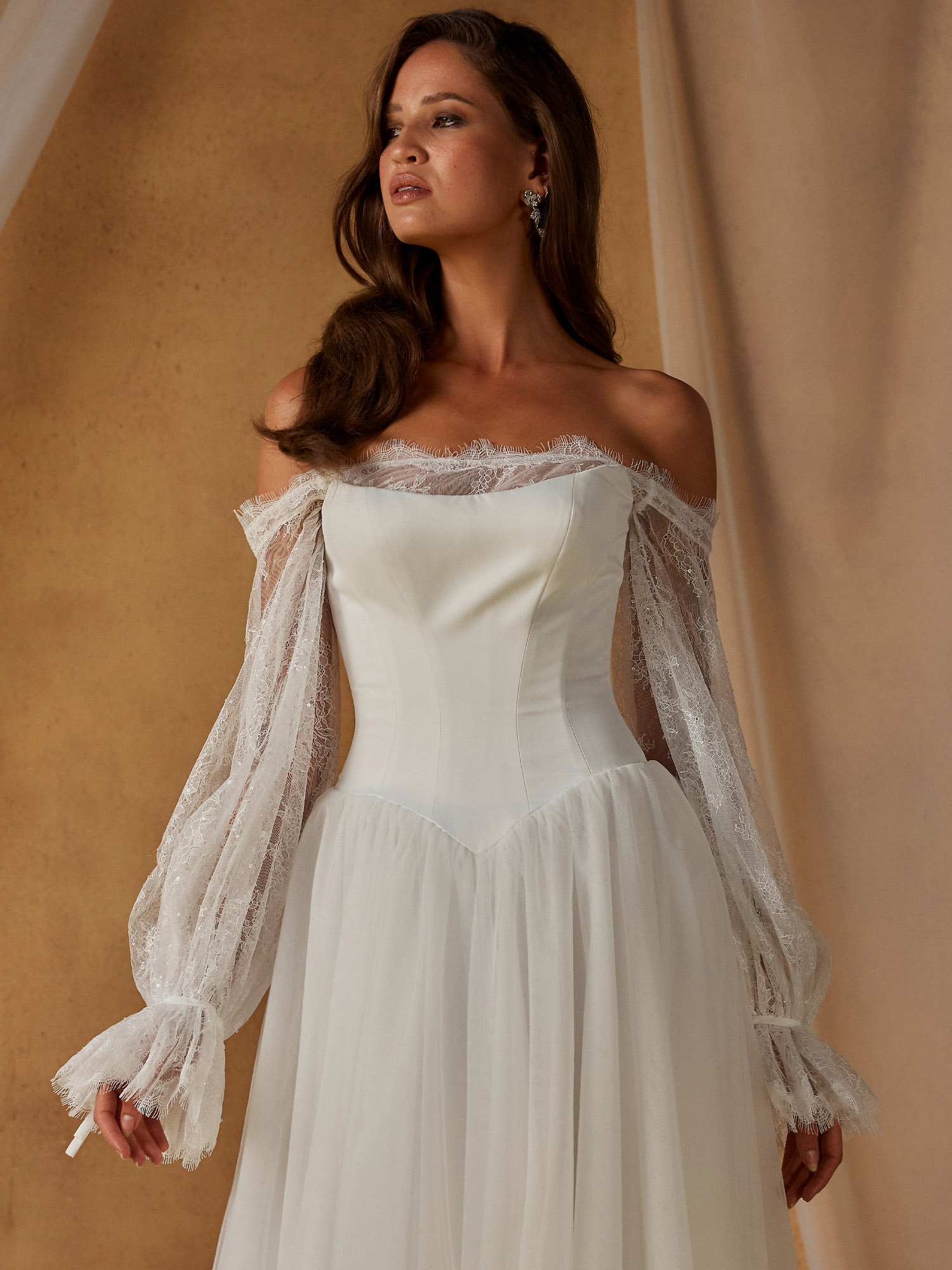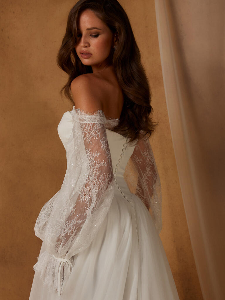Composed of Chantilly lace and intended to sit off the shoulder for optimal romance. This jacket features delicate blouson sleeves with wrist ties that feel whimsical and dreamy. Perfectly balancing the modern minimalism of our Nordic dress.