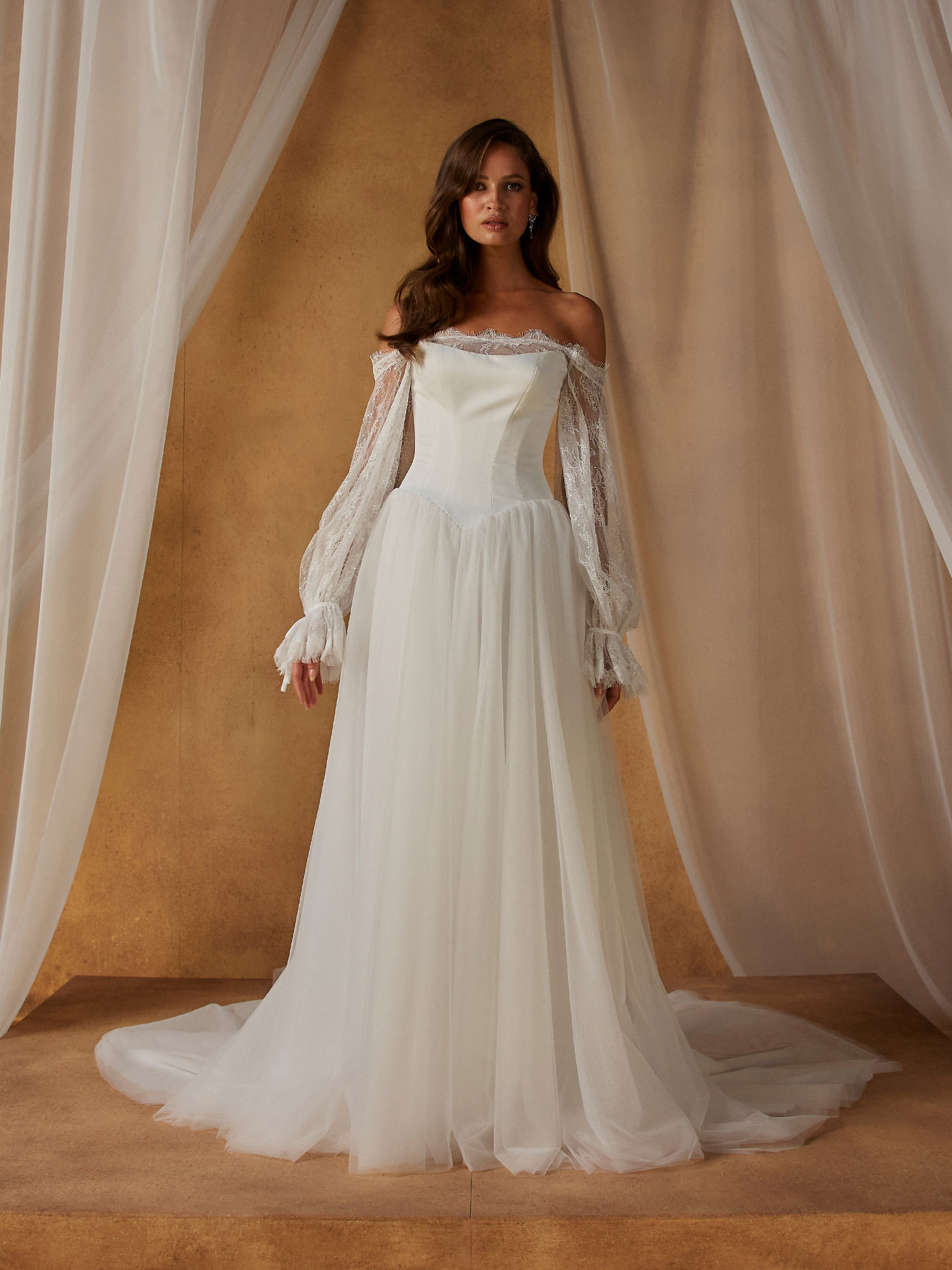 Style this dress with the matching Nordic Jacket, with romantic lace blouson sleeves that sit off the shoulder. The contrasting textures of the lace, satin and tulle create visual interest. The Nordic Jacket also giving the look a bohemian, unconventional edge without forsaking the gown’s simple elegance. The jacket is finished by sweet ribbon ties around the wrists.