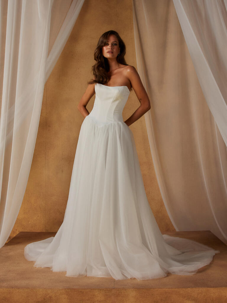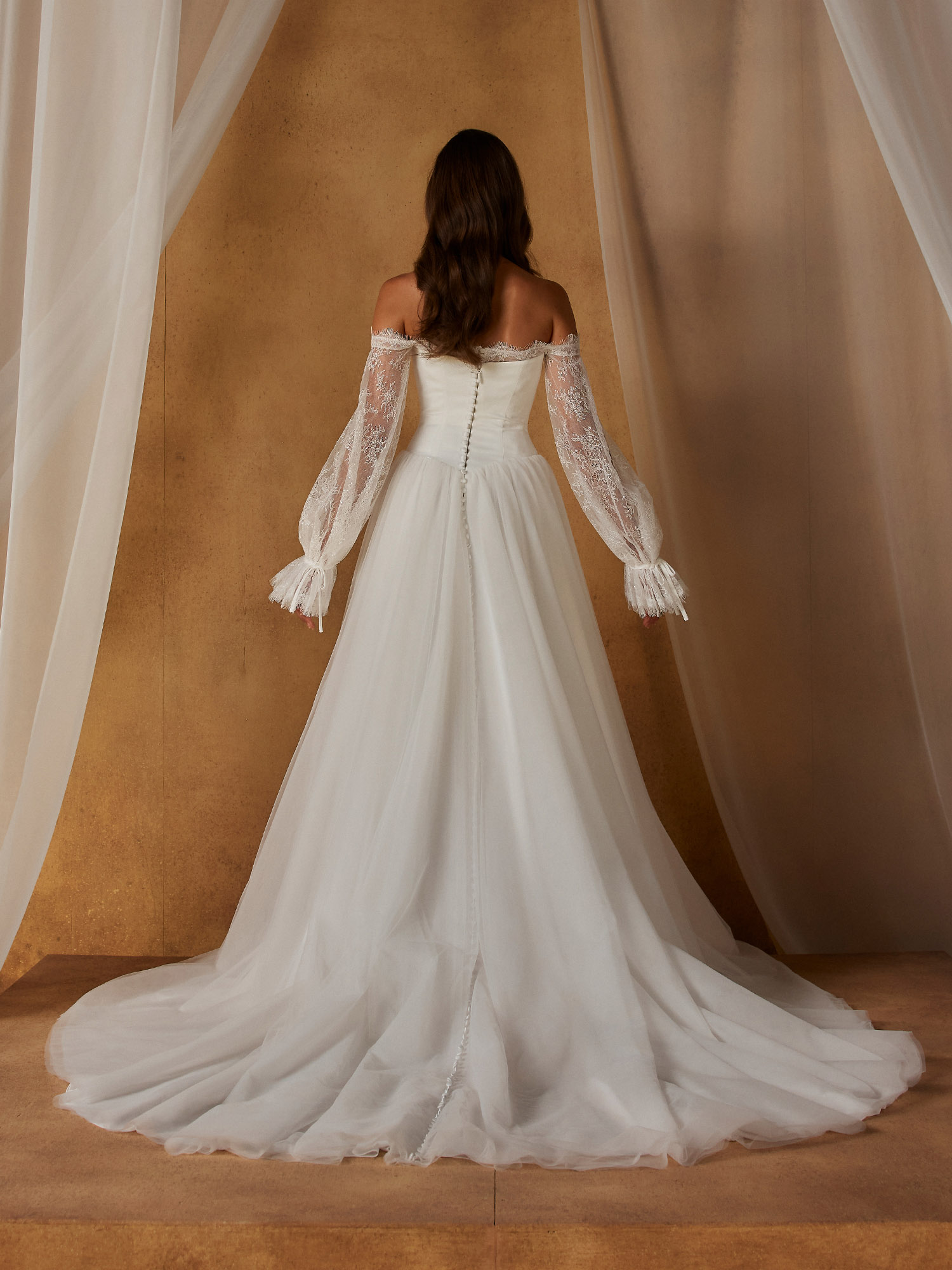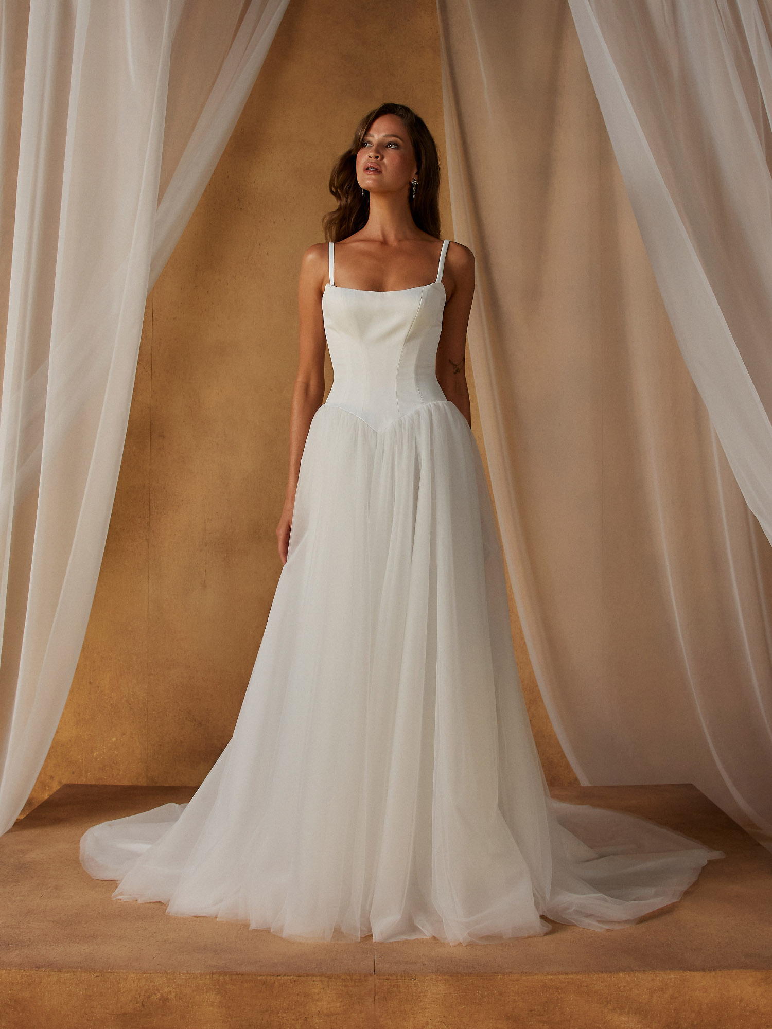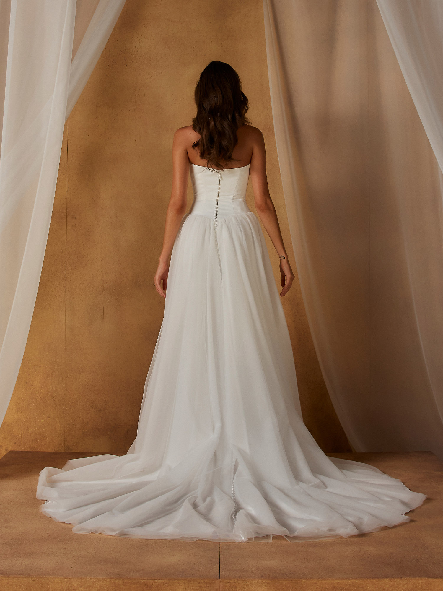 The airy, tulle, A-line skirt falls gracefully, lending the design it’s whimsical nature. Gathered at the waist for added volume and delicate movement throughout the layers. Kept light with a plain hem that continues around the edge of the train. Making the dress appear to be softly floating around the bride.