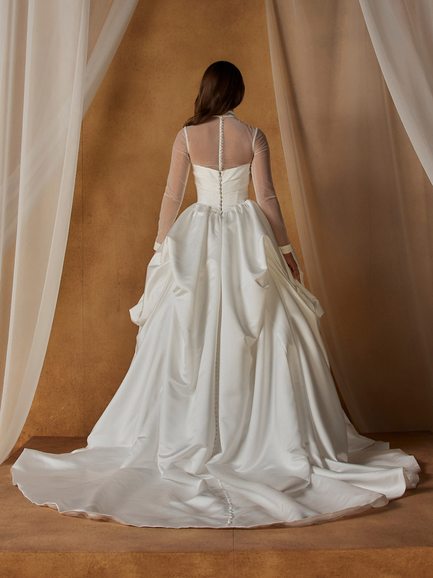 For added versatility, our Norfolk wedding dress includes the Norfolk Jacket, sheer with a high neckline and tailored satin cuffs. This detachable jacket offers two distinct bridal looks, allowing brides to embrace tradition or modern minimalism.