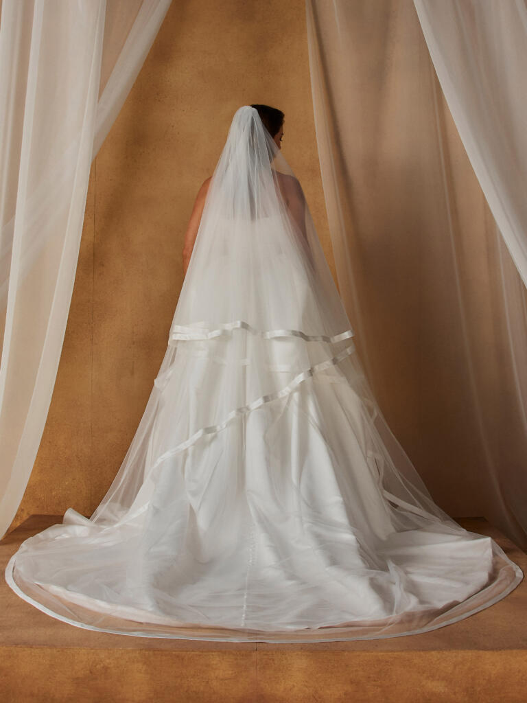 Completing the ensemble, the Norfolk Veil echoes the satin simplicity, offering the perfect finishing touch to this striking wedding dress.