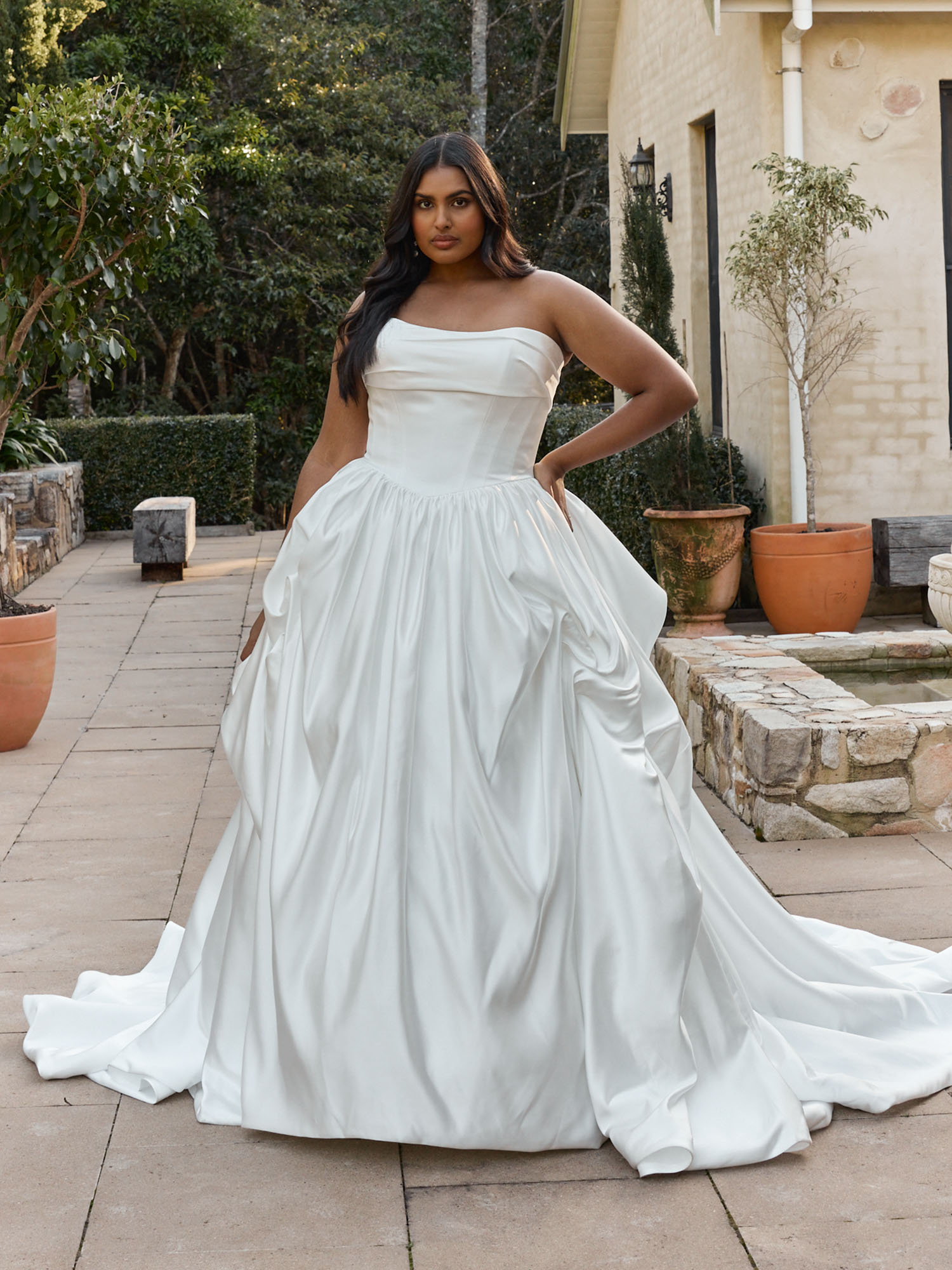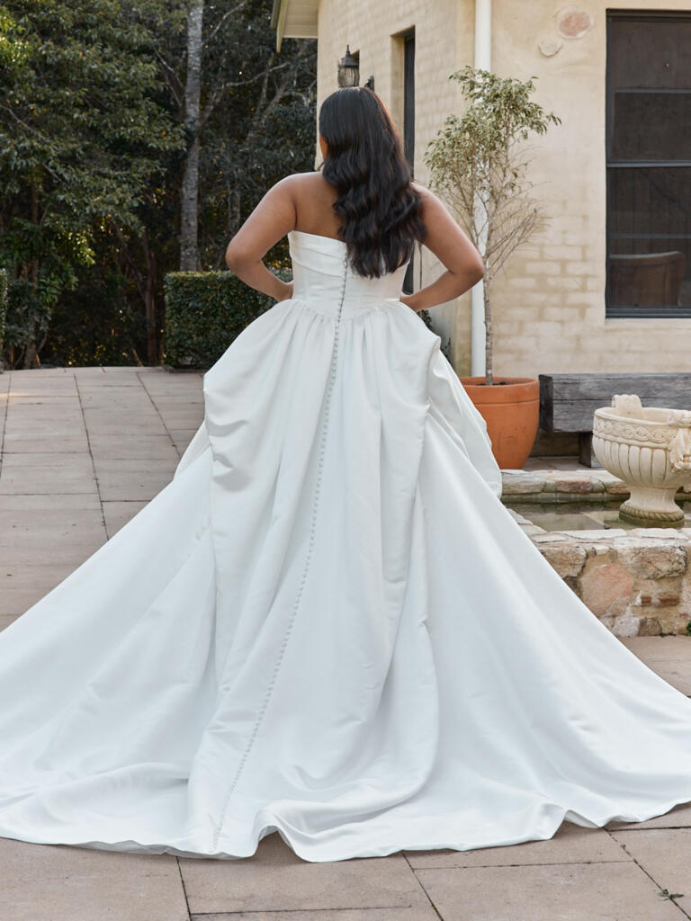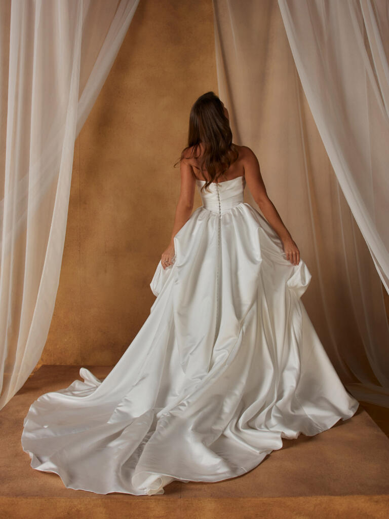 This strapless wedding dress features draped satin detail across the bust, flowing into curved seamlines that define and sculpt the waist. The Basque waist enhances the feminine silhouette, balancing structure with softness, while keeping the overall design modern and flattering.