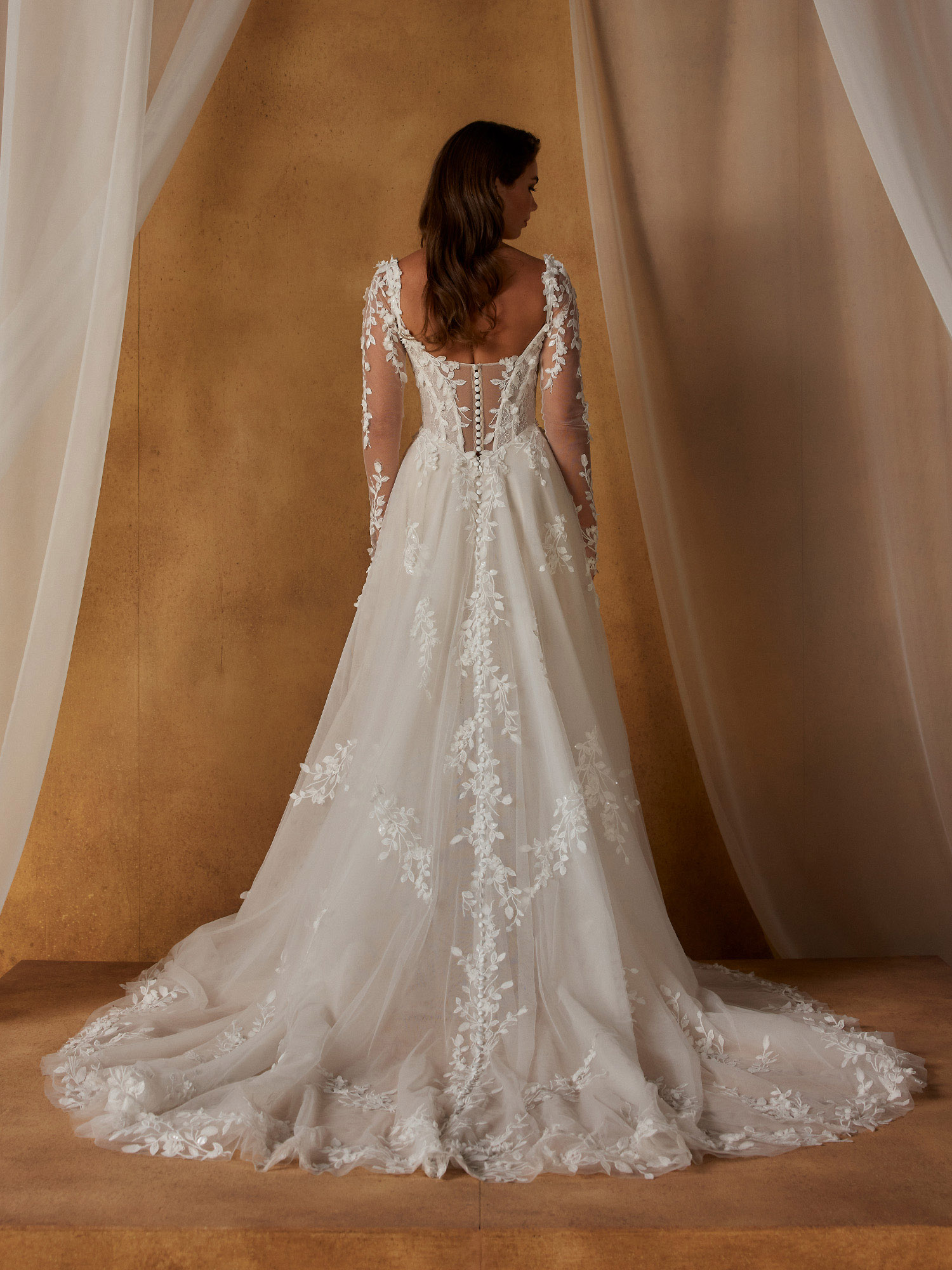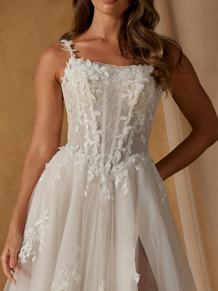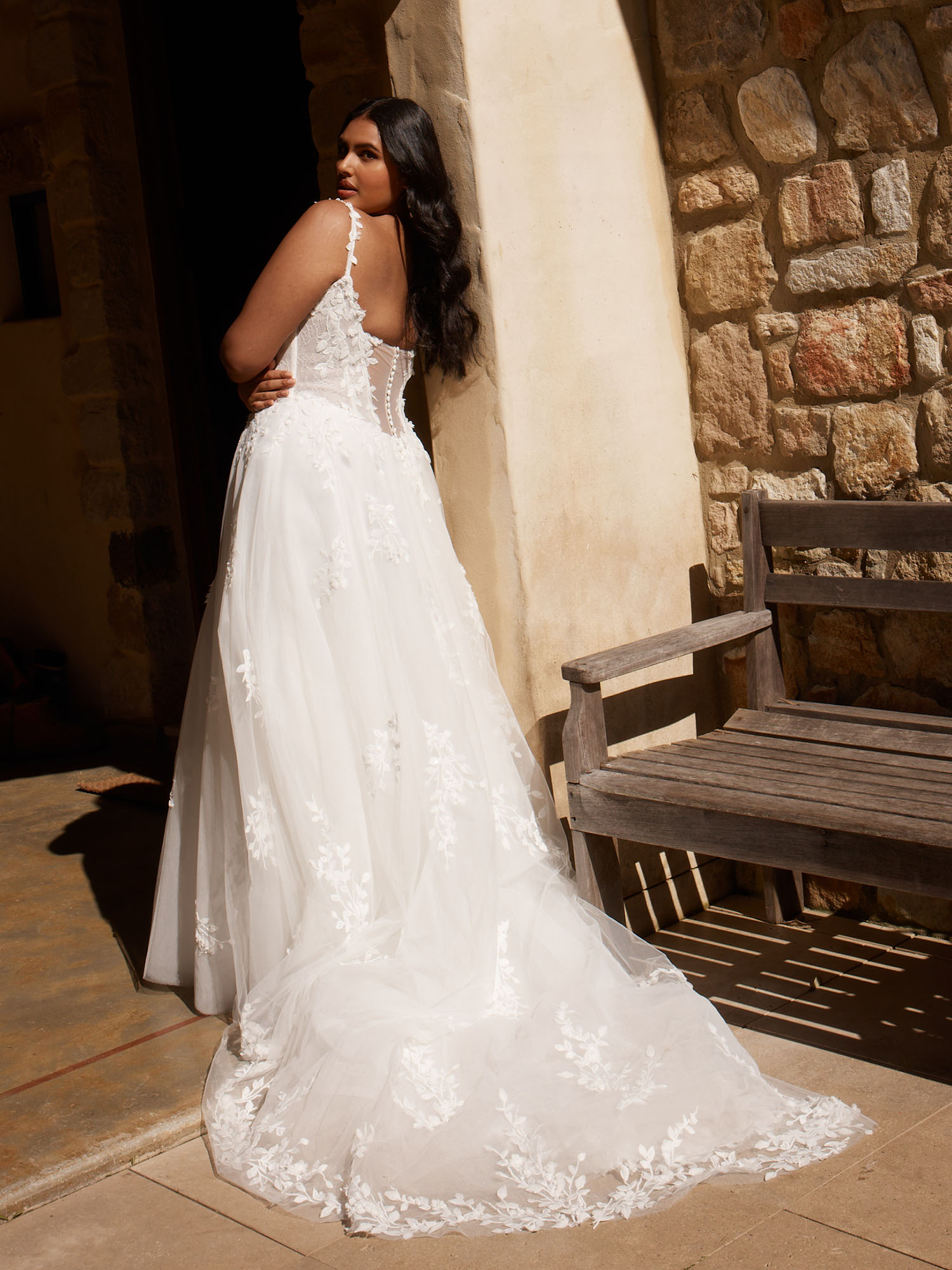 Exposed boning peaks through the illusion lace across the bodice to shape and contour the waist. 3D motifs scattered across and concentrating around the Basque waist, trickling into the flowing A-line skirt. To the back, the bodice is cut in straight with a nude illusion panel for a modern touch.