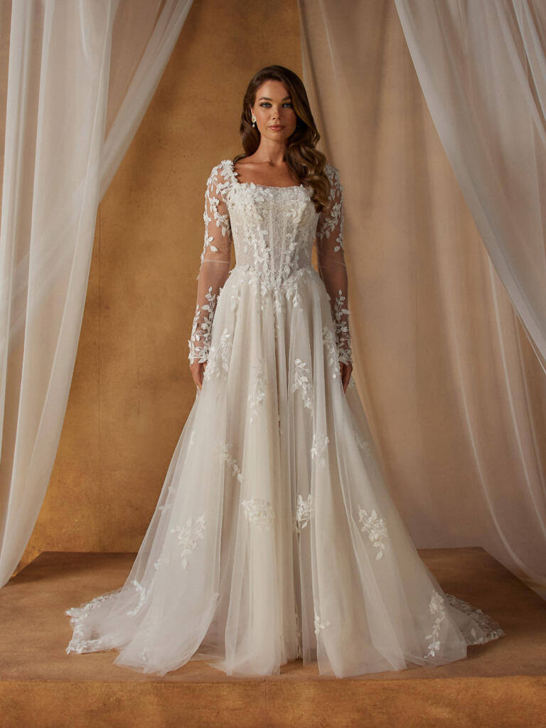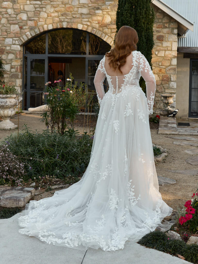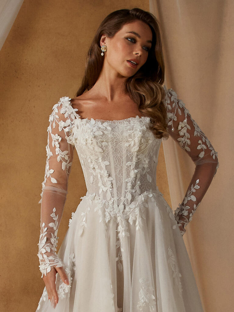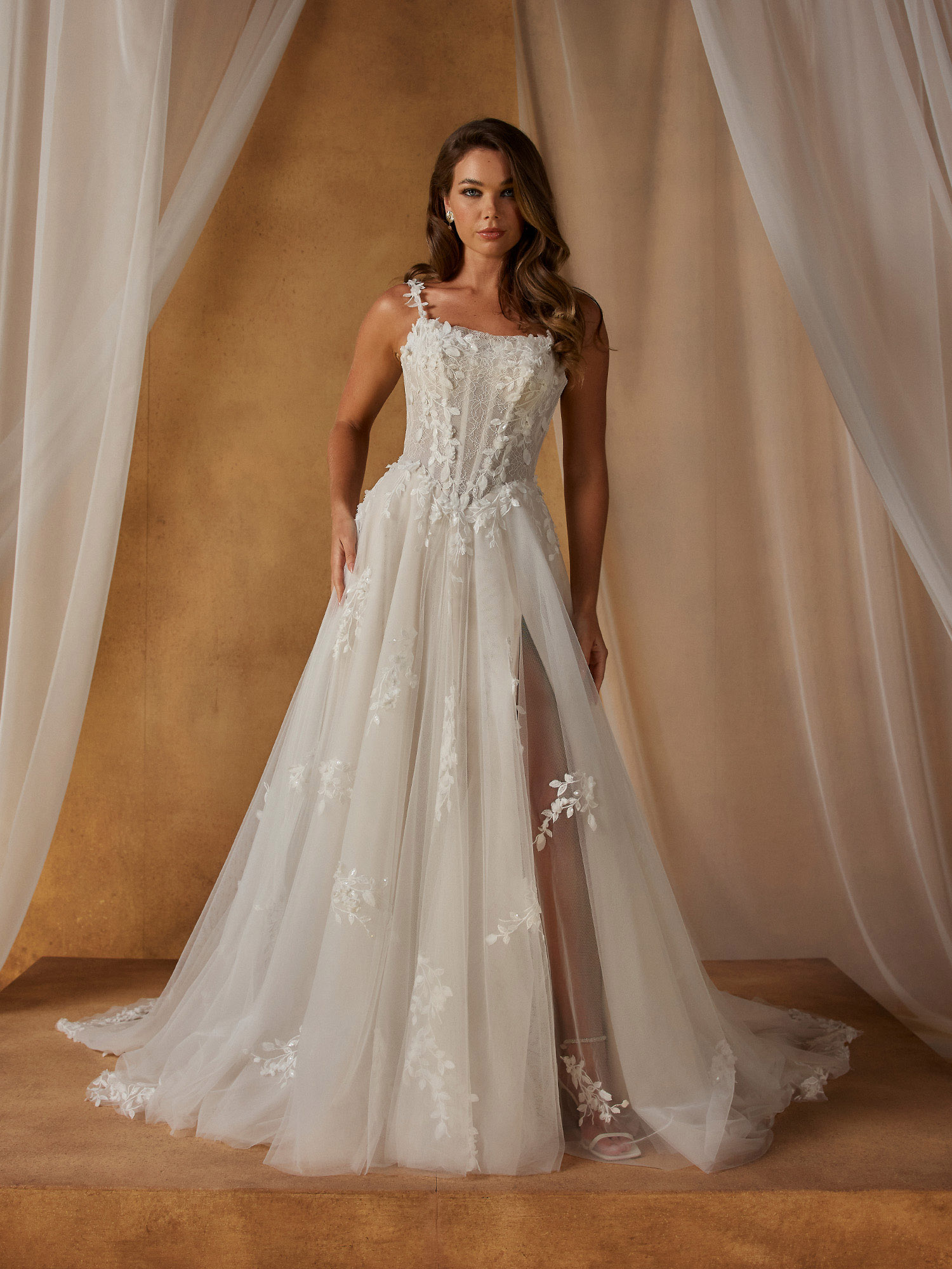 Exposed boning peaks through the illusion lace across the bodice to shape and contour the waist. 3D motifs scattered across and concentrating around the Basque waist, trickling into the flowing A-line skirt. To the back, the bodice is cut in straight with a nude illusion panel for a modern touch.