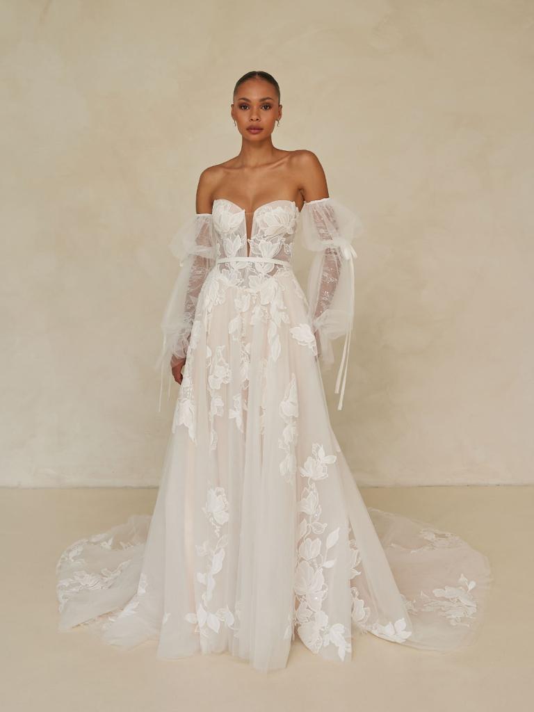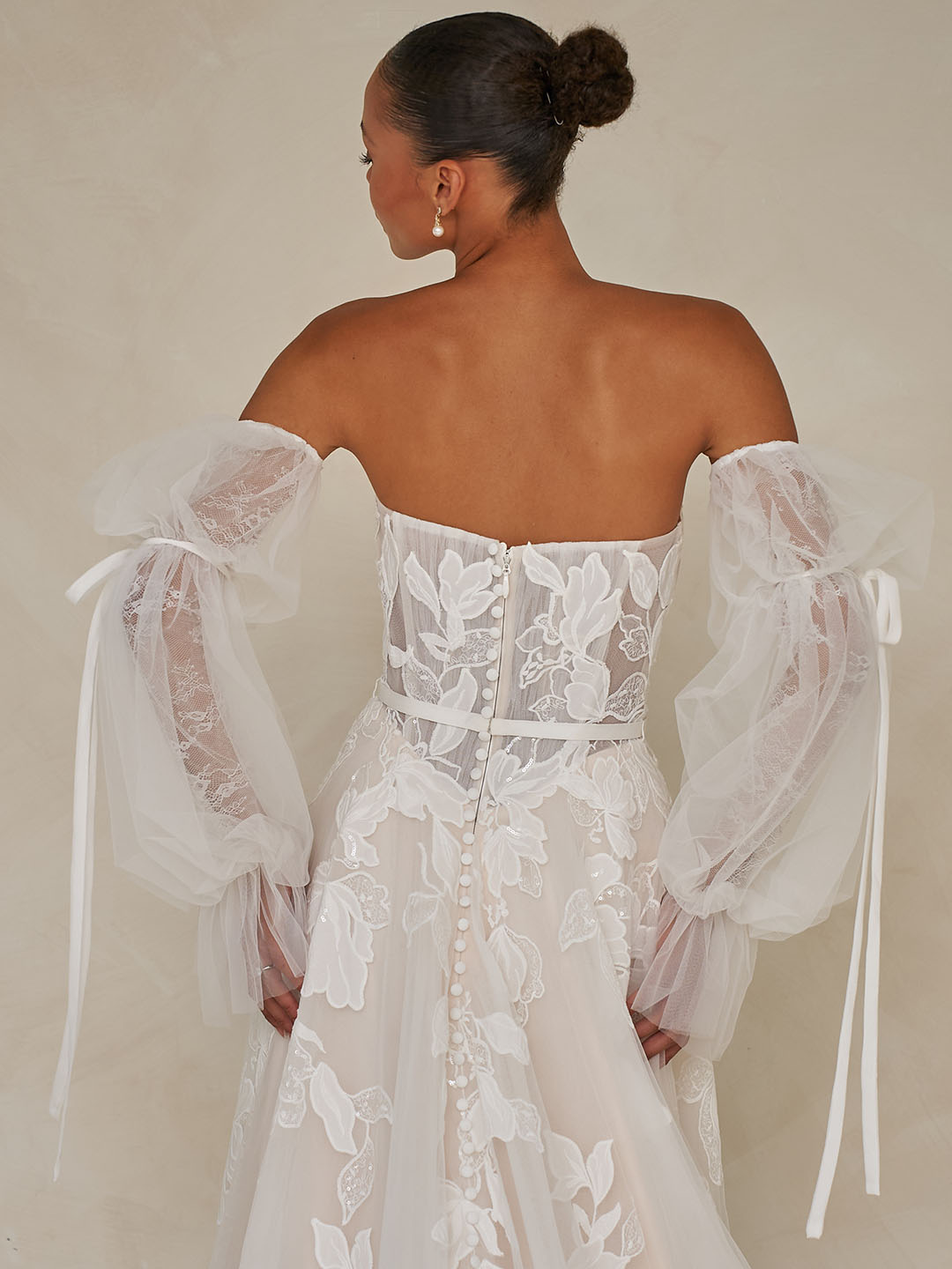 Completing the look, detachable blouson sleeves with delicate ribbon ties add extra softness and provide for multiple looks in the one, beautiful wedding gown.