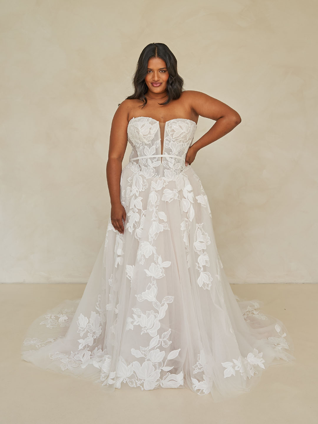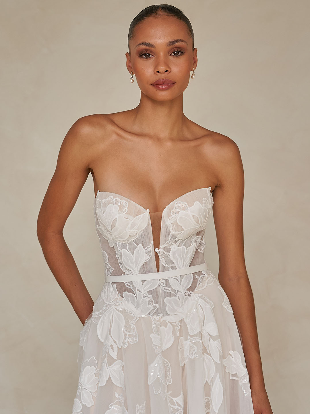 A contemporary Basque waistline cinches the figure, accentuated by softly angled tulle pleats and an optional detachable lace belt that together sculpt an elegant hourglass shape.