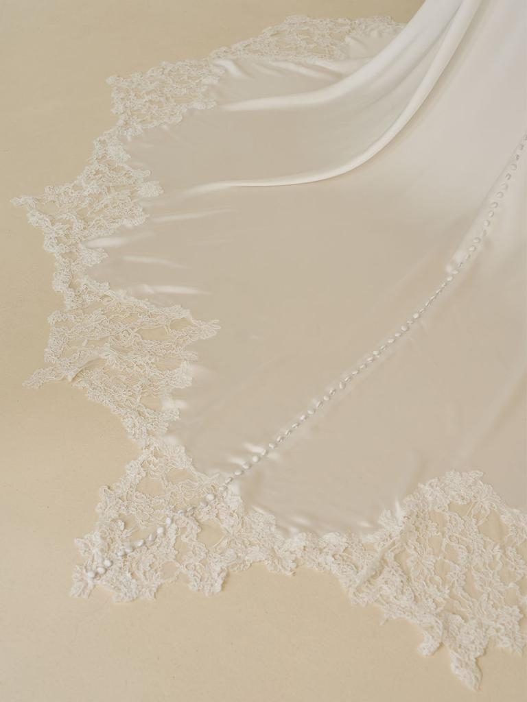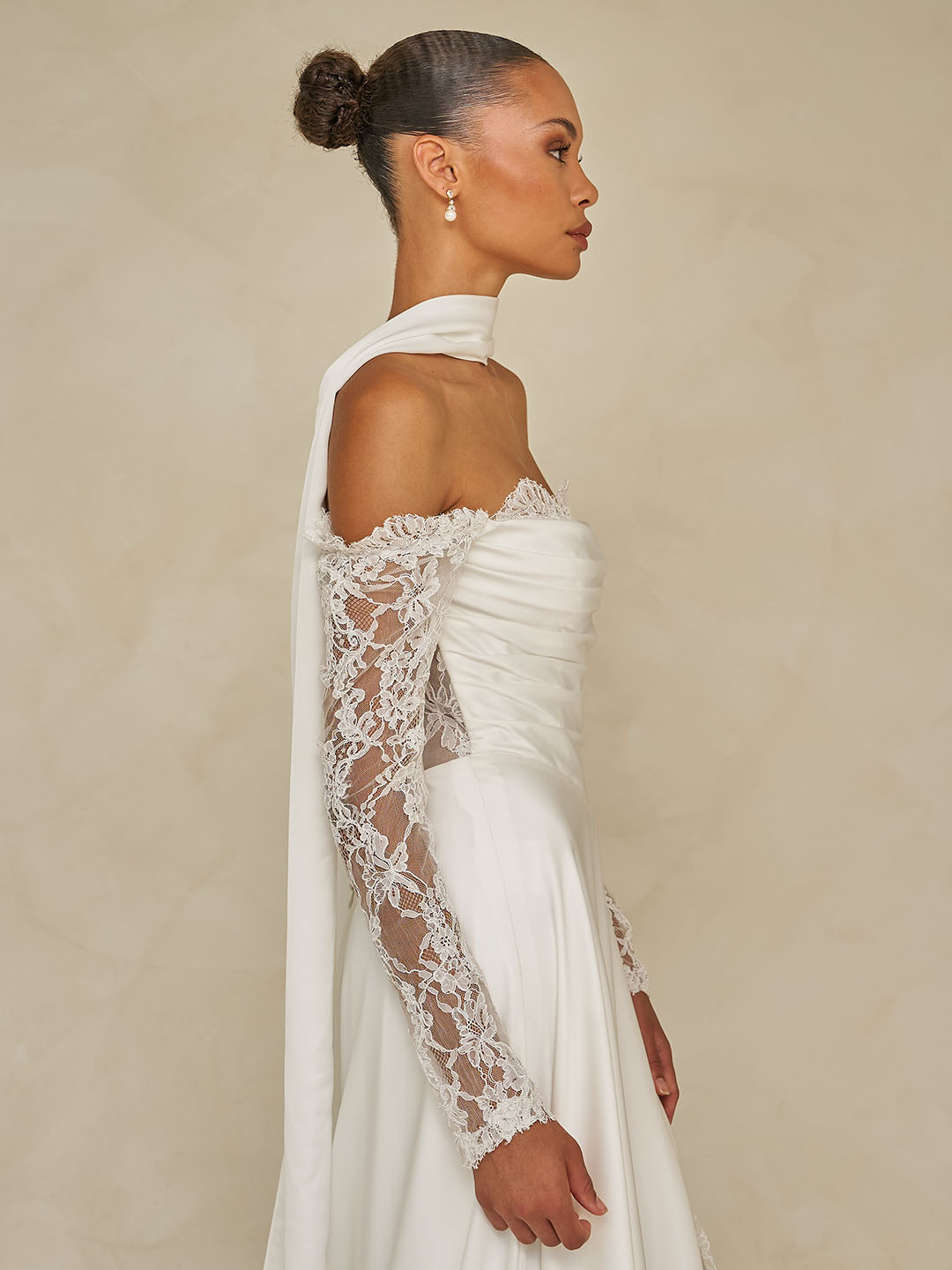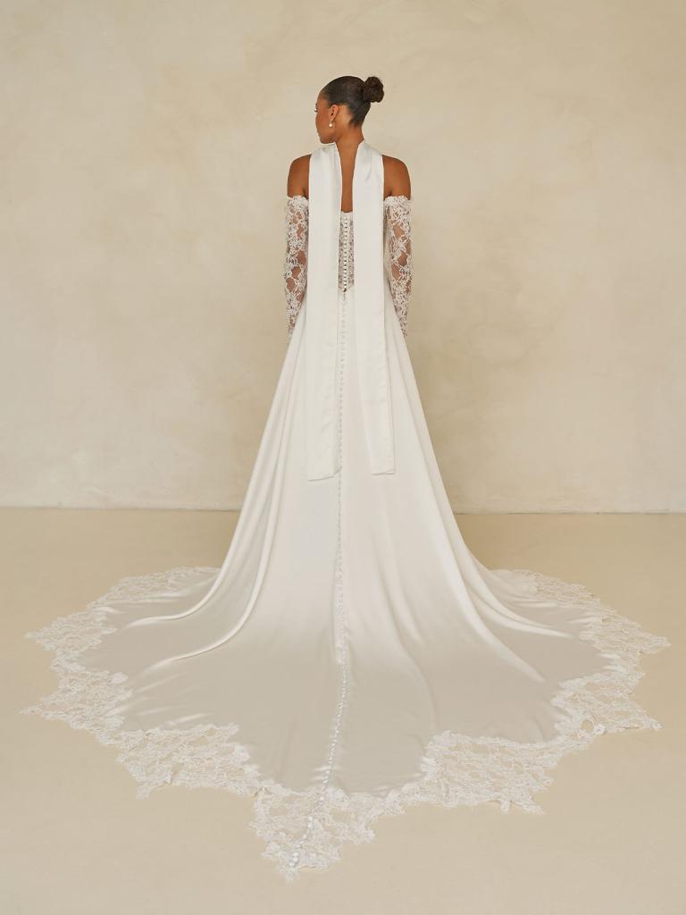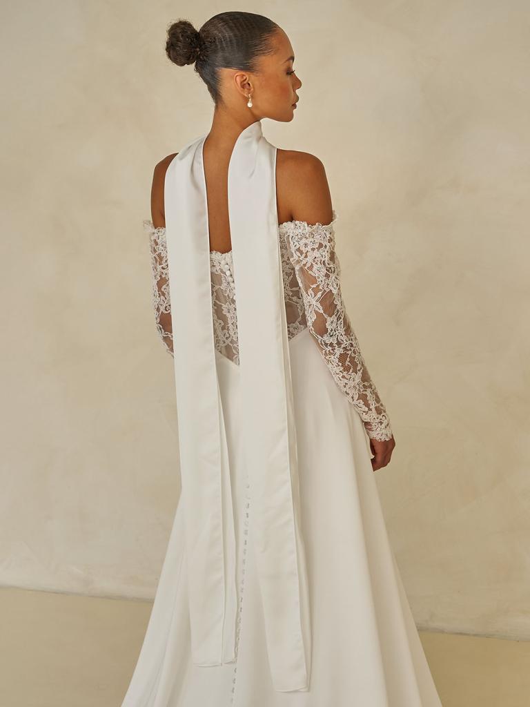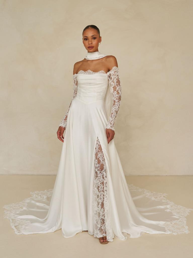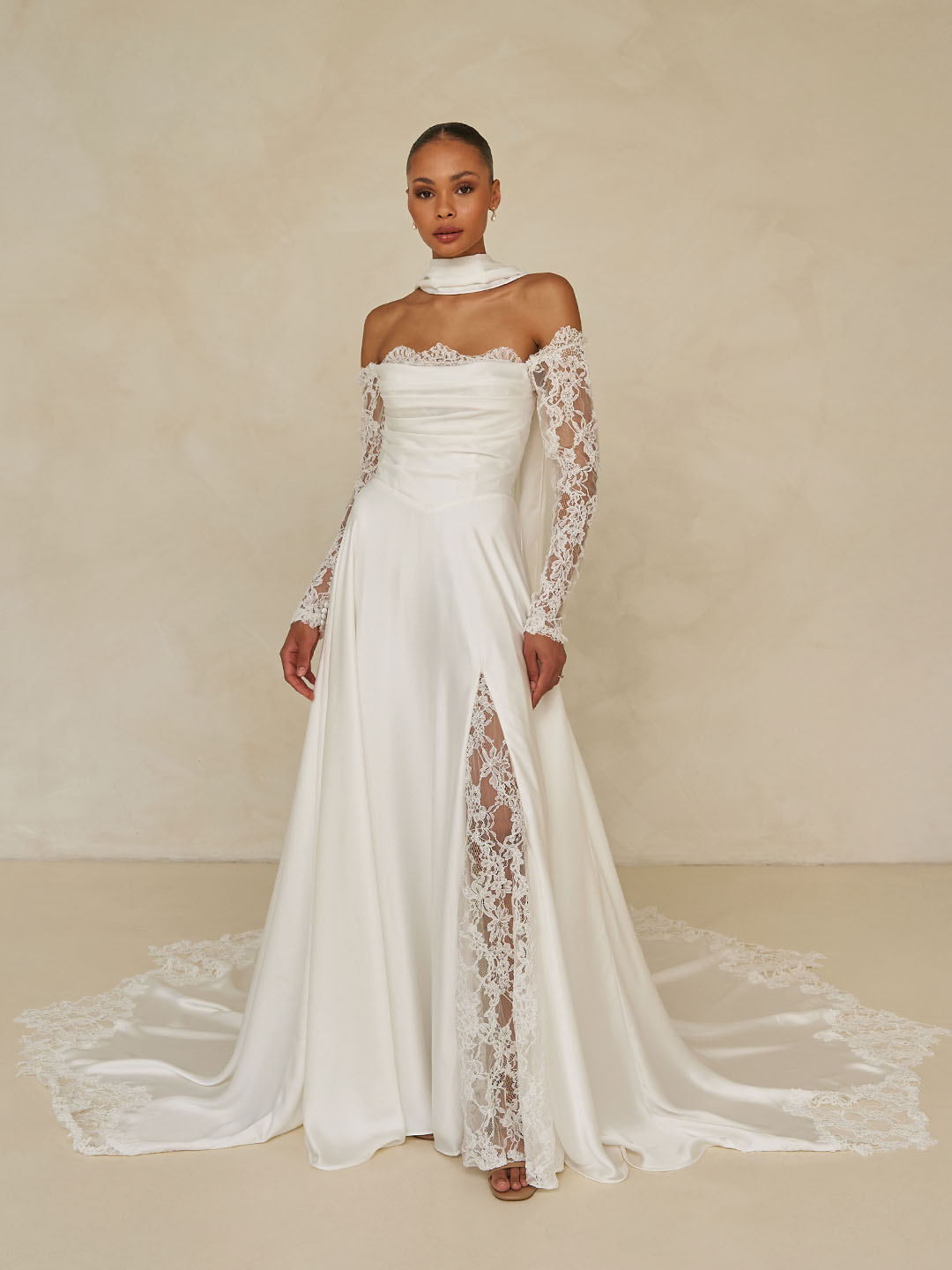 Effortlessly chic and endlessly romantic, the Ward wedding gown melds sleek minimalism with couture-inspired detail. Its slinky satin skirt drapes fluidly, parting at a thigh-high slit to reveal an unexpected whisper of traditional Chantilly lace.