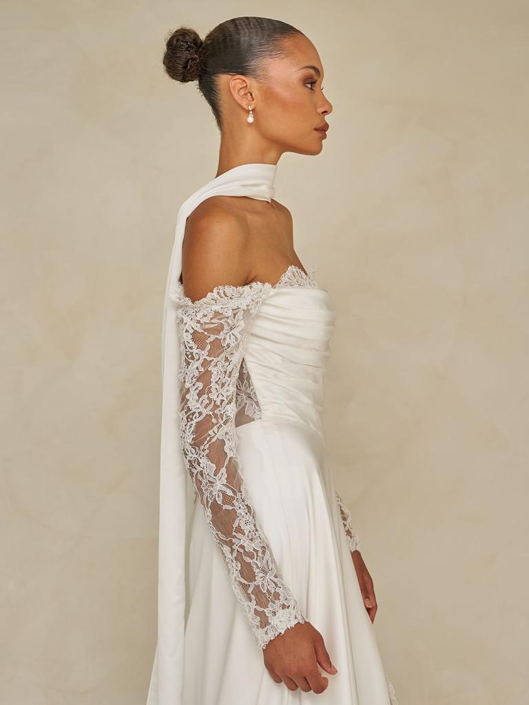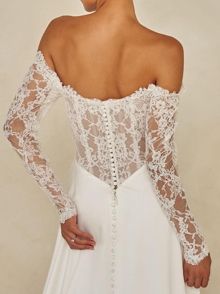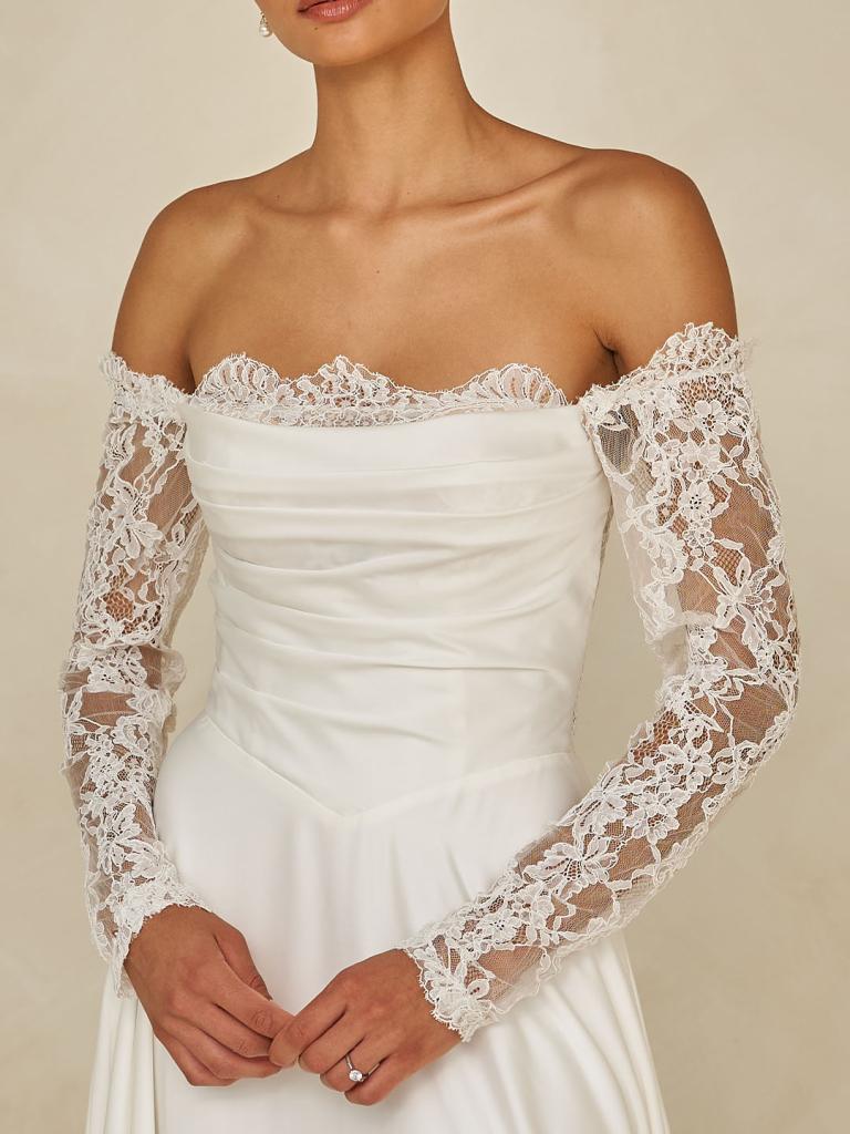 A modern square, off-the-shoulder neckline flows into a softly draped bodice edged with delicate lace trim.
