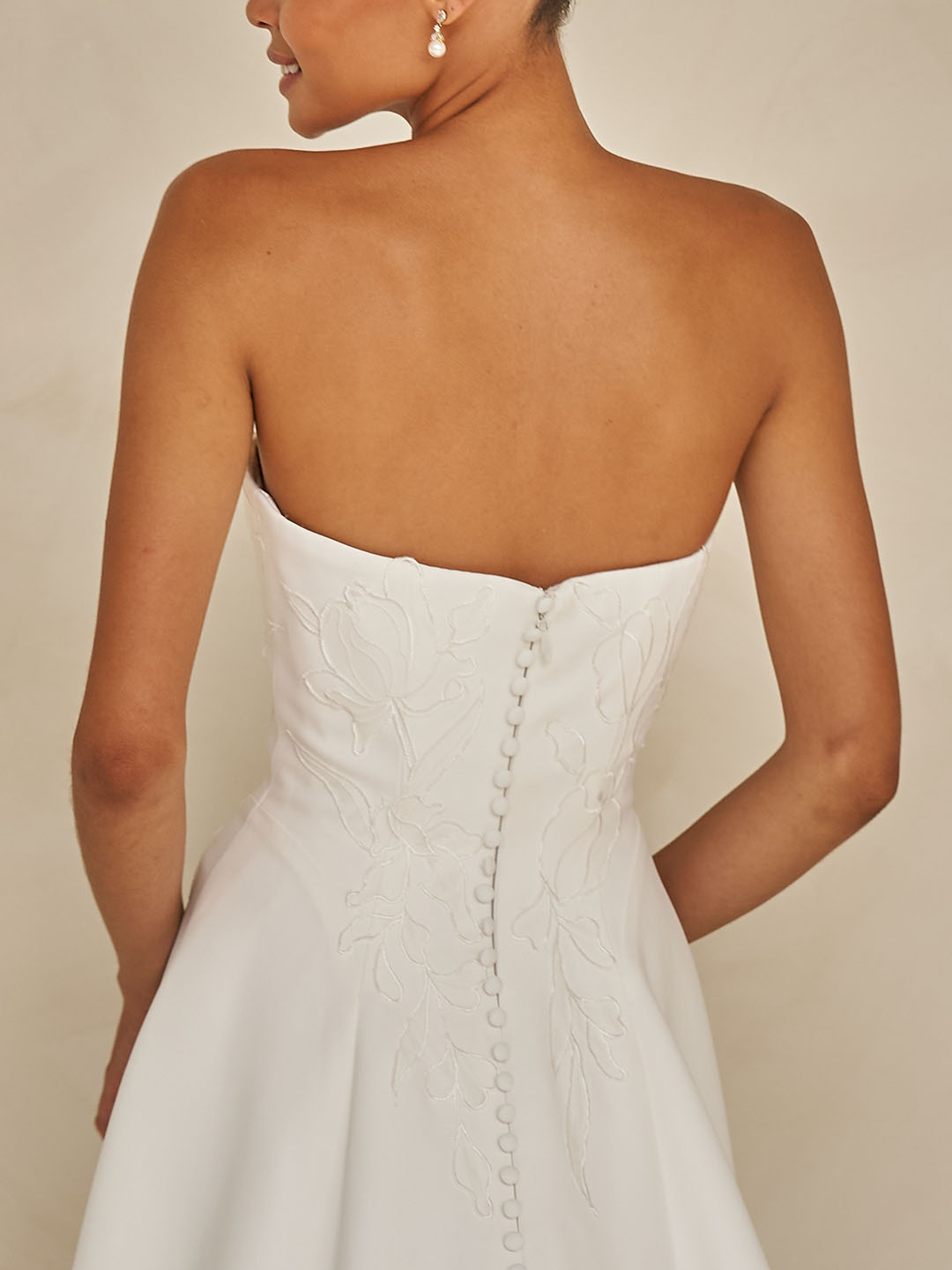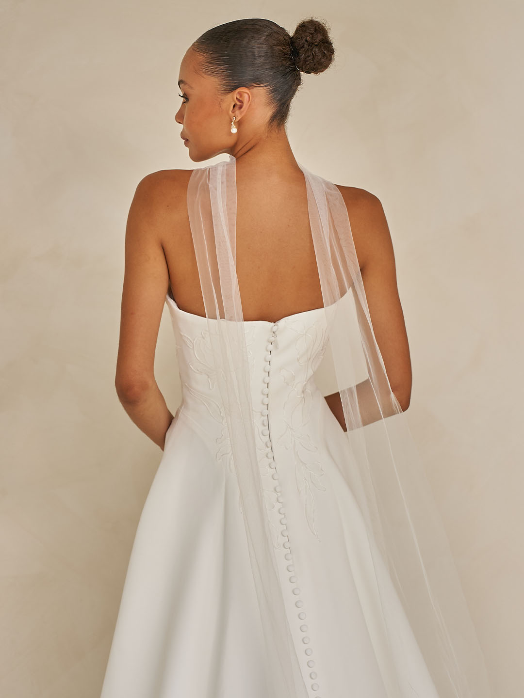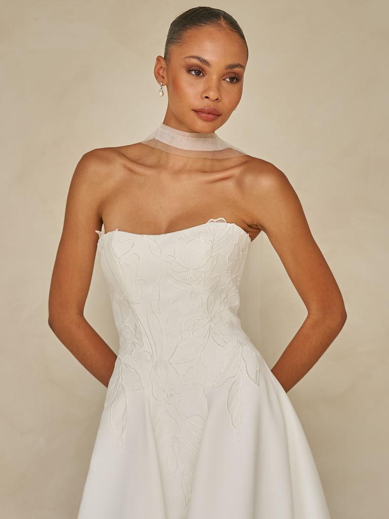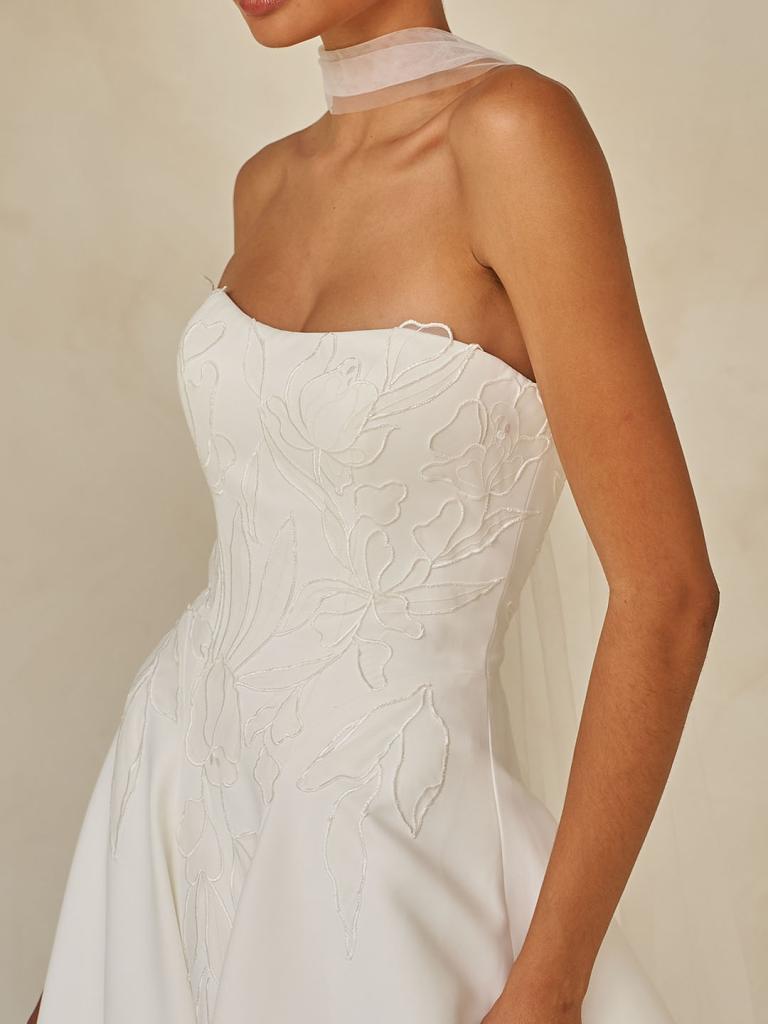 The strapless neckline adds a fresh, feminine touch, perfectly complemented by the detachable tulle neck scarf. A delicate detail that elevates the look while preserving its understated sophistication.