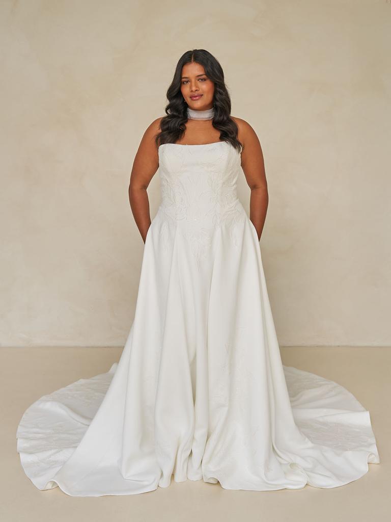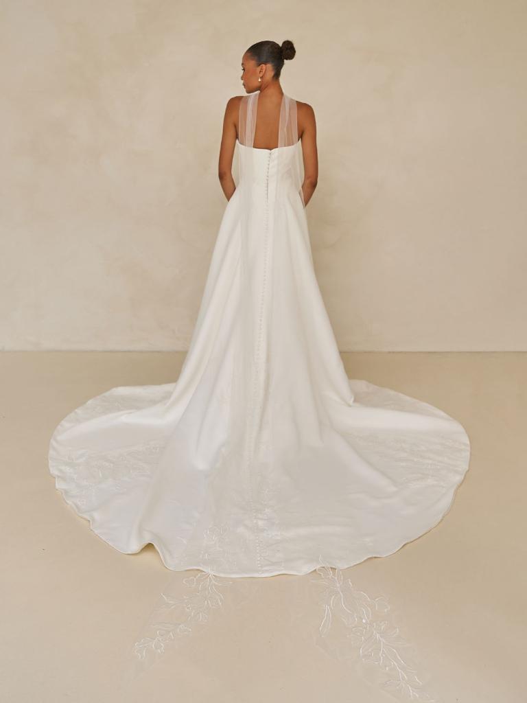 Timeless and refined, the Wendall wedding gown is designed for the minimalist bride who seeks elegance in every detail. Crafted from soft, velvet-finish satin, Wendall’s clean lines and structured drop-waist silhouette. Creating a beautifully elongated shape that flows effortlessly into a graceful A-line skirt.