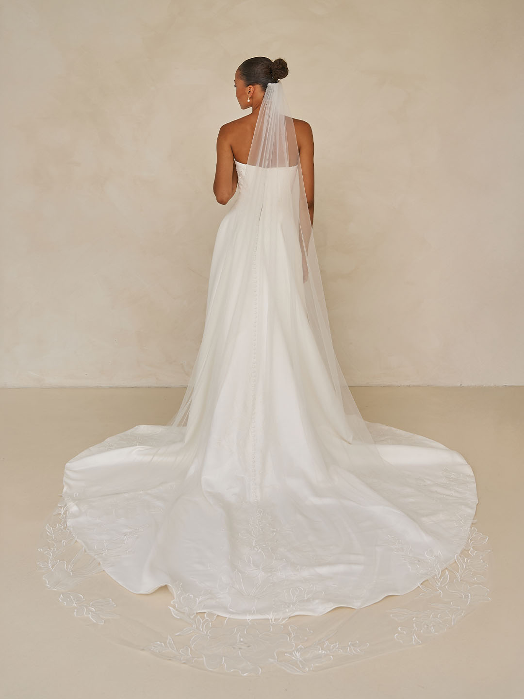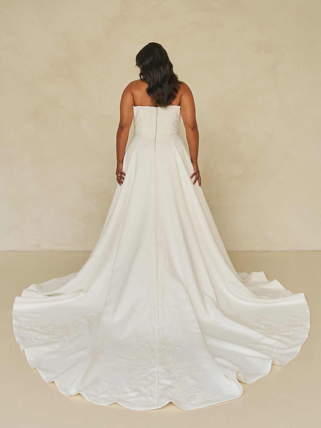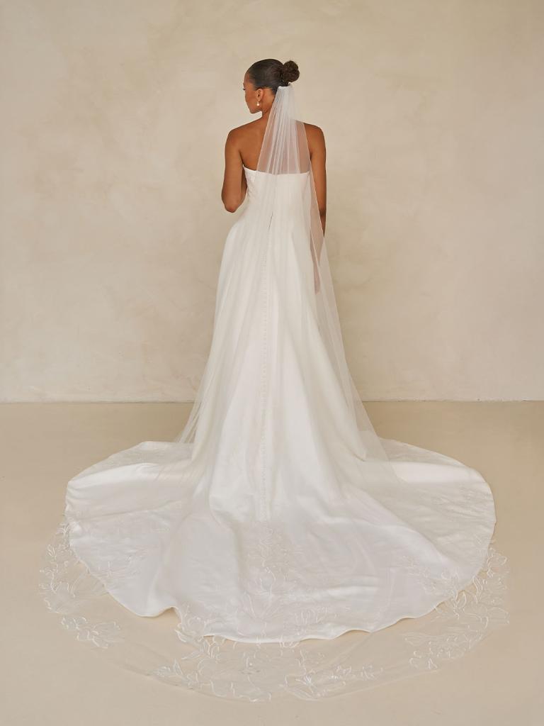 Adding a subtle, striking statement, oversized botanical lace appliqués cascade down the skirt and through the length of the train. The abstract nature of the lace brings a contemporary edge to the gown’s classic foundation, blending tradition with modern artistry.