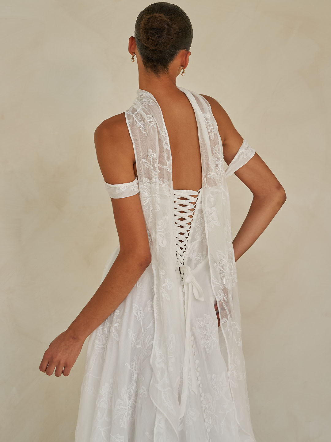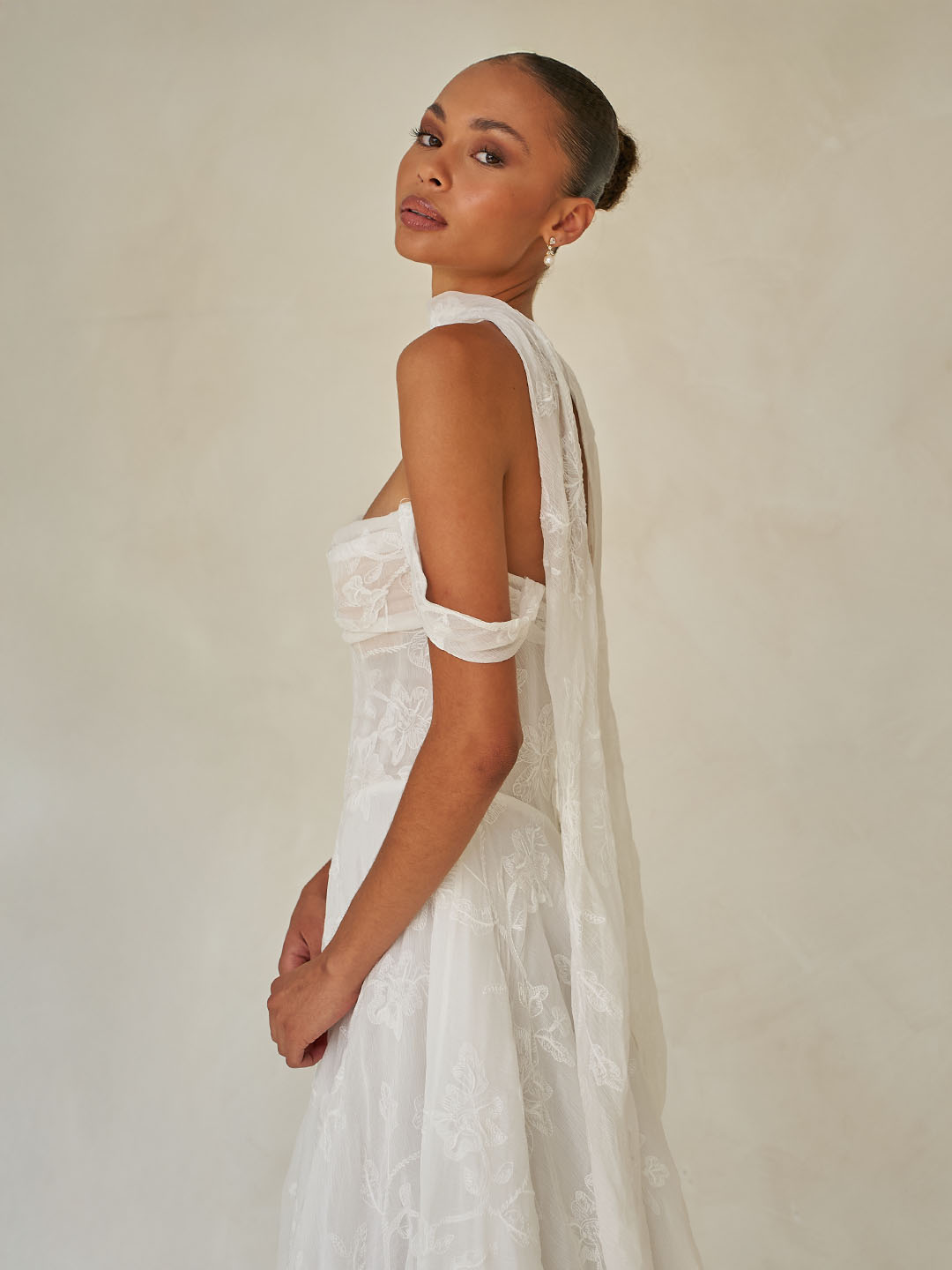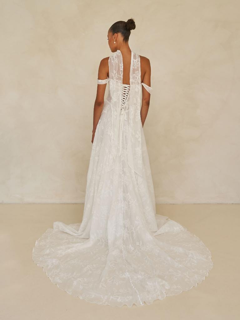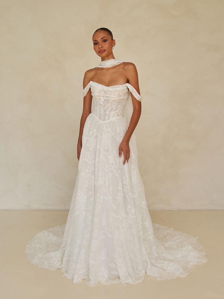 Wilder comes complete with a matching neck scarf—an effortlessly chic accessory that elevates the entire look. This delicate addition adds a touch of refined sophistication and ties the romantic, modern aesthetic together with quiet elegance. It’s the perfect finishing detail for the bride who appreciates subtle, unforgettable style.
