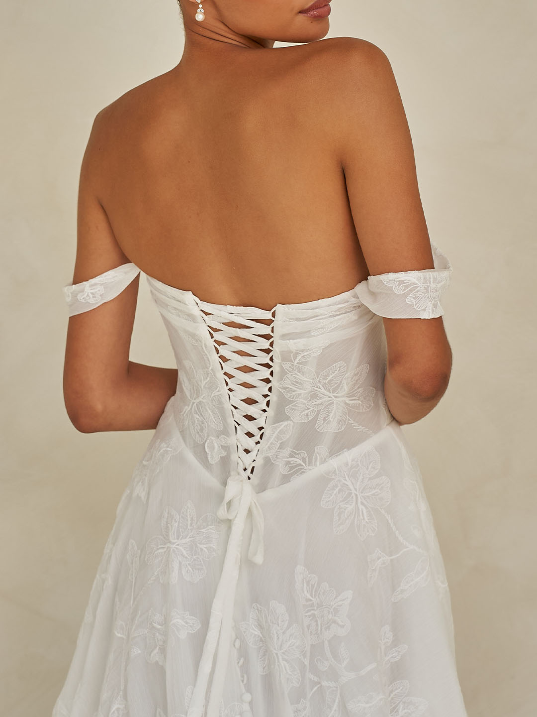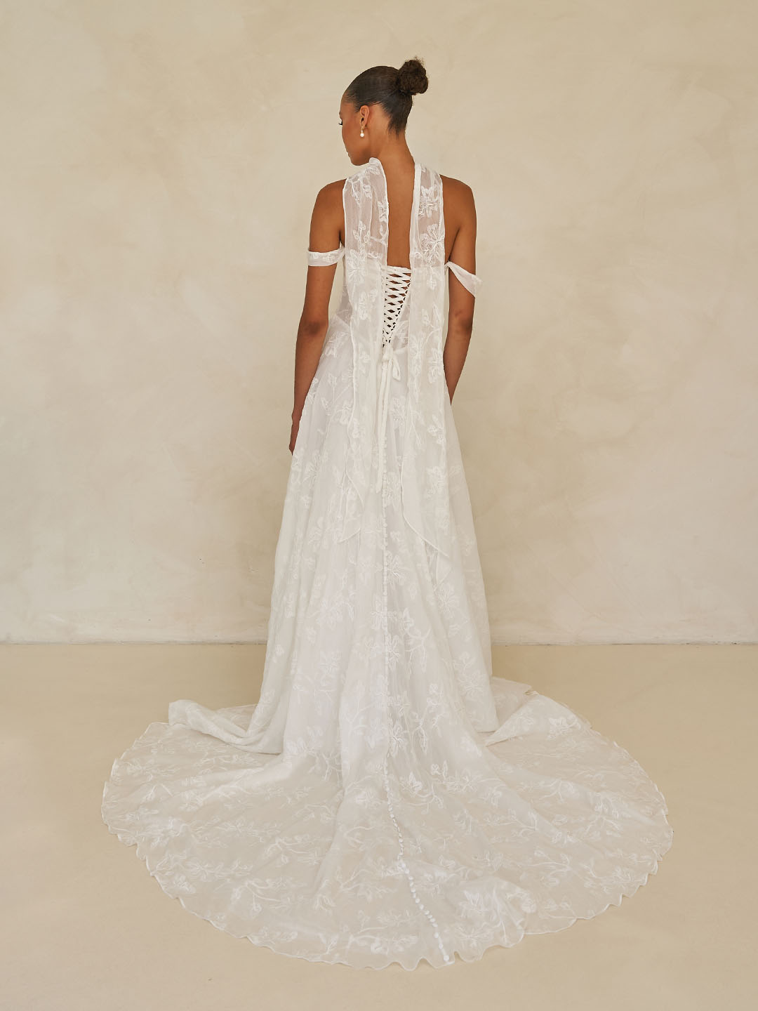 At the back, a romantic corset lace-up detail adds a touch of allure. Finished with a trail of covered buttons that cascade from skirt to train. Creating a beautiful sense of continuity and grace.