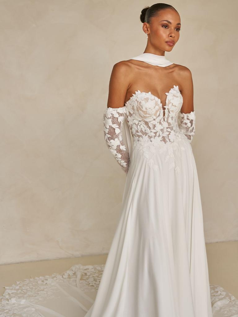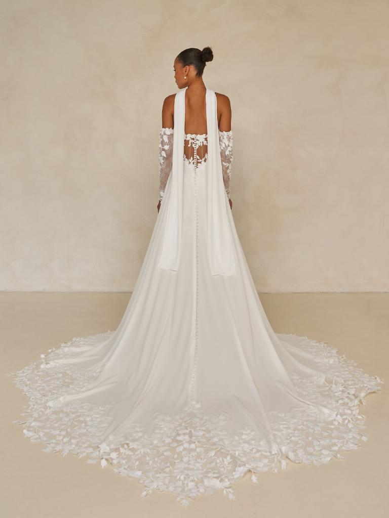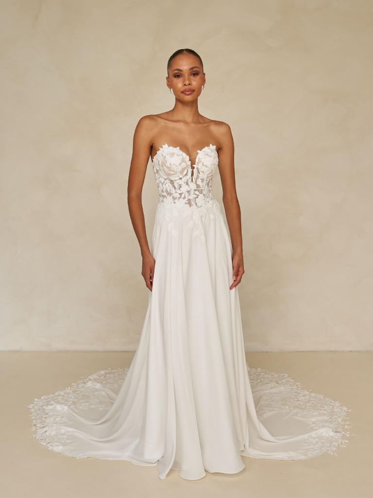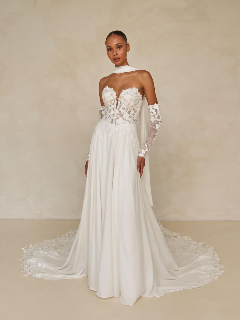 A timeless silhouette reimagined for today’s bride—light, expressive, and beautifully composed.