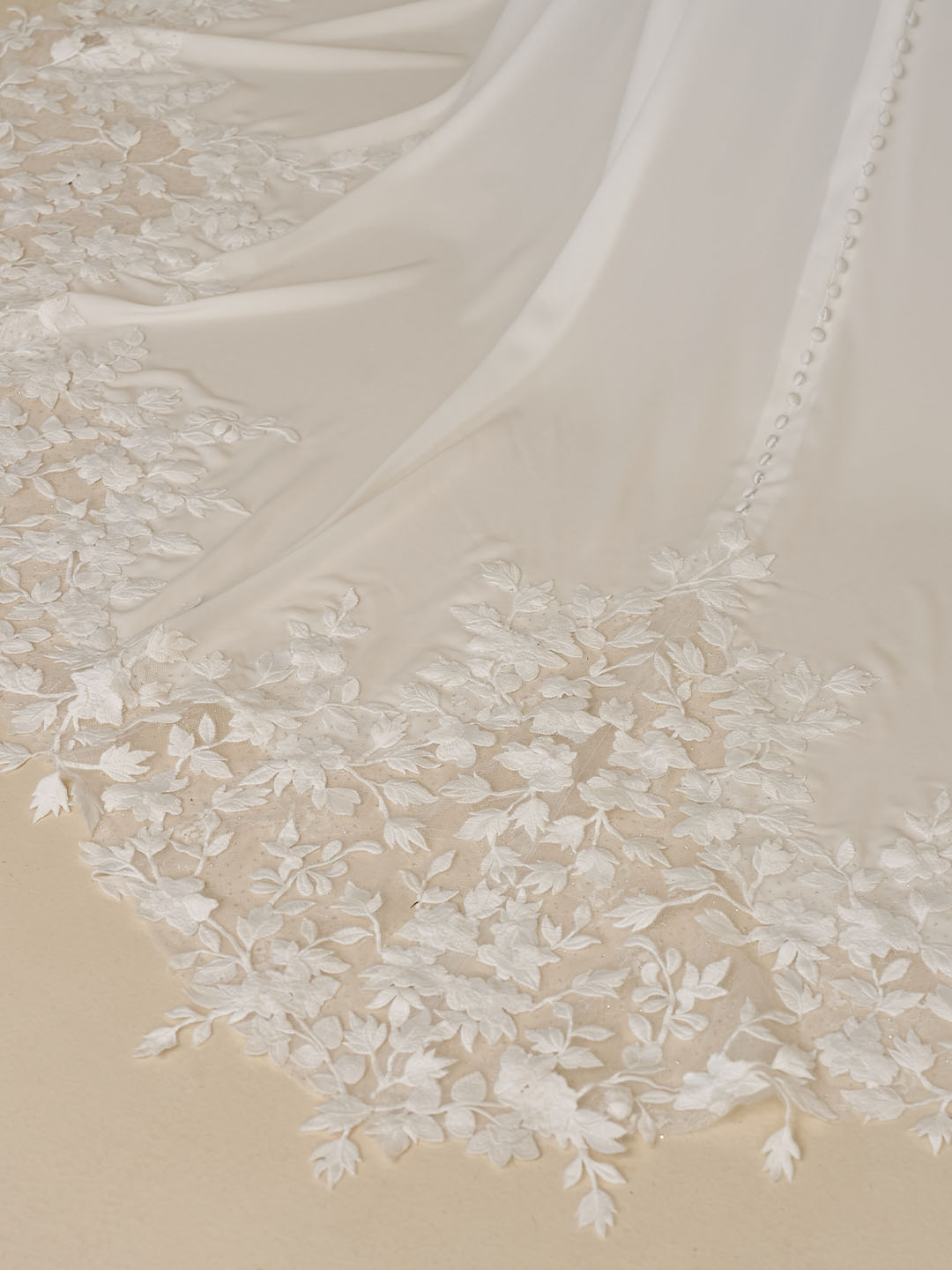 An illusion back adds a subtle touch of allure, giving way to a flowing chiffon skirt. Pooling into a lace-trimmed train, an effortless harmony of texture and movement.